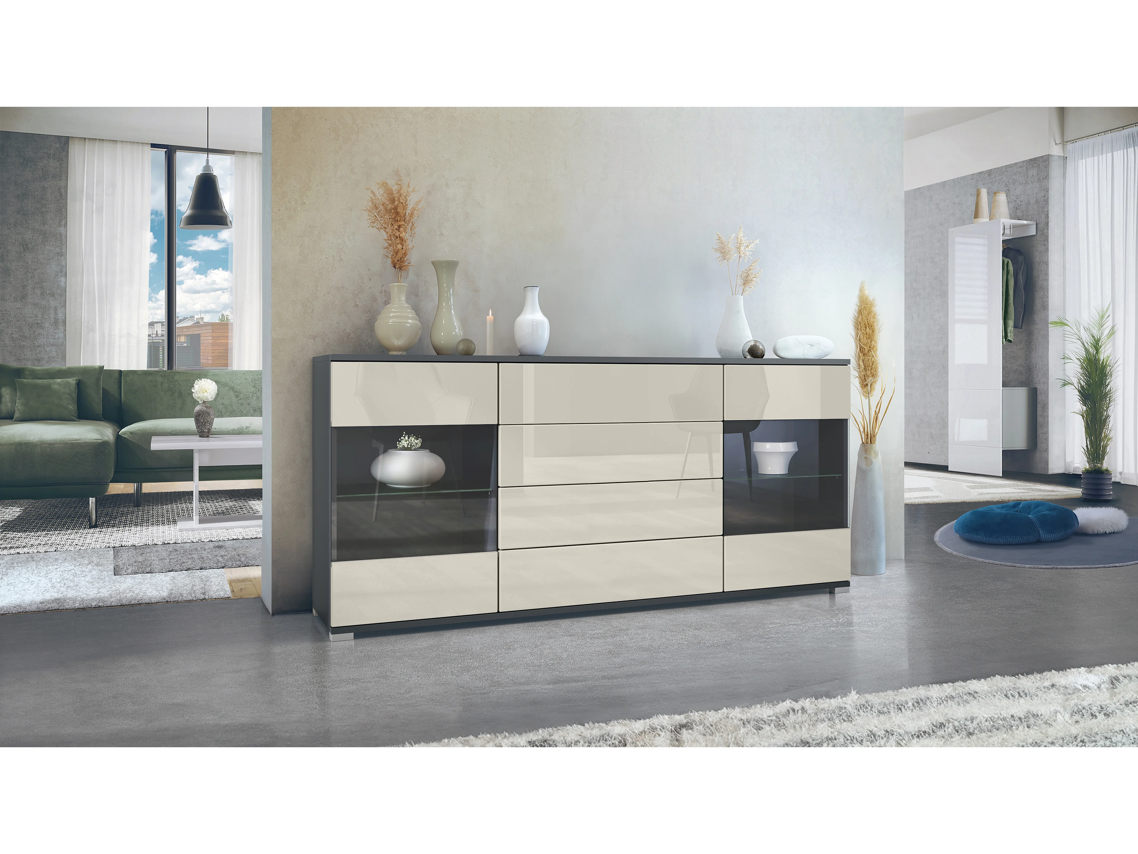 Buffet Bari V2 – Meuble avec 2 Grandes Portes et 4 Tiroirs, anthracite mat/crème haute brillance (166,5 x 75,5 x 35)