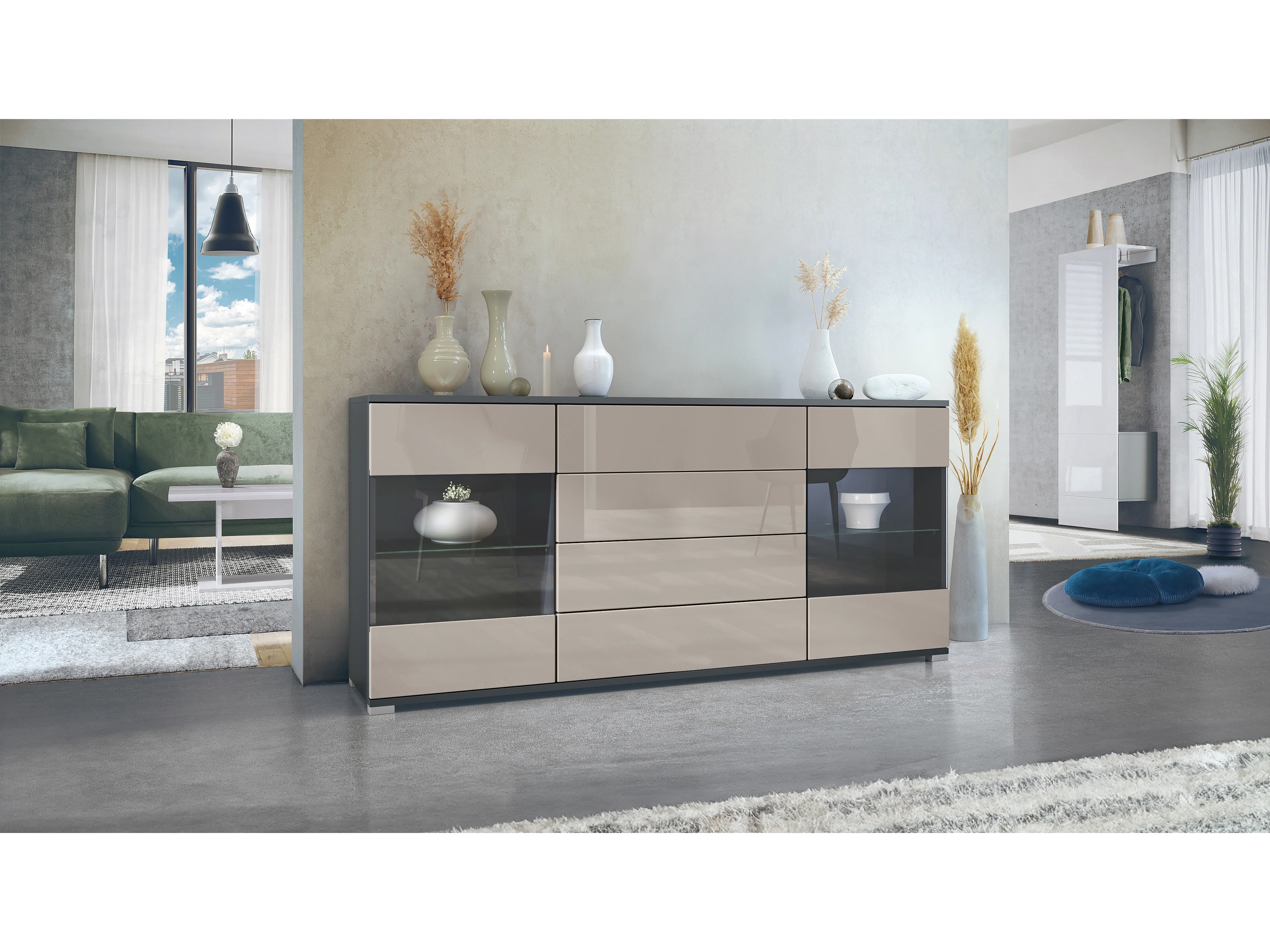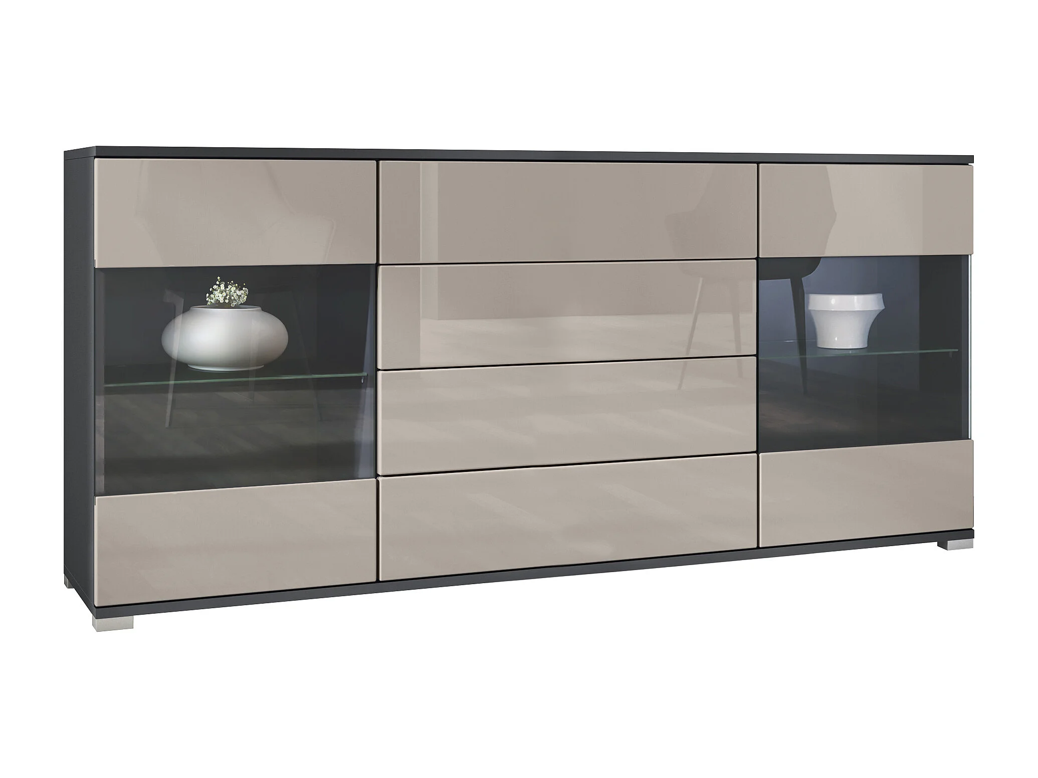 Buffet Bari V2 – Meuble avec 2 Grandes Portes et 4 Tiroirs, anthracite mat/gris sable haute brillance (166,5 x 75,5 x 35)