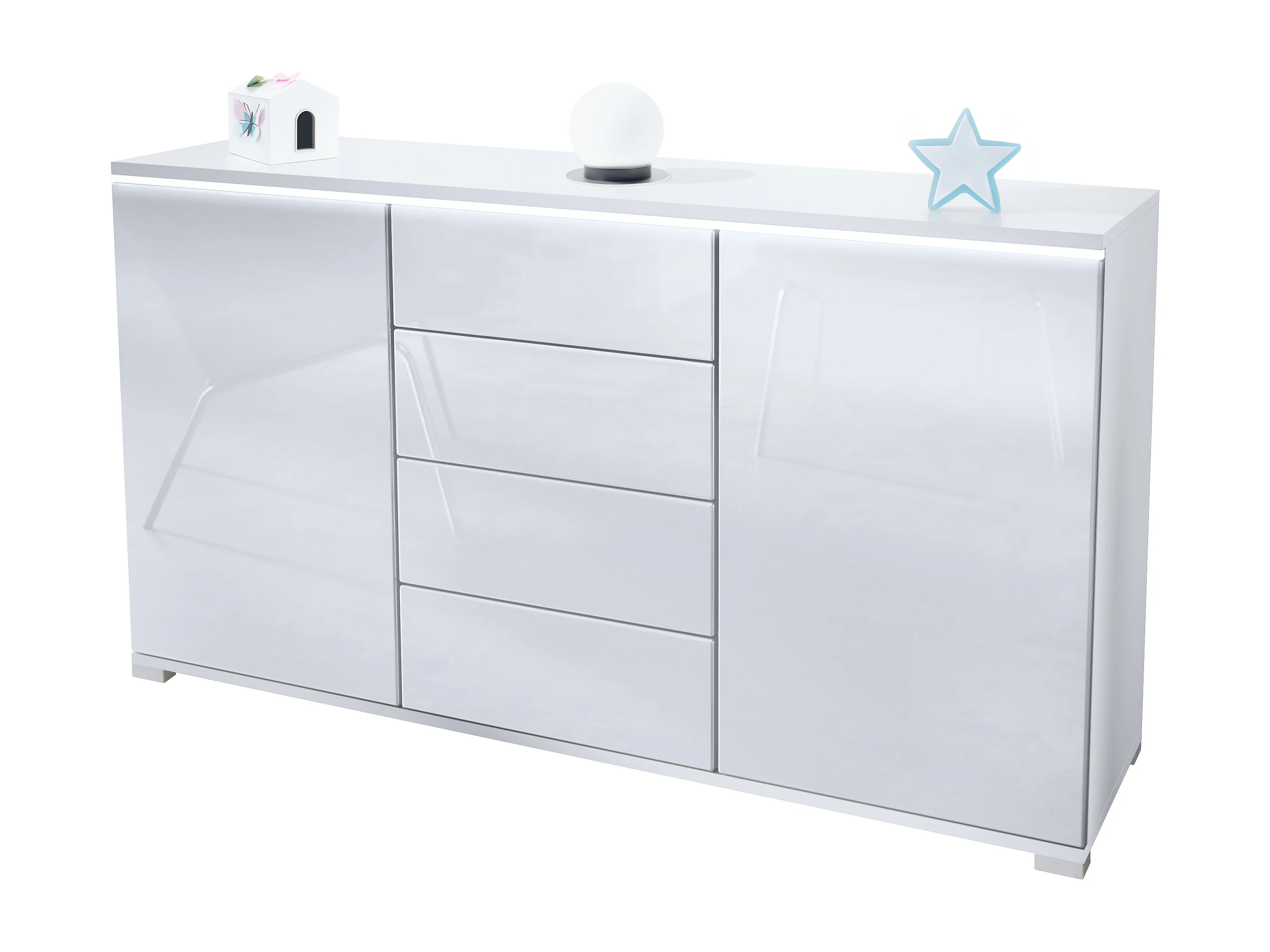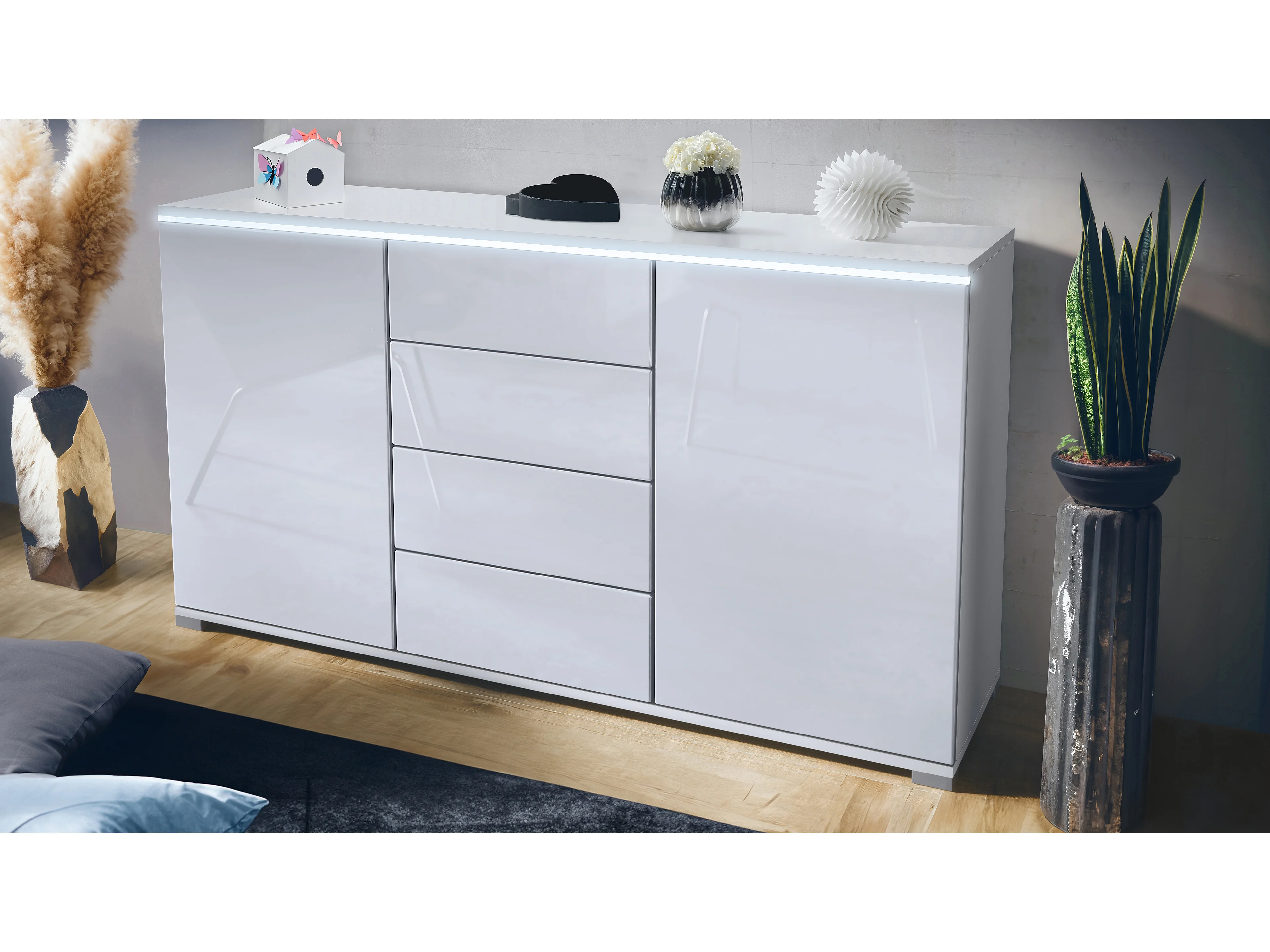 Buffet Faro V1 – Meuble avec 2 Portes & 4 Tiroirs, Armoire avec Bande LED Lumineuse, blanc mat / blanc haute brillance (138,5 x 75,5 x 35)