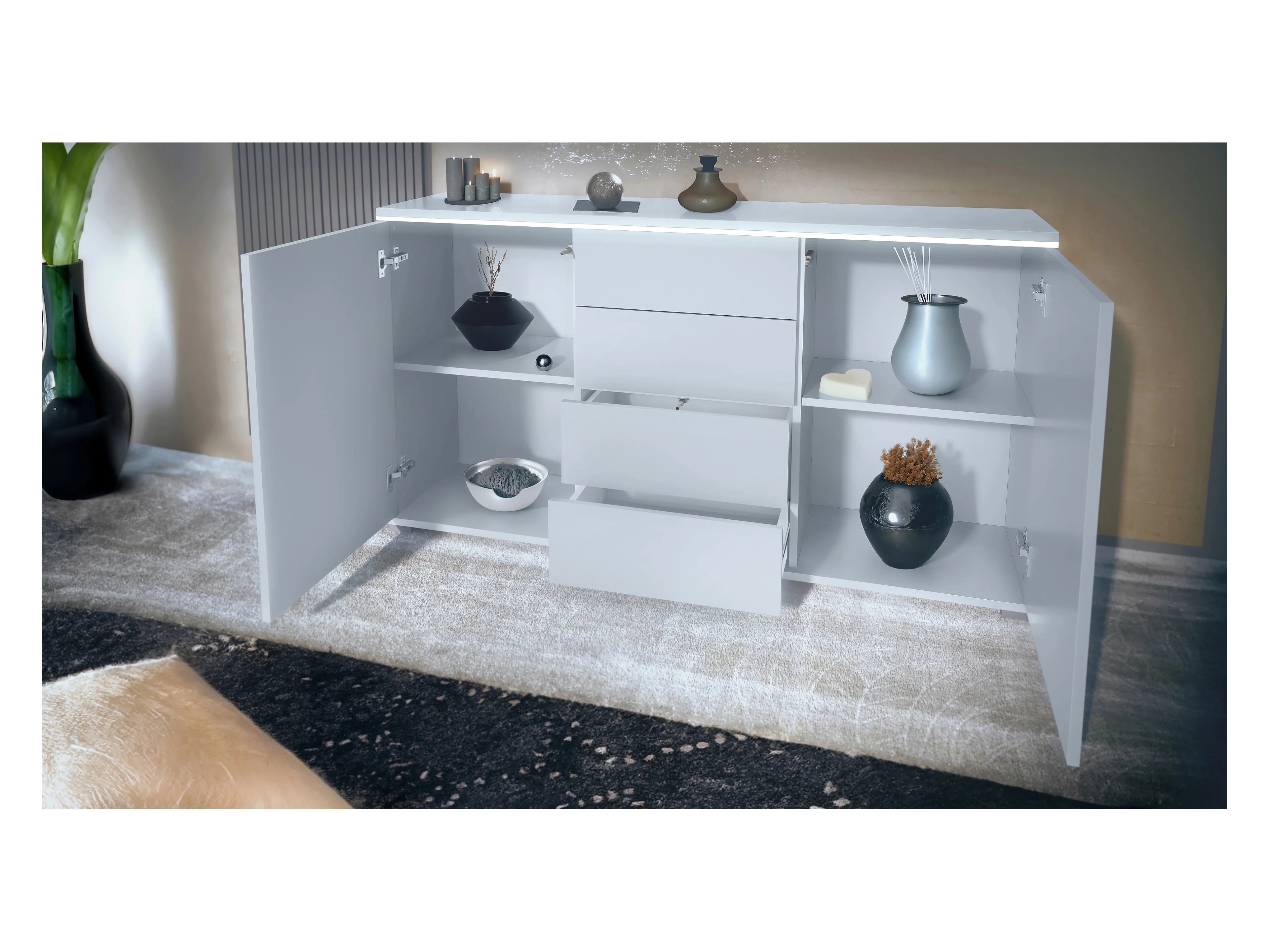Buffet Faro V1 – Meuble avec 2 Portes & 4 Tiroirs, Armoire avec Bande LED Lumineuse, blanc mat / bordeaux haute brillance (138,5 x 75,5 x 35)
