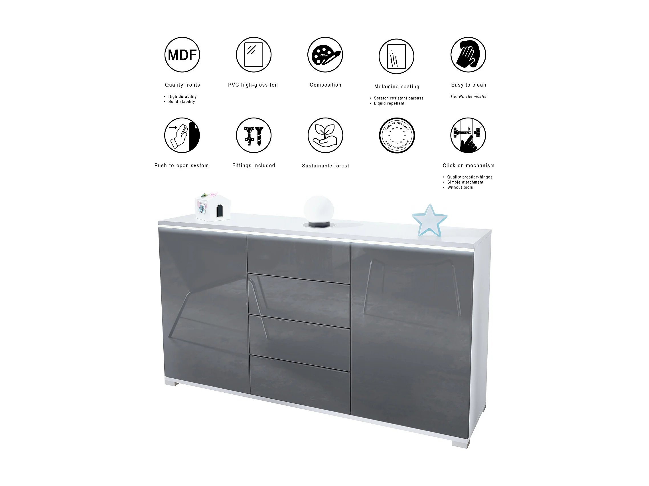 Buffet Faro V1 – Meuble avec 2 Portes & 4 Tiroirs, Armoire avec Bande LED Lumineuse, blanc mat / chêne nature (138,5 x 75,5 x 35)