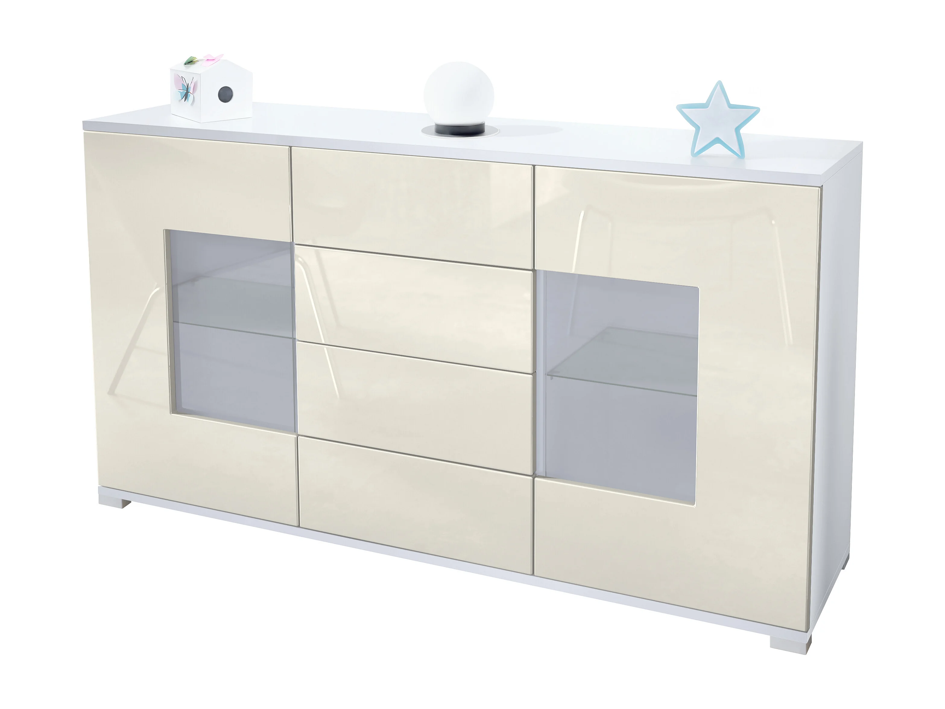 Buffet Grömitz V1 – Meuble avec 2 Grandes Portes et 4 Tiroirs, blanc mat/crème haute brillance (138,5 x 75,5 x 35)