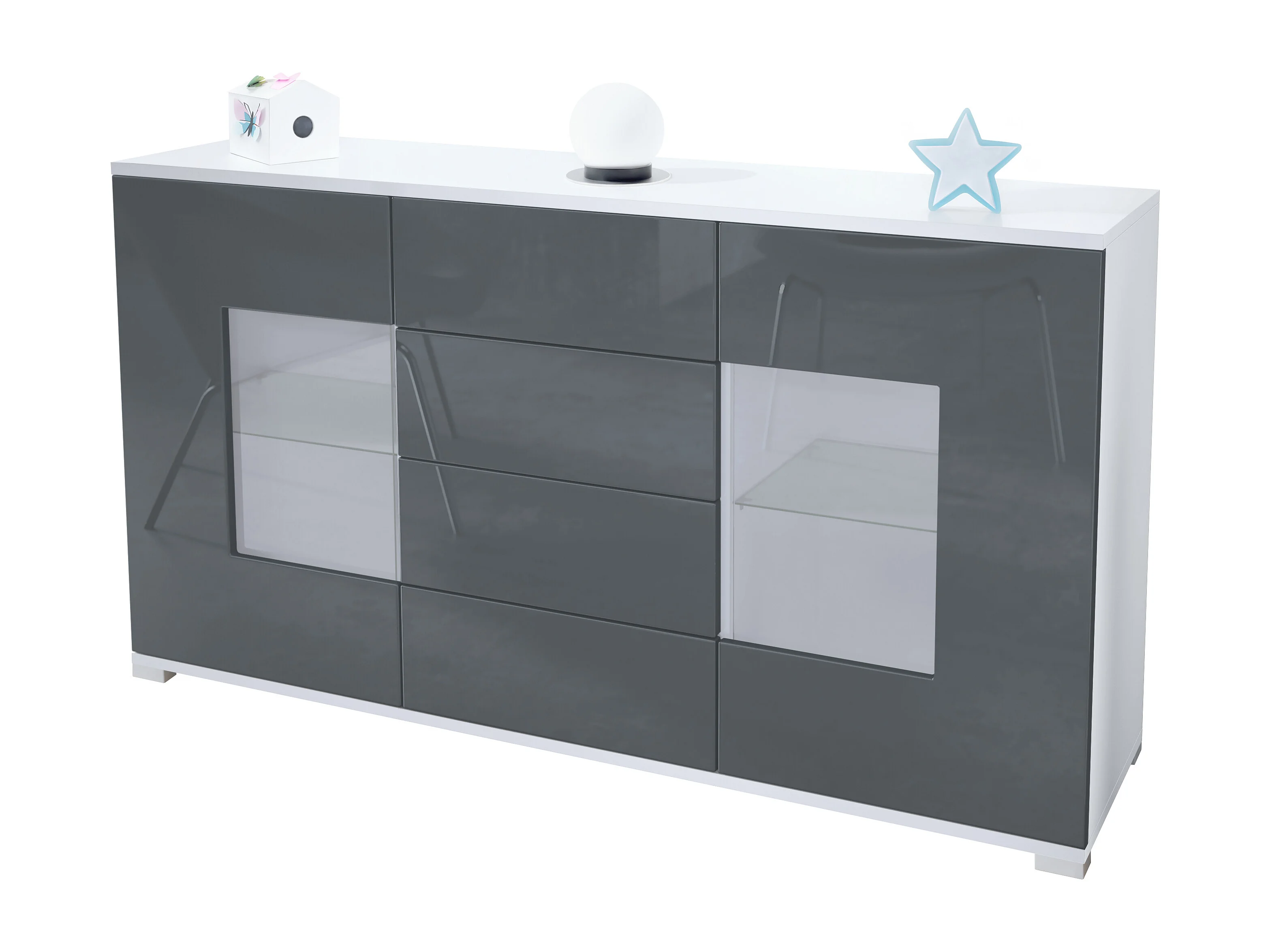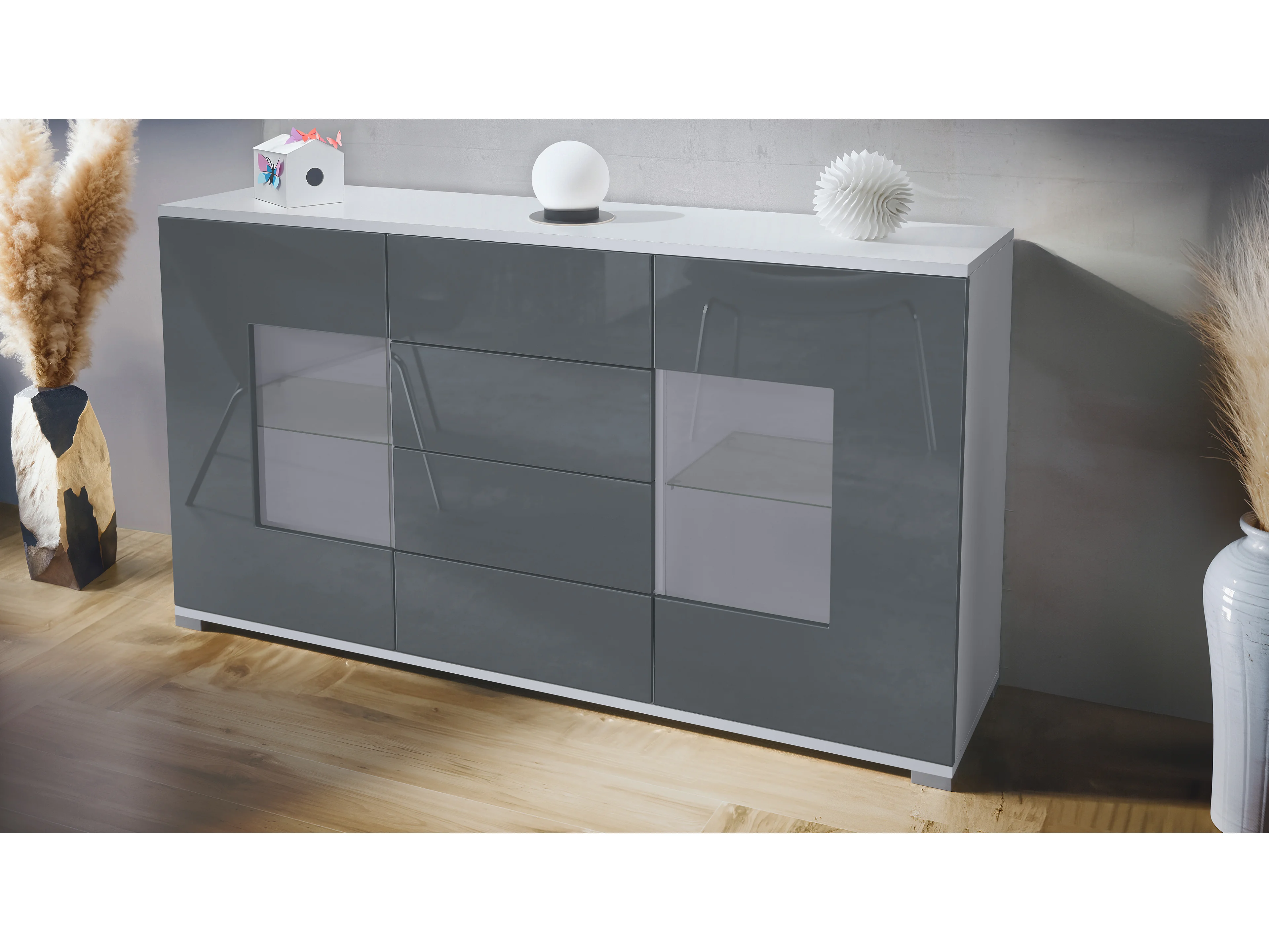 Buffet Grömitz V1 – Meuble avec 2 Grandes Portes et 4 Tiroirs, blanc mat/gris haute brillance (138,5 x 75,5 x 35)