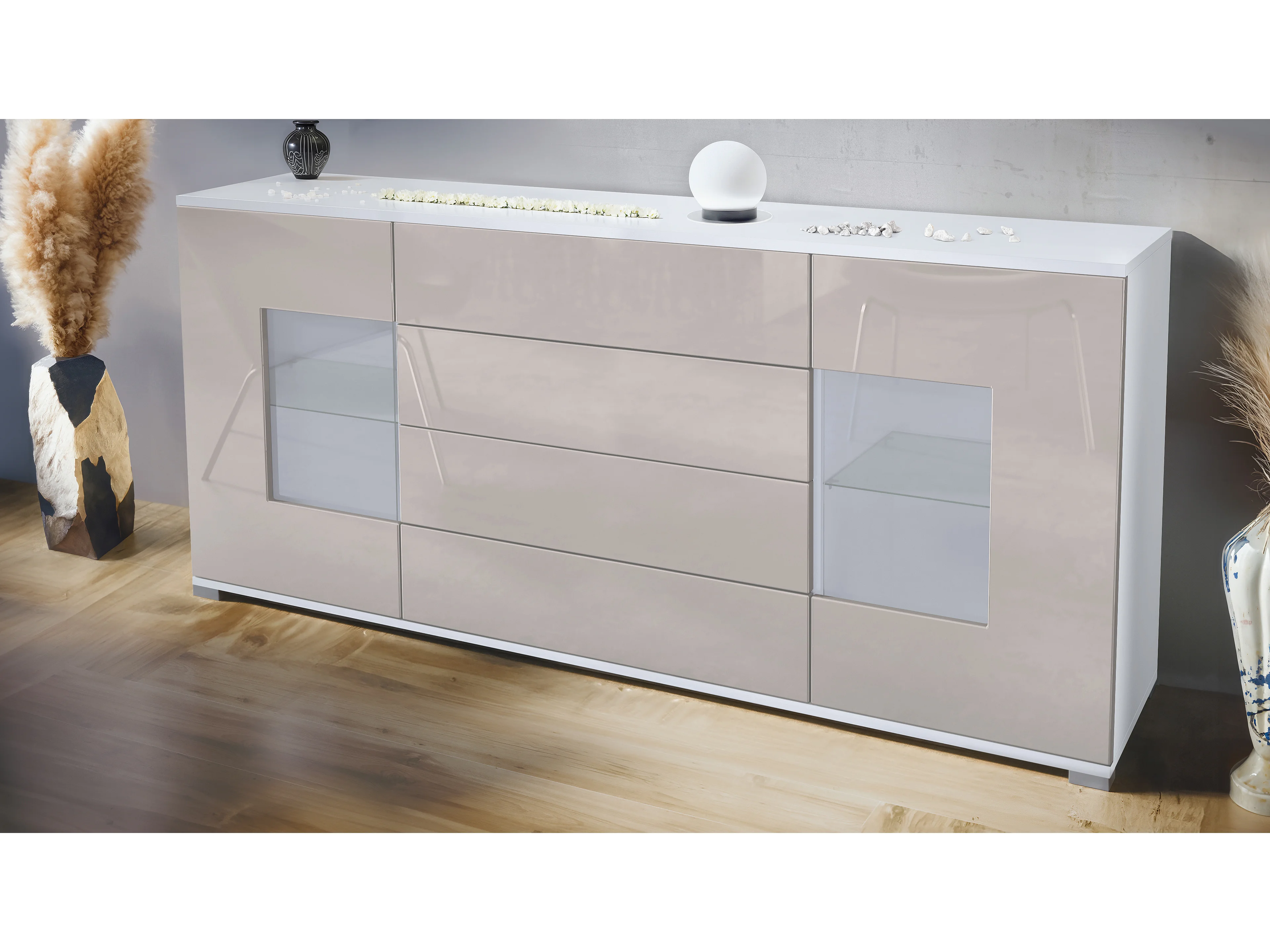 Buffet Grömitz V2 – Meuble avec 2 Grandes Portes et 4 Tiroirs, blanc mat/gris sable haute brillance (166,5 x 75,5 x 35)