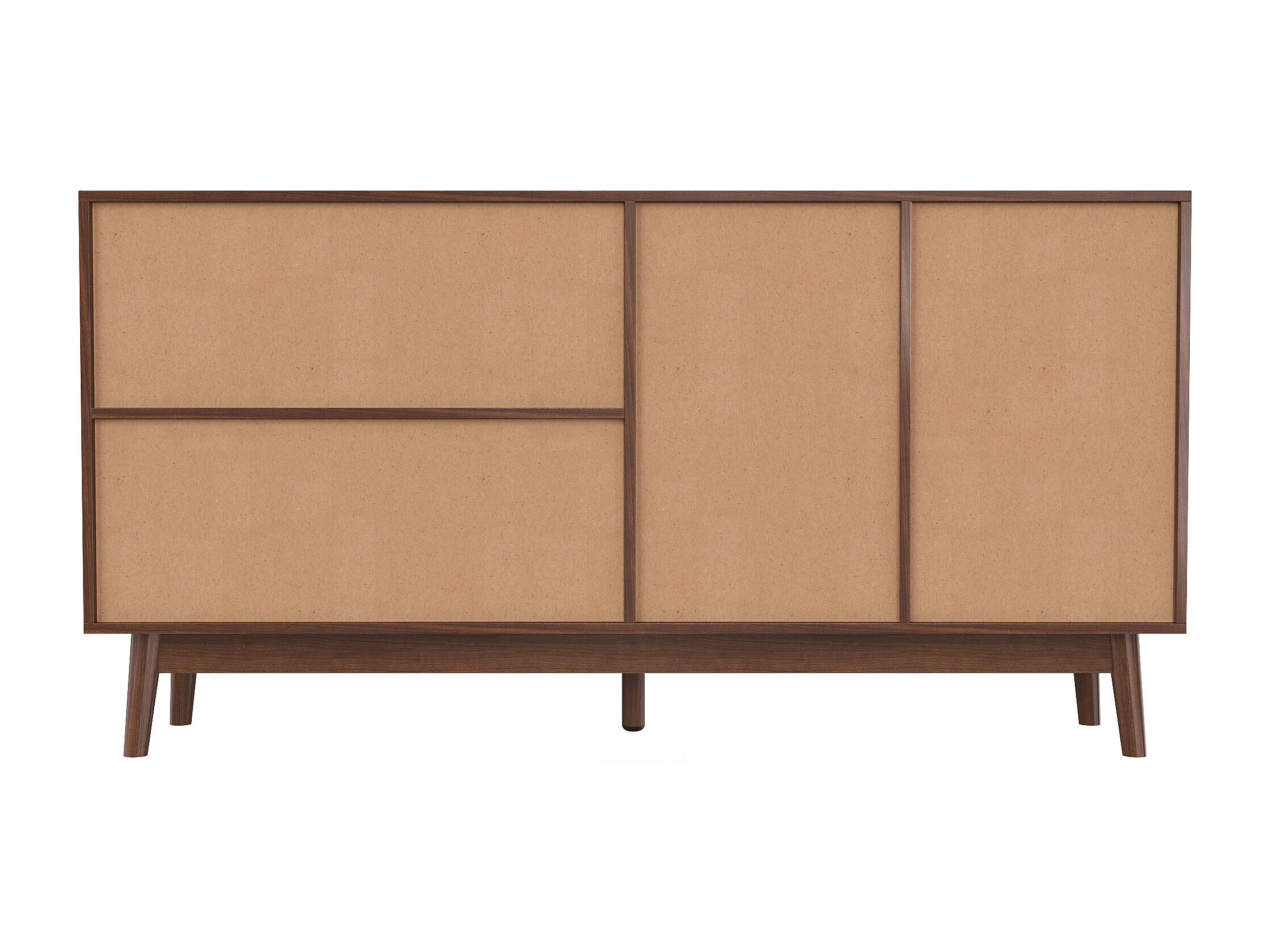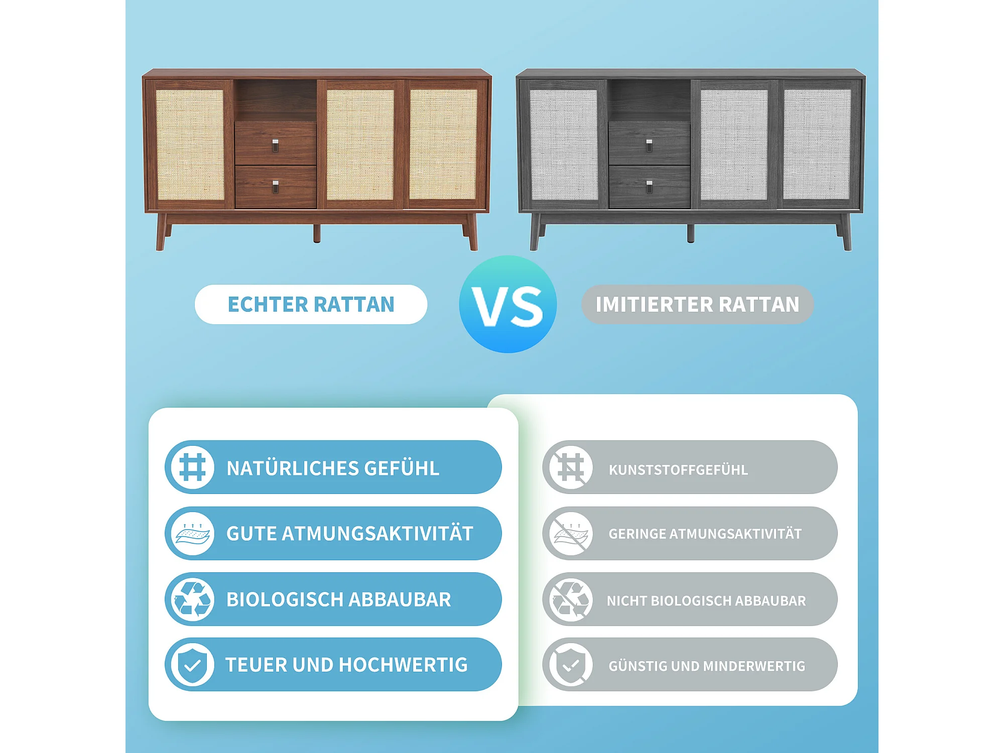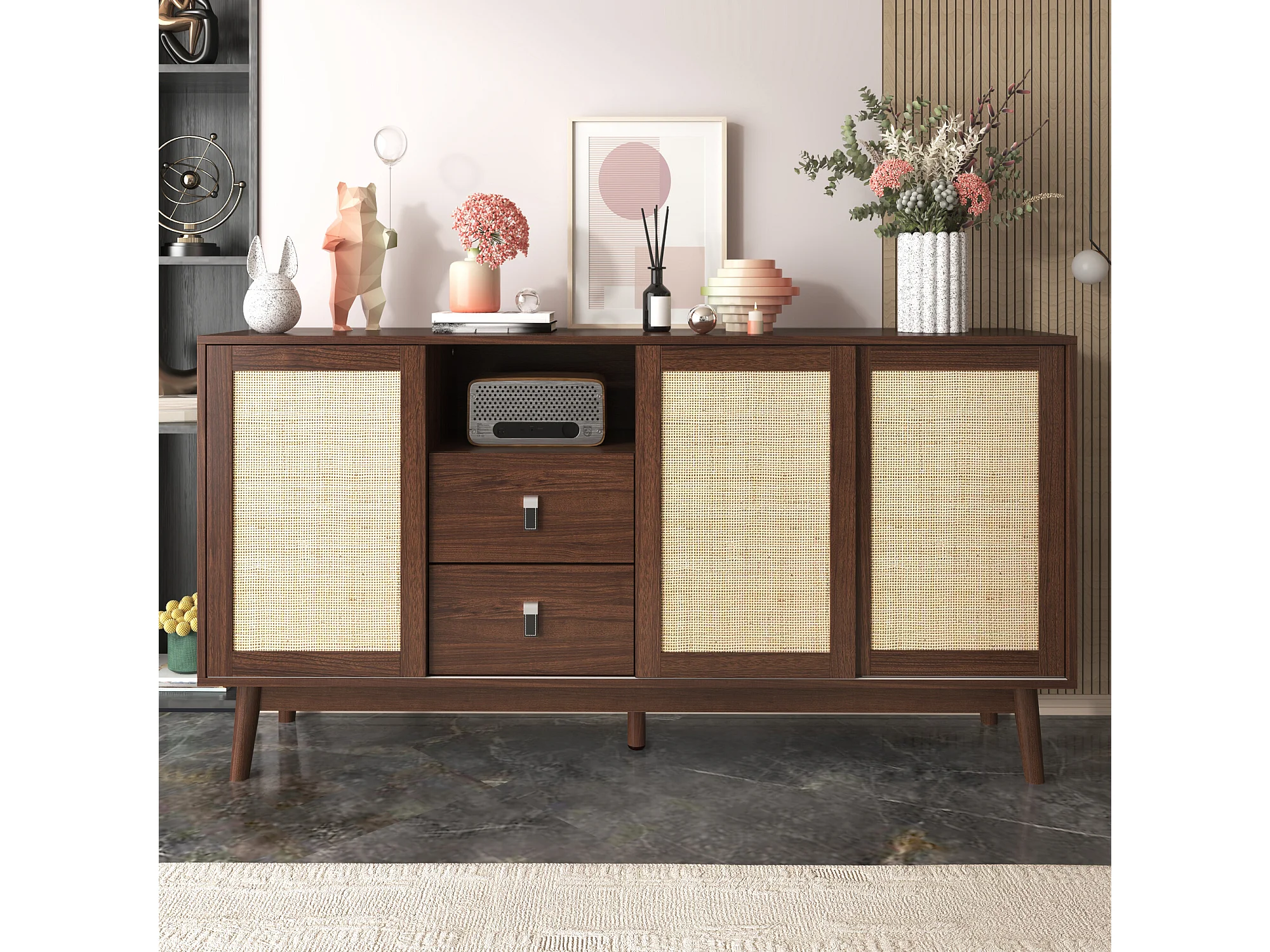 Buffet effet bois noyer avec 3 portes coulissantes en rotin et 2 tiroirs 155x38x80cm