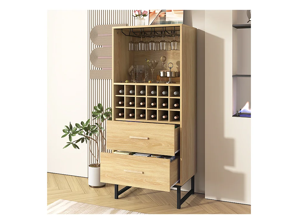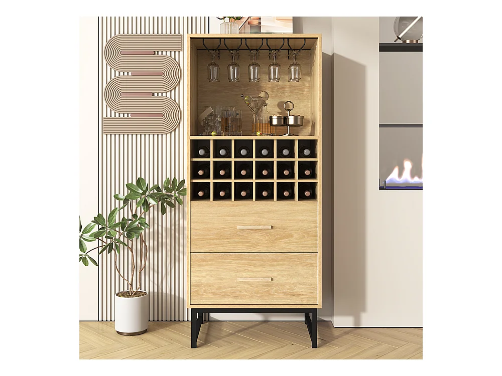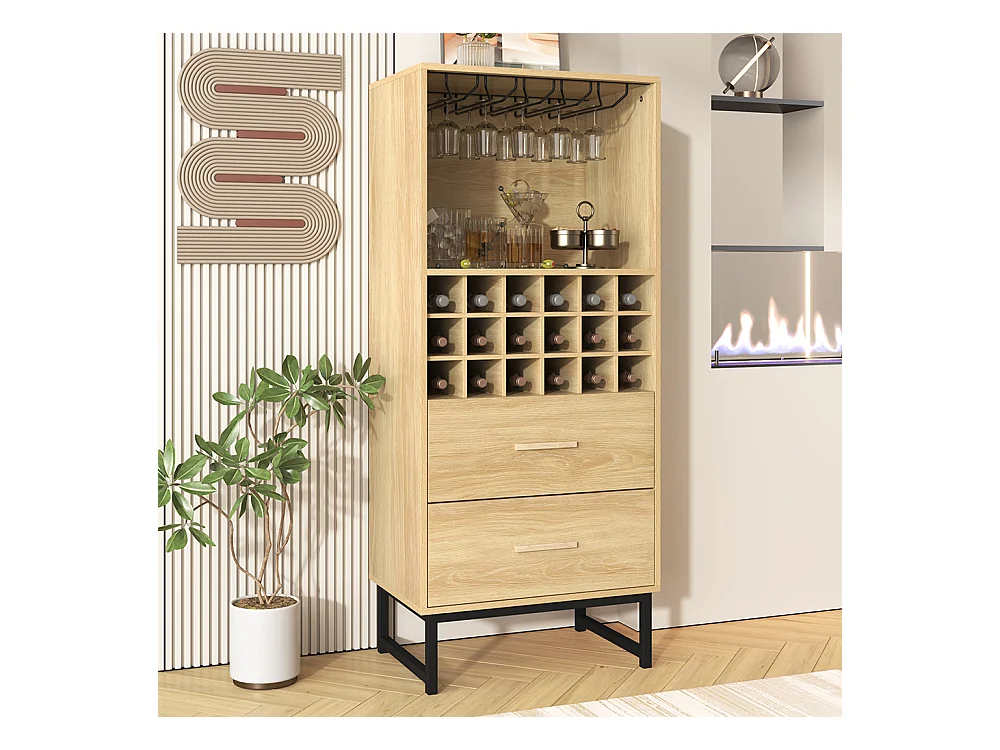 Buffet élégante armoire à vin avec 2 tiroirs 18 compartiments et porte-verres pieds en métal noir mat Couleur du bois