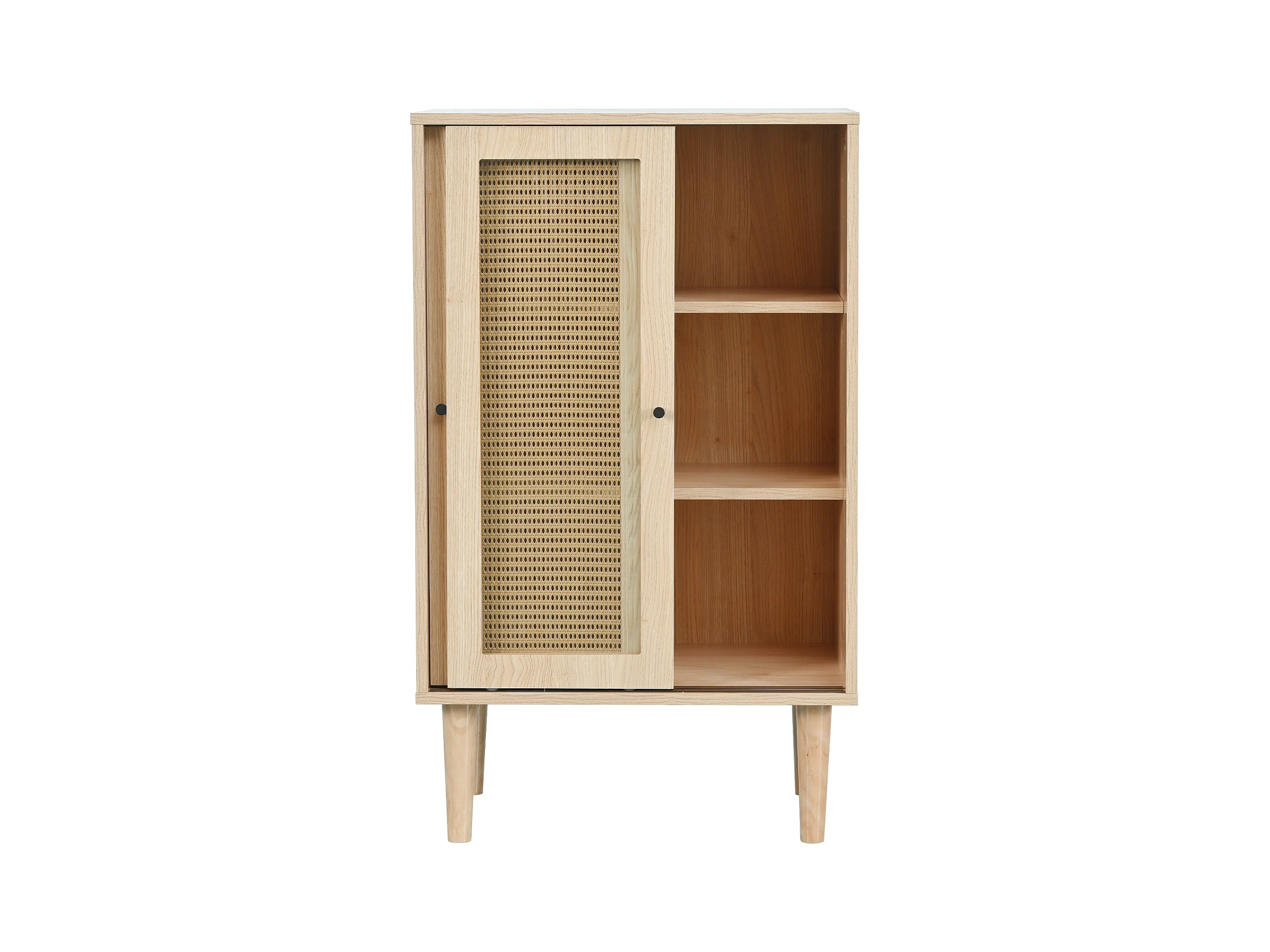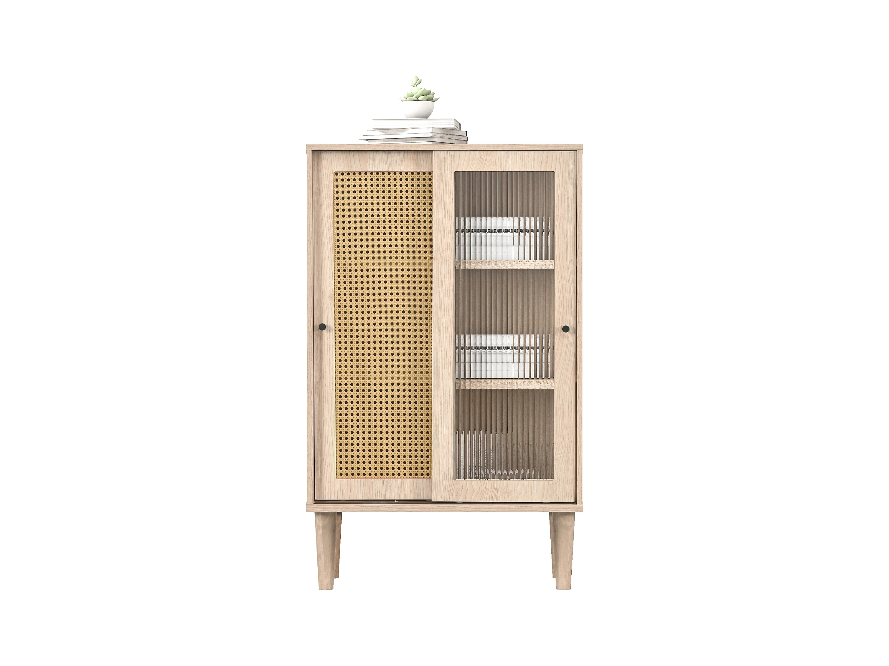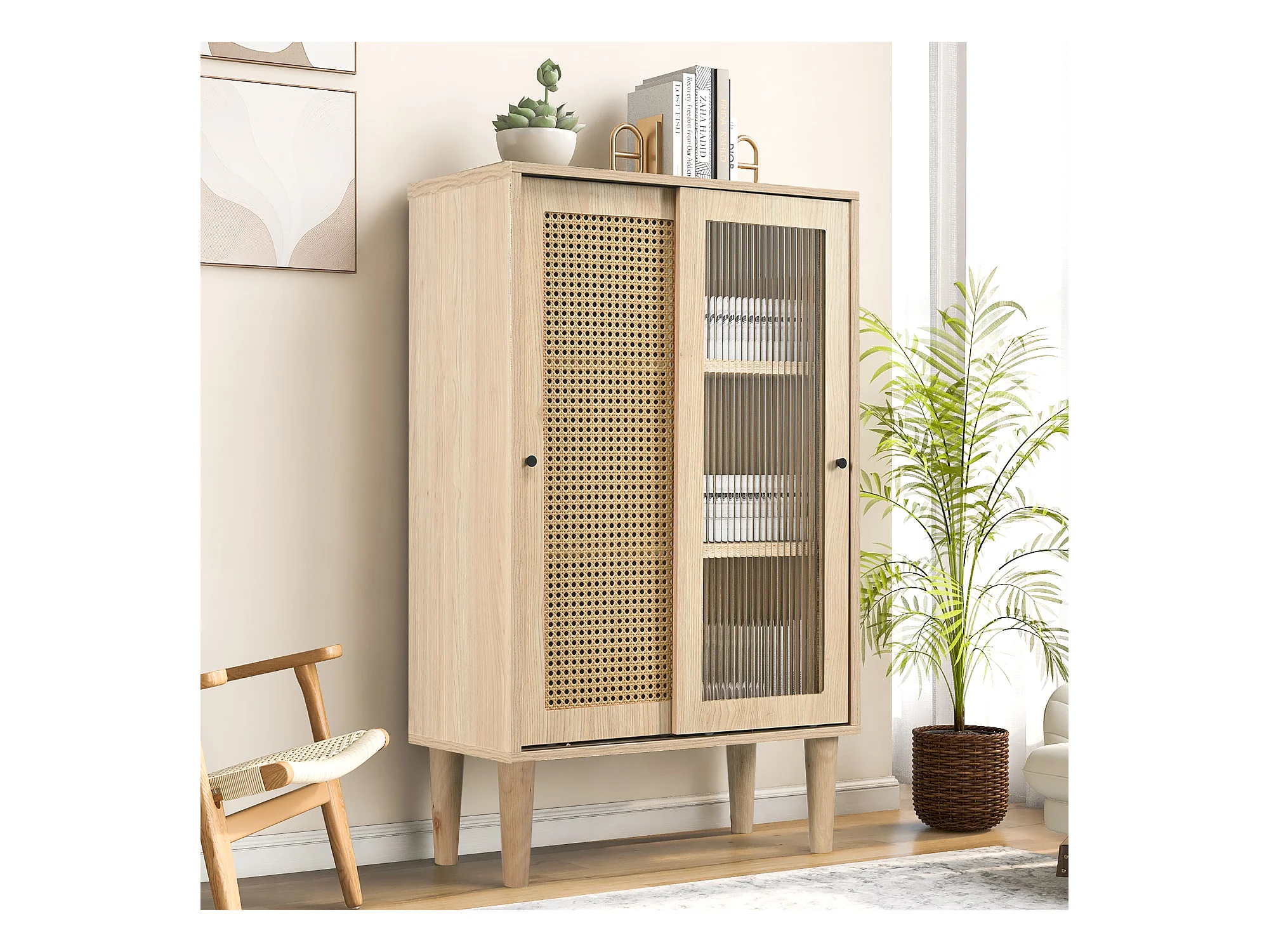 Buffet en bois de 100 cm de haut avec rotin en plastique et portes coulissantes en verre