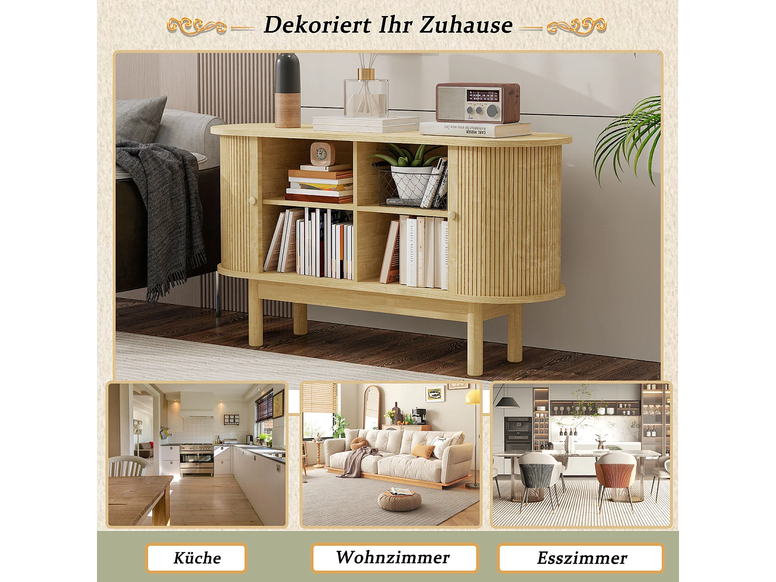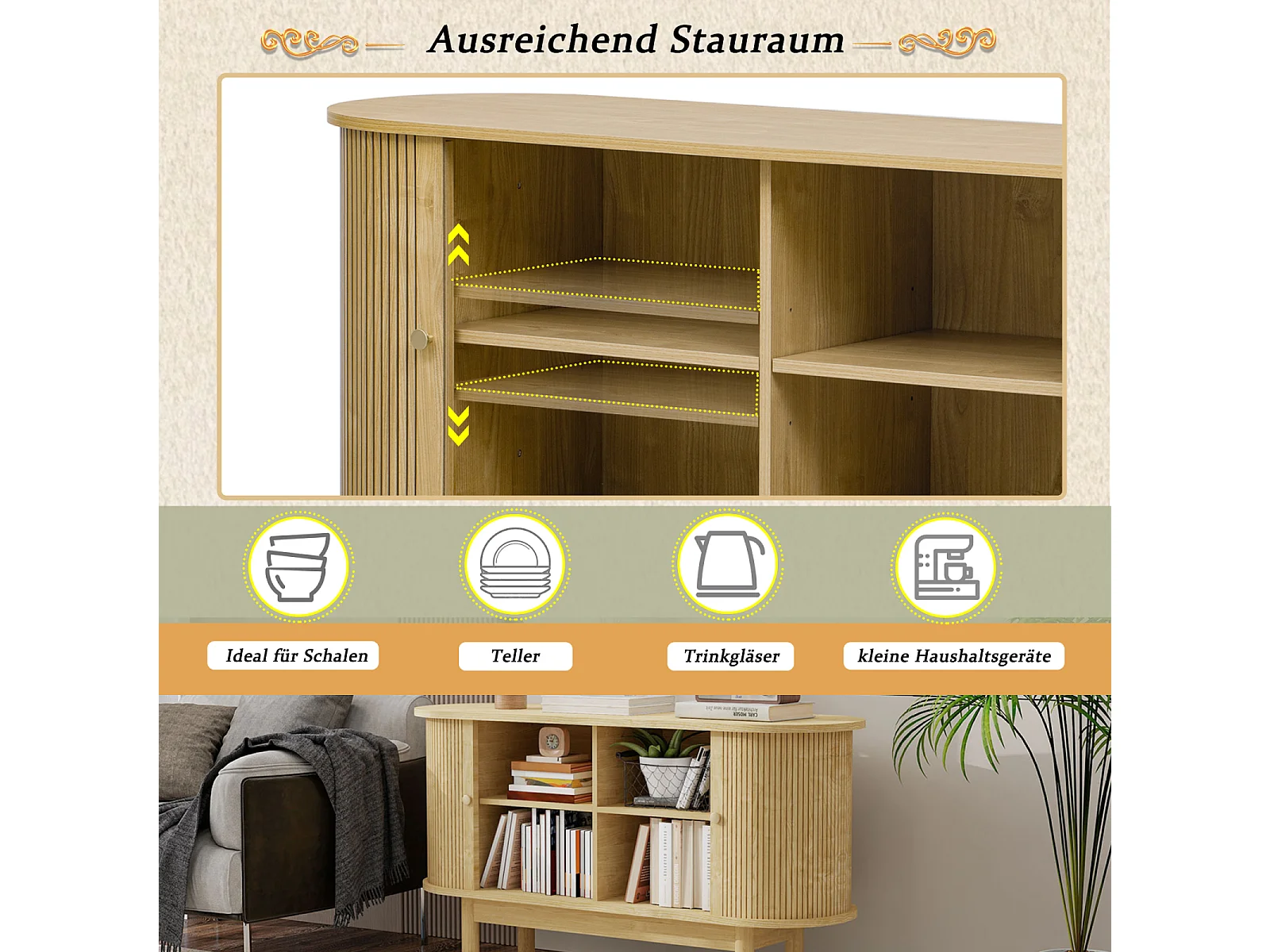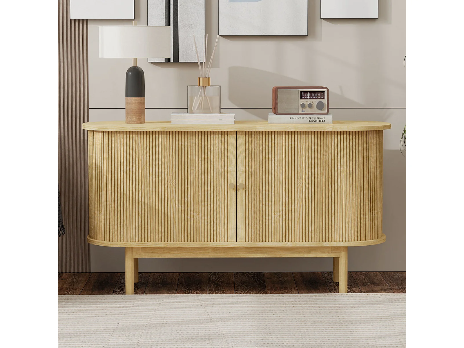 Buffet en bois style rétro moderne avec portes coulissantes, étagères réglables et pieds en pin, chêne clair, pour salle à manger, cuisine ou entrée