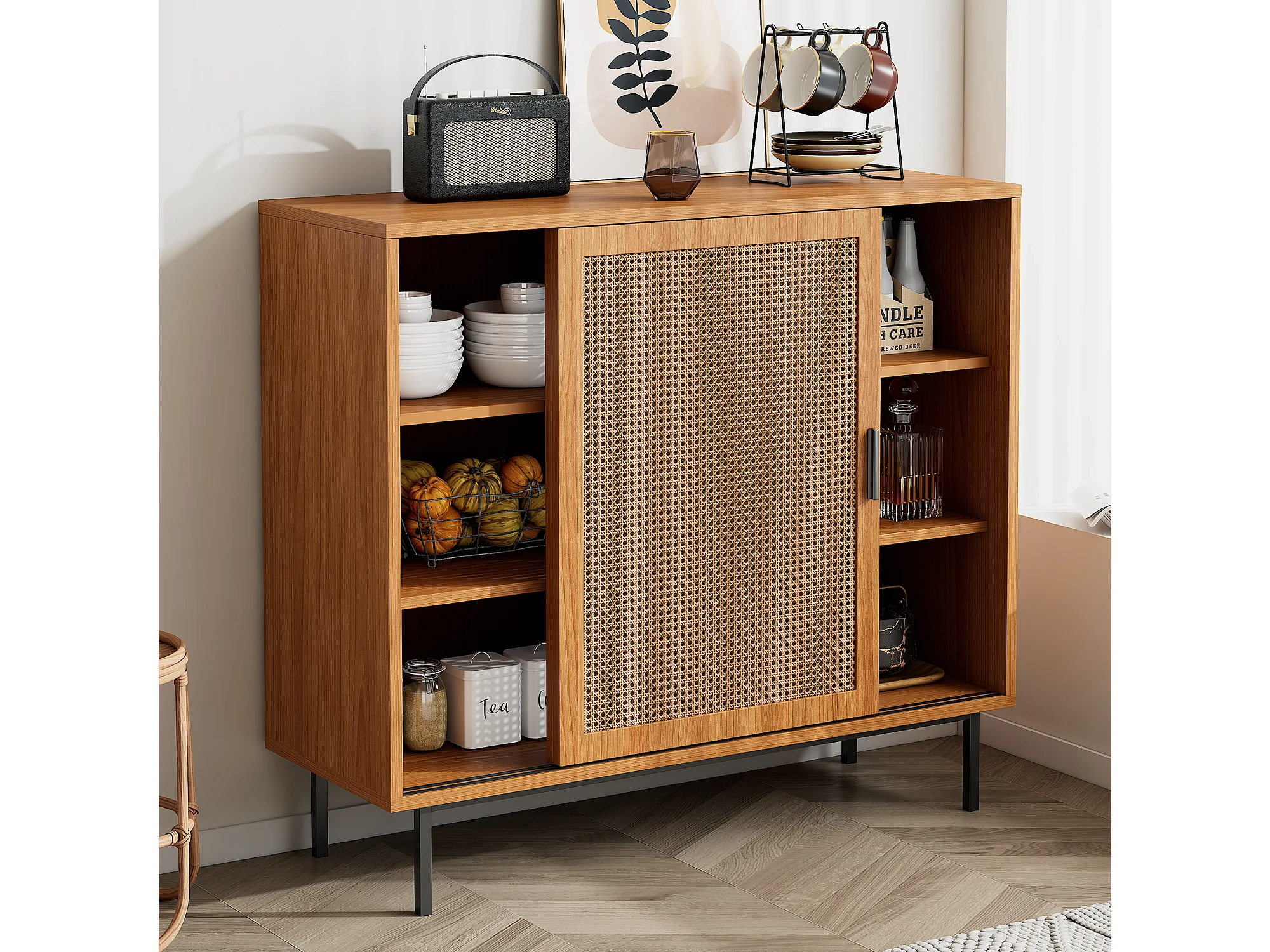 Buffet naturel avec 3 tiroirs et 2 portes en rotin, étagères réglables - poignées et pieds noirs