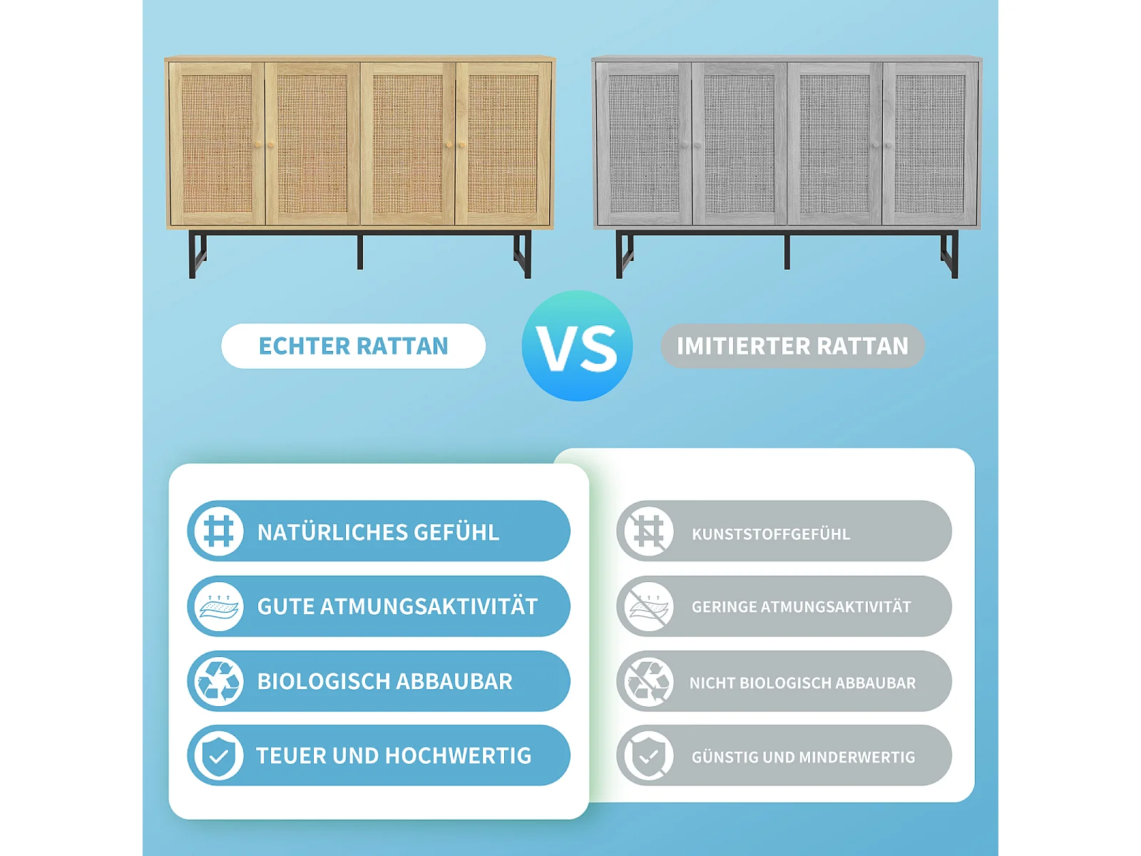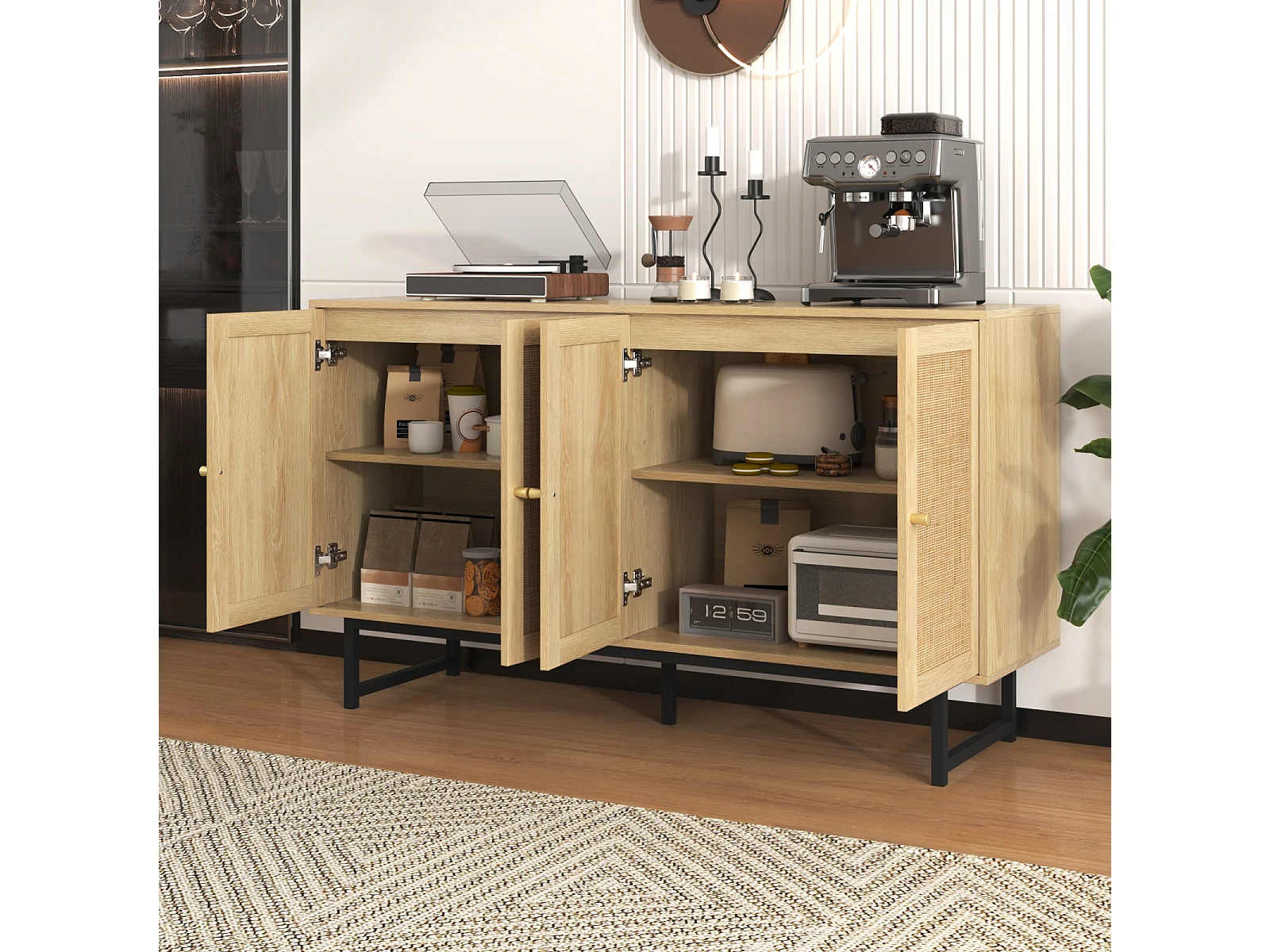 Buffet en rotin naturel 140 x 39,5x80 cm, 4 portes, style naturel et aéré, stable et durable, idéal salon, salle à manger et chambre