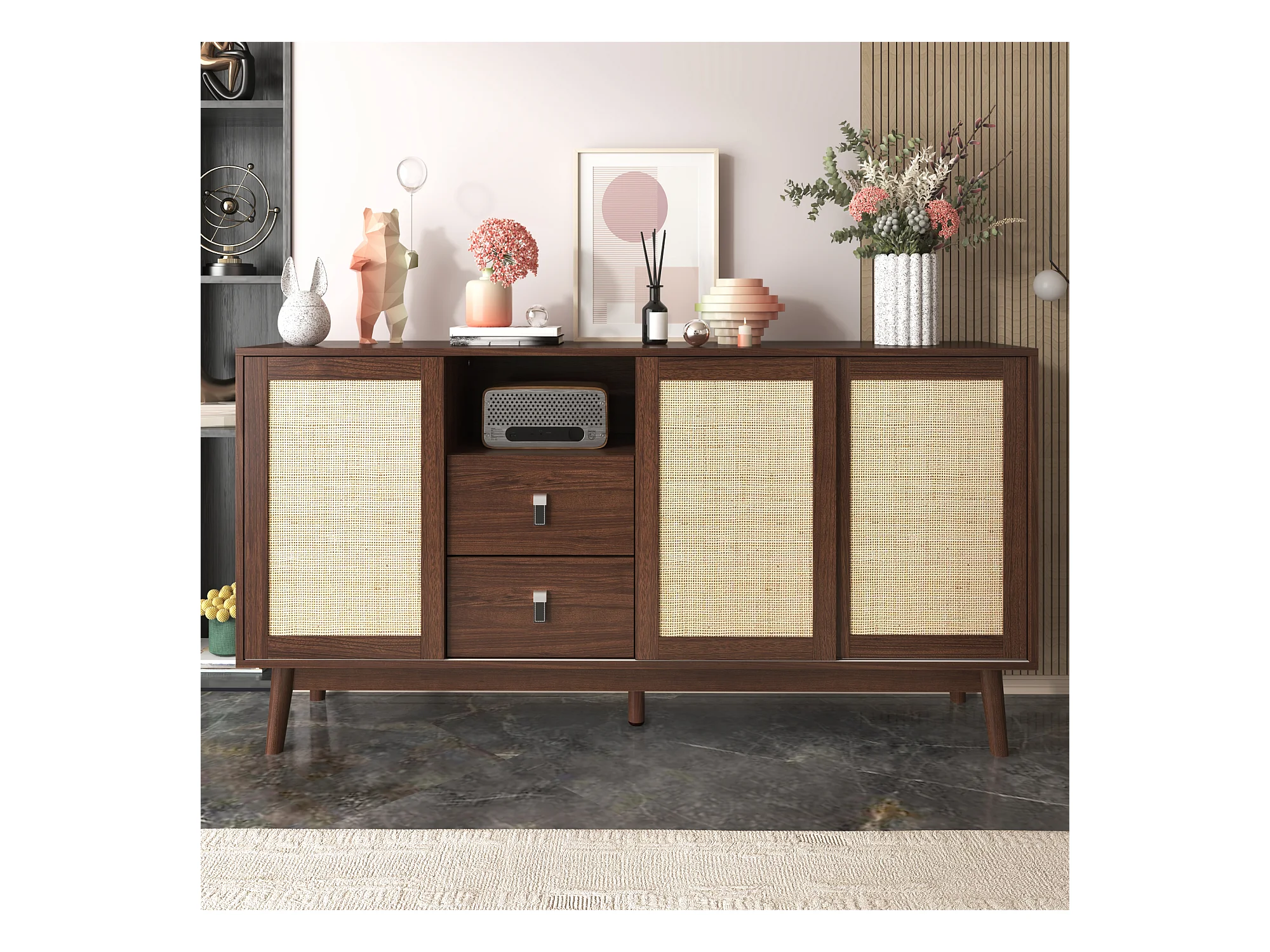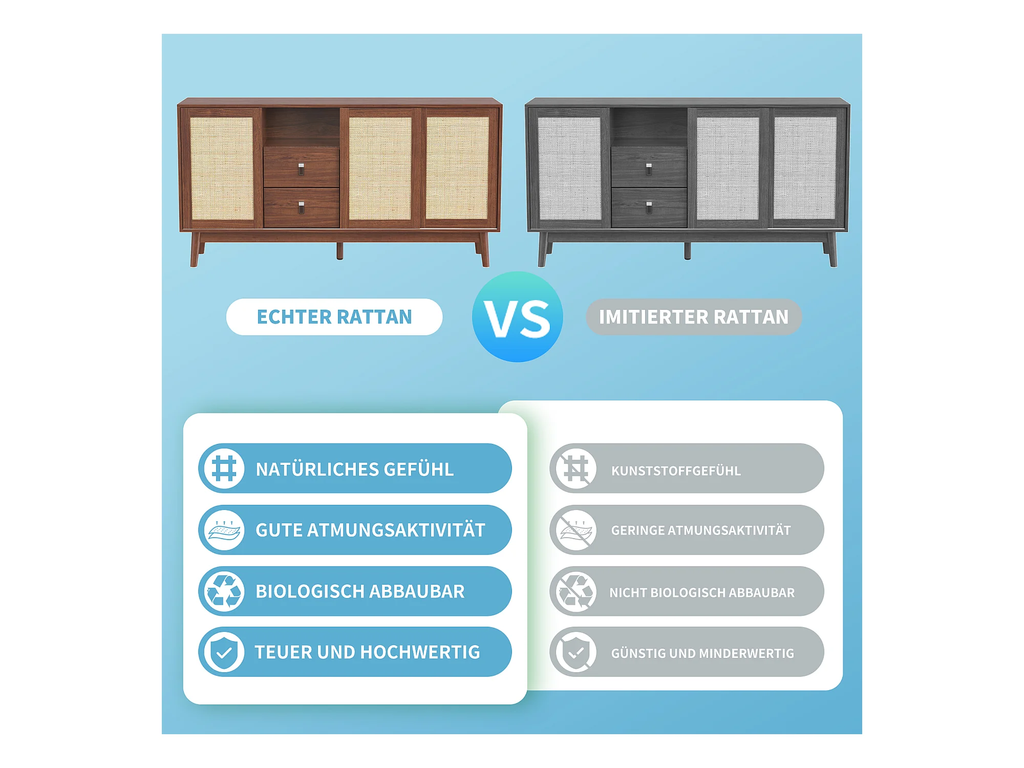 Buffet en rotin naturel 155x38x80 cm, 3 portes coulissantes et 2 tiroirs, respirant, stable et polyvalent, idéal salon, salle à manger et chambre