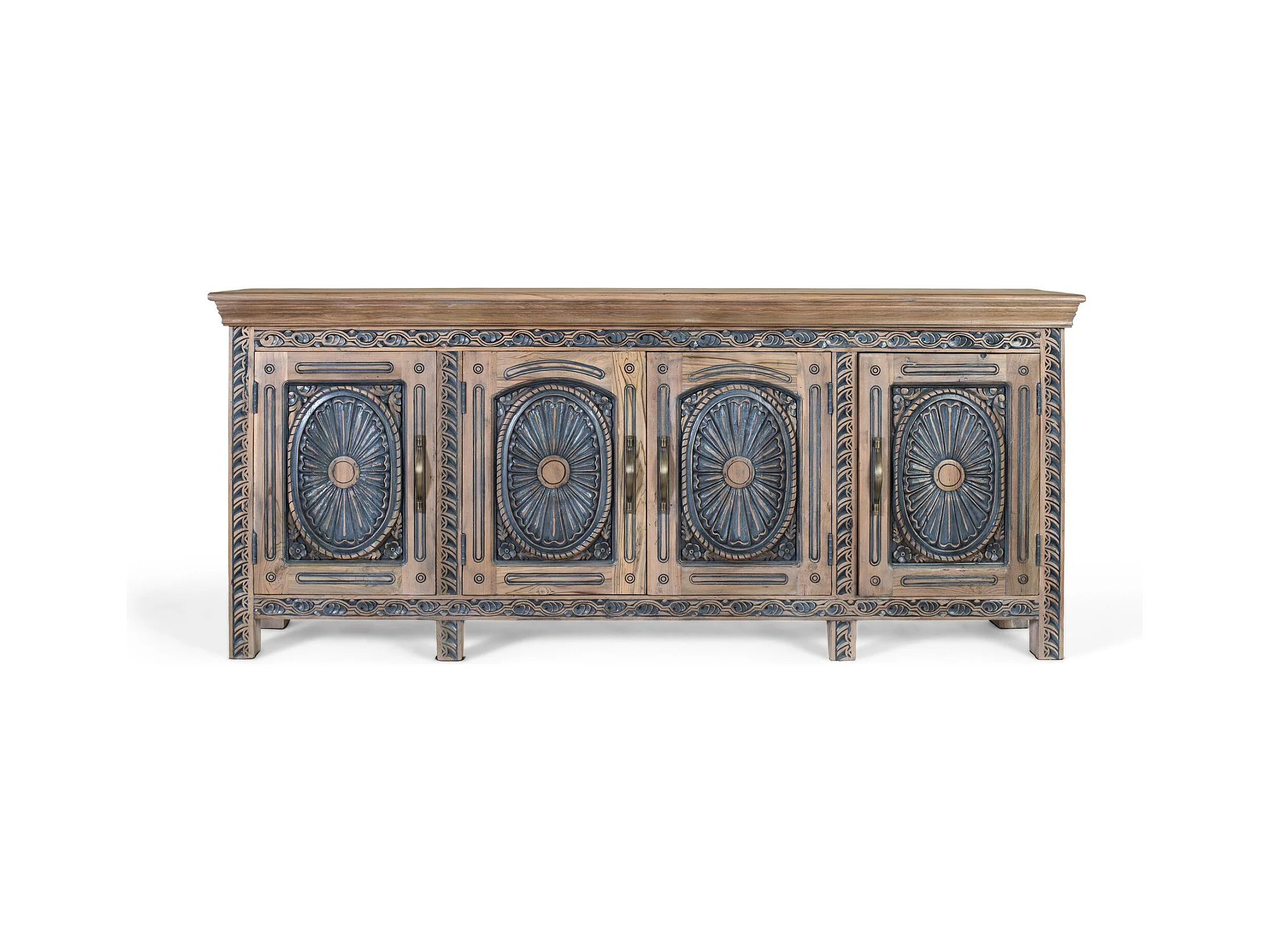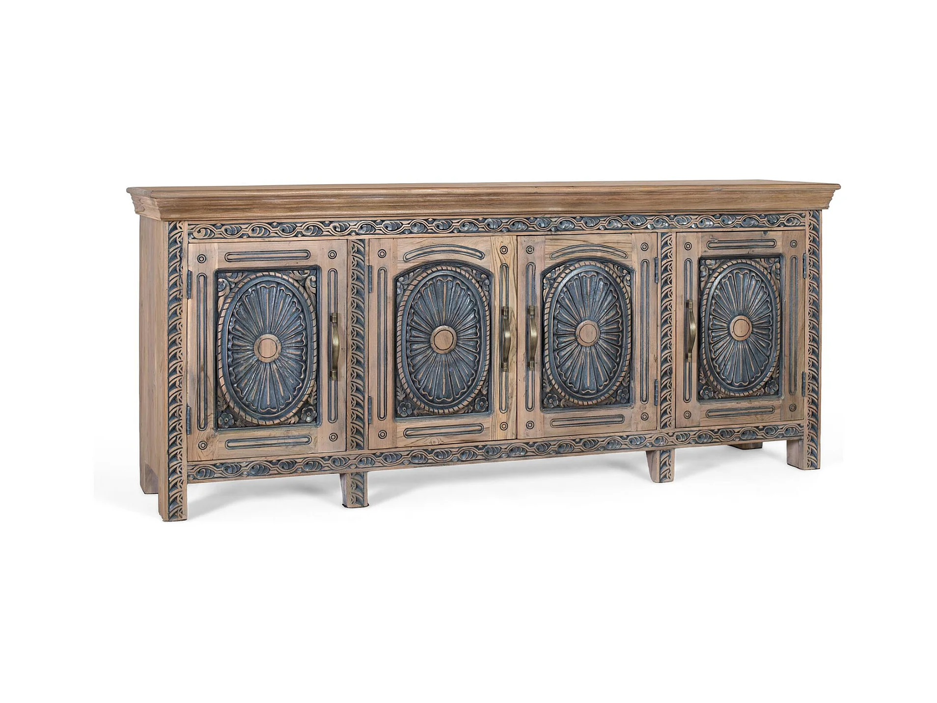Buffet en teck sculpté bicolore, naturel et bleu vieilli