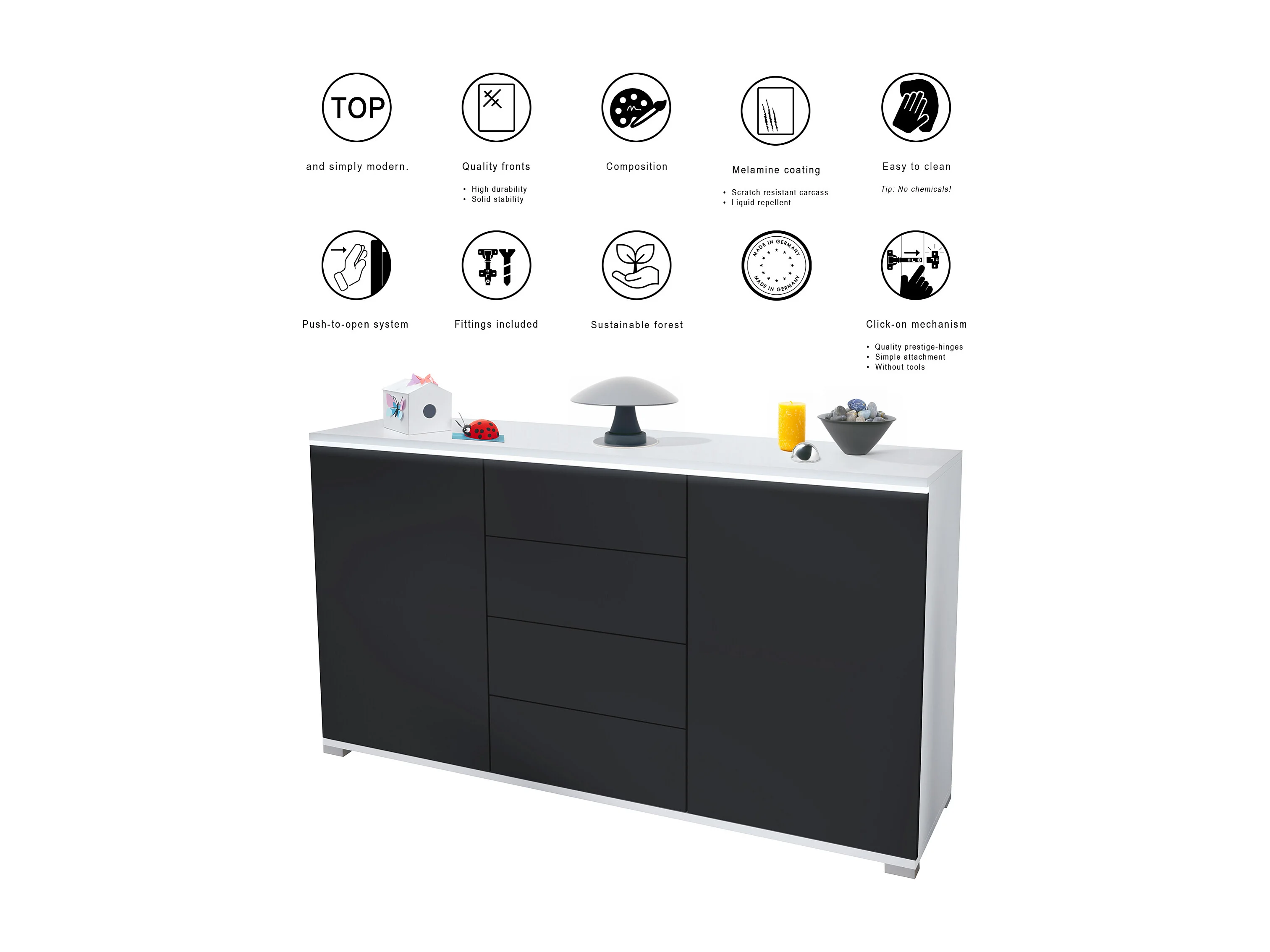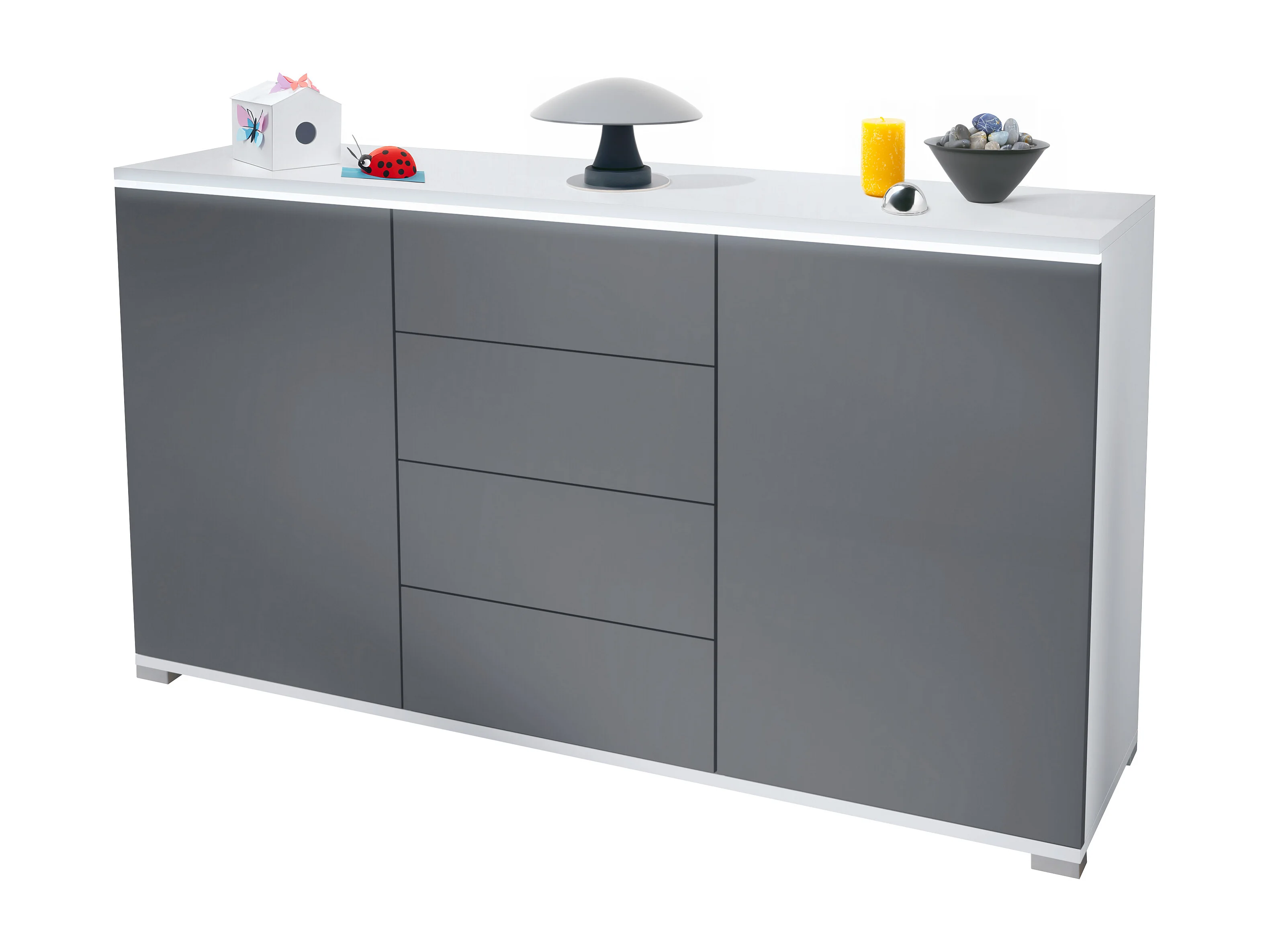 Buffet Faro V1 – Meuble avec 2 Portes & 4 Tiroirs, Armoire avec Bande LED Lumineuse, blanc mat / anthracite mat (138,5 x 75,5 x 35)