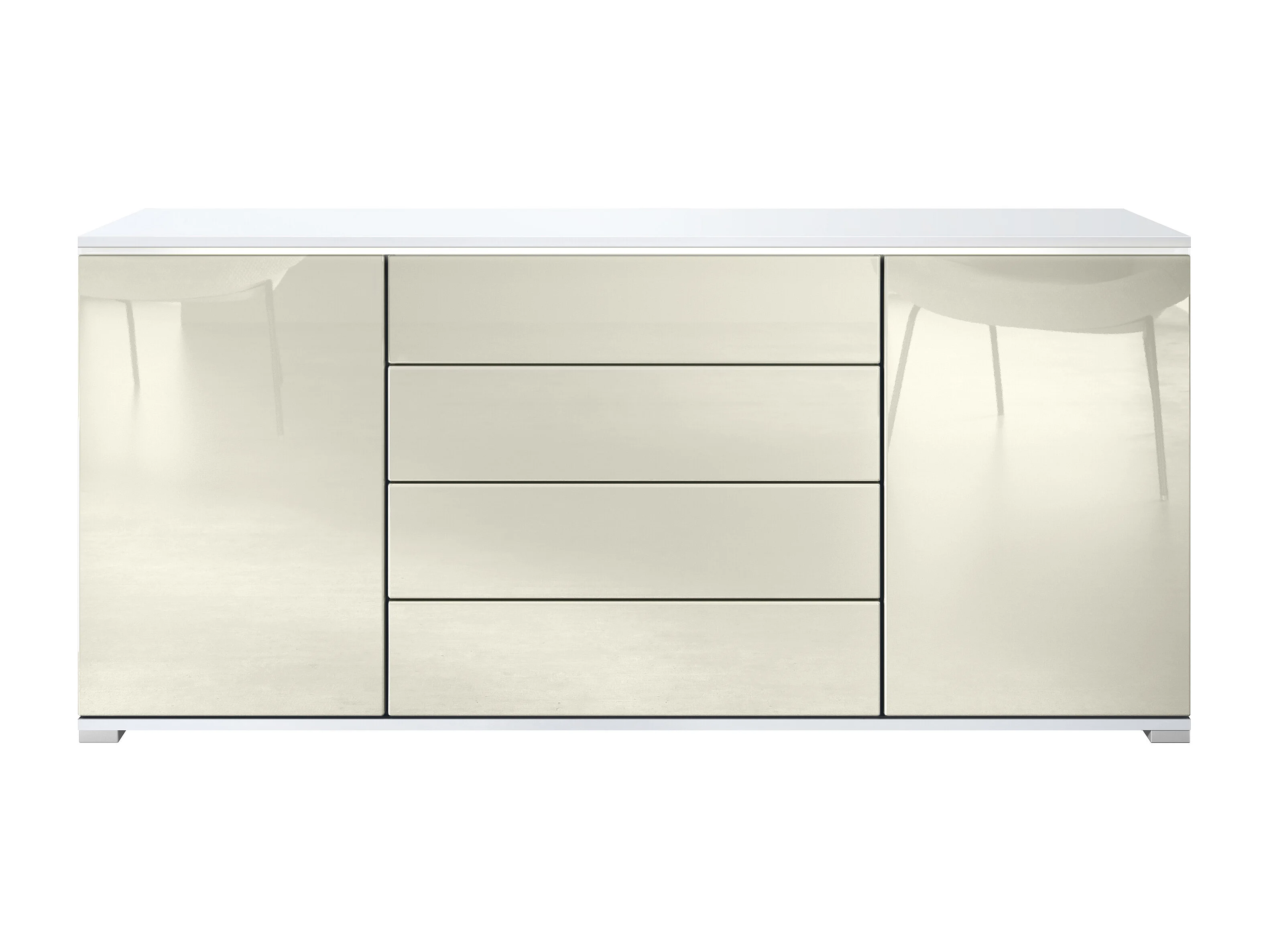 Buffet Faro V2 – Meuble avec 2 Portes & 4 Tiroirs, Armoire avec Bande LED Lumineuse, blanc mat / crème haute brillance (166,5 x 75,5 x 35)