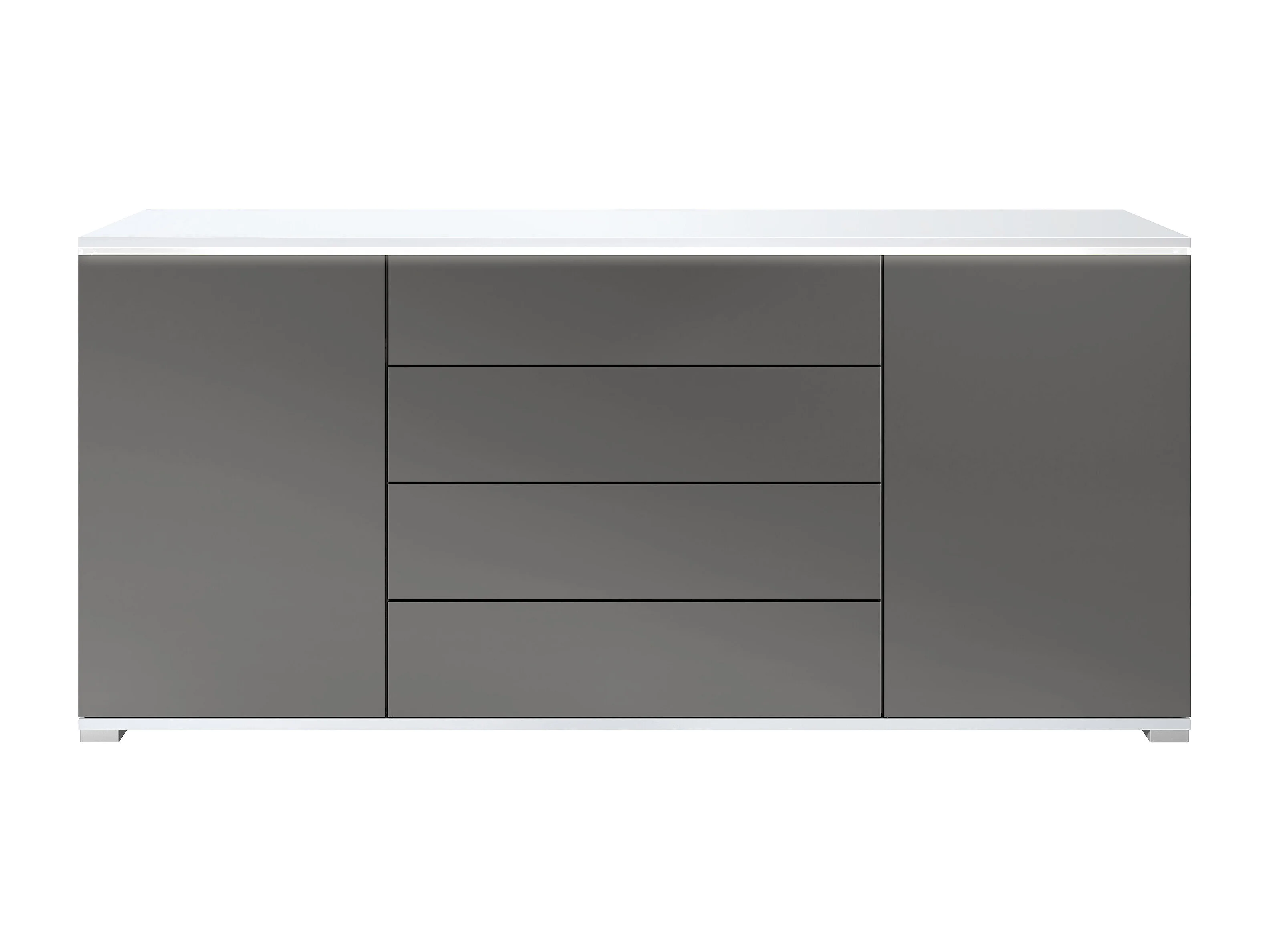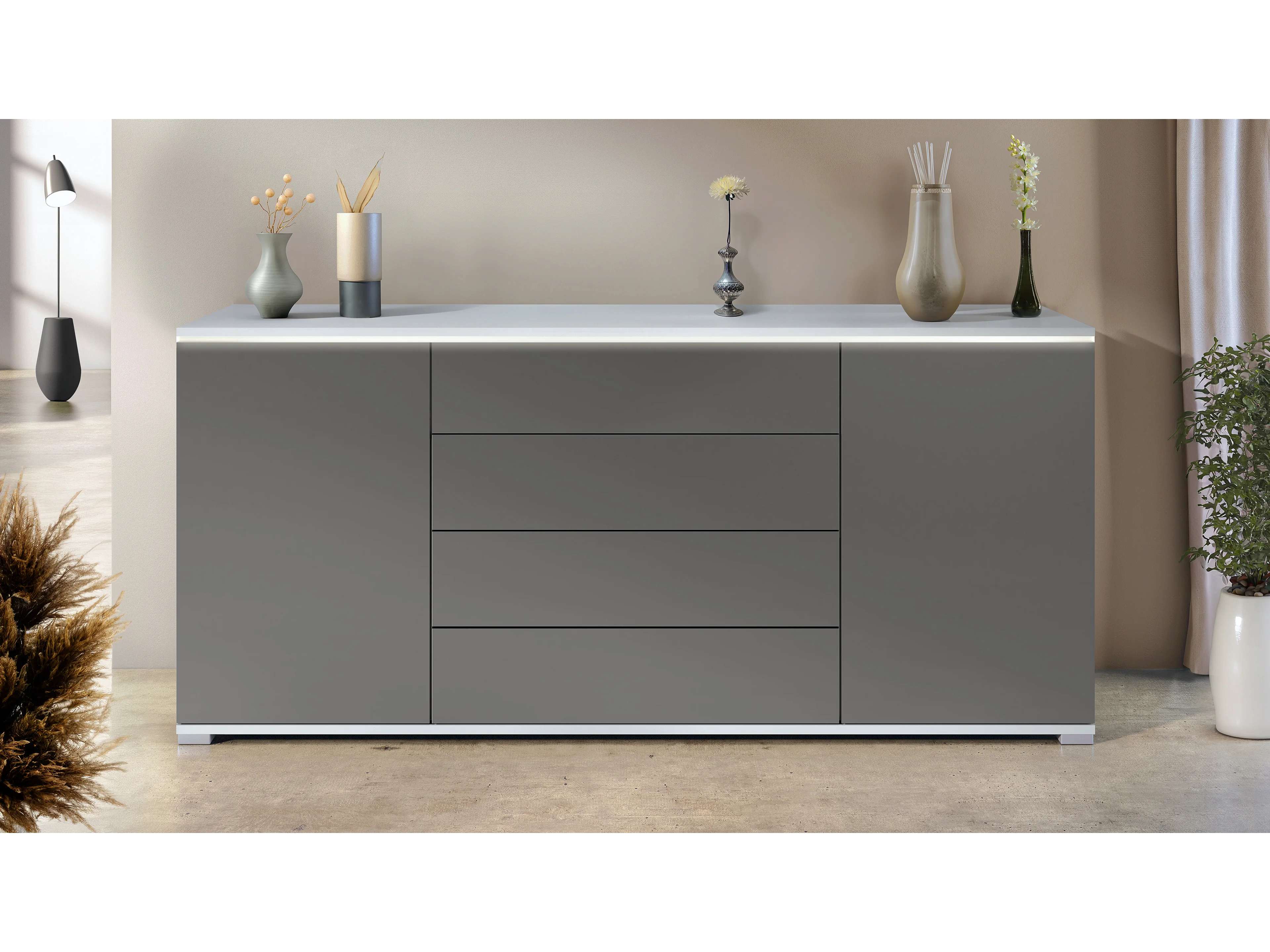 Buffet Faro V2 – Meuble avec 2 Portes & 4 Tiroirs, Armoire avec Bande LED Lumineuse, blanc mat / anthracite mat (166,5 x 75,5 x 35)