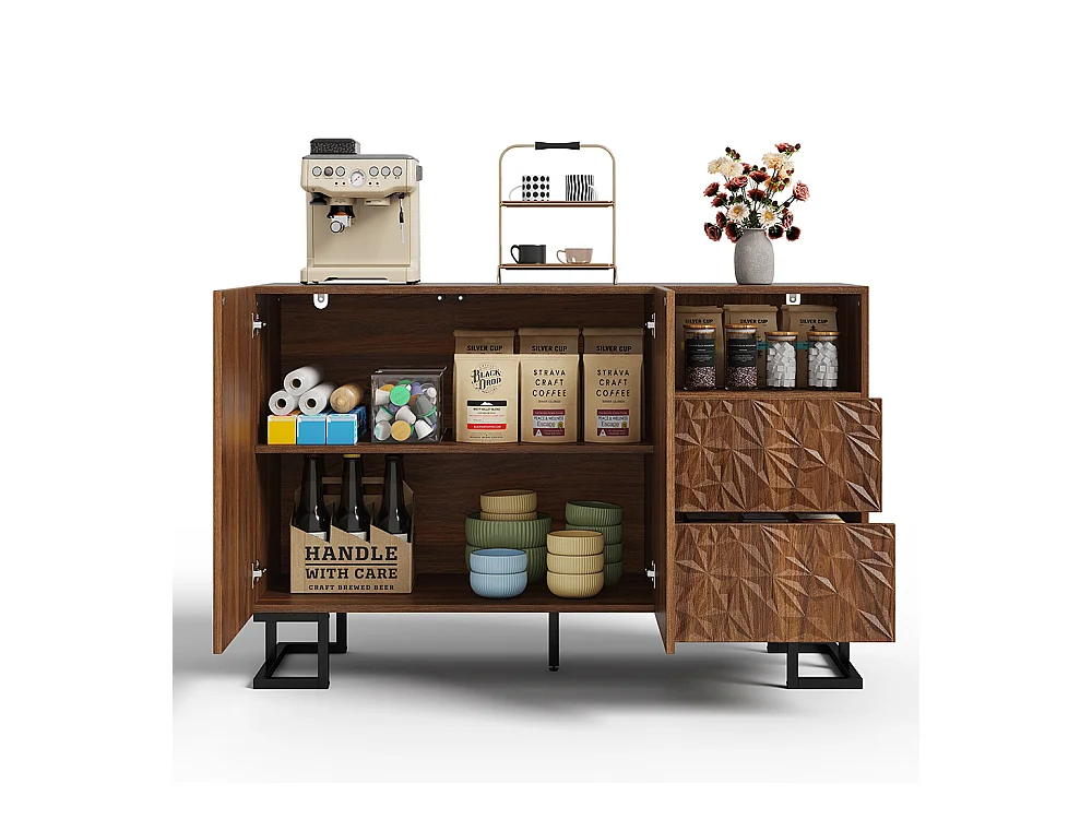 Buffet finition noyer foncé relief feuilles pieds métalliques 2 portes 2 tiroirs salle à manger salon couloir