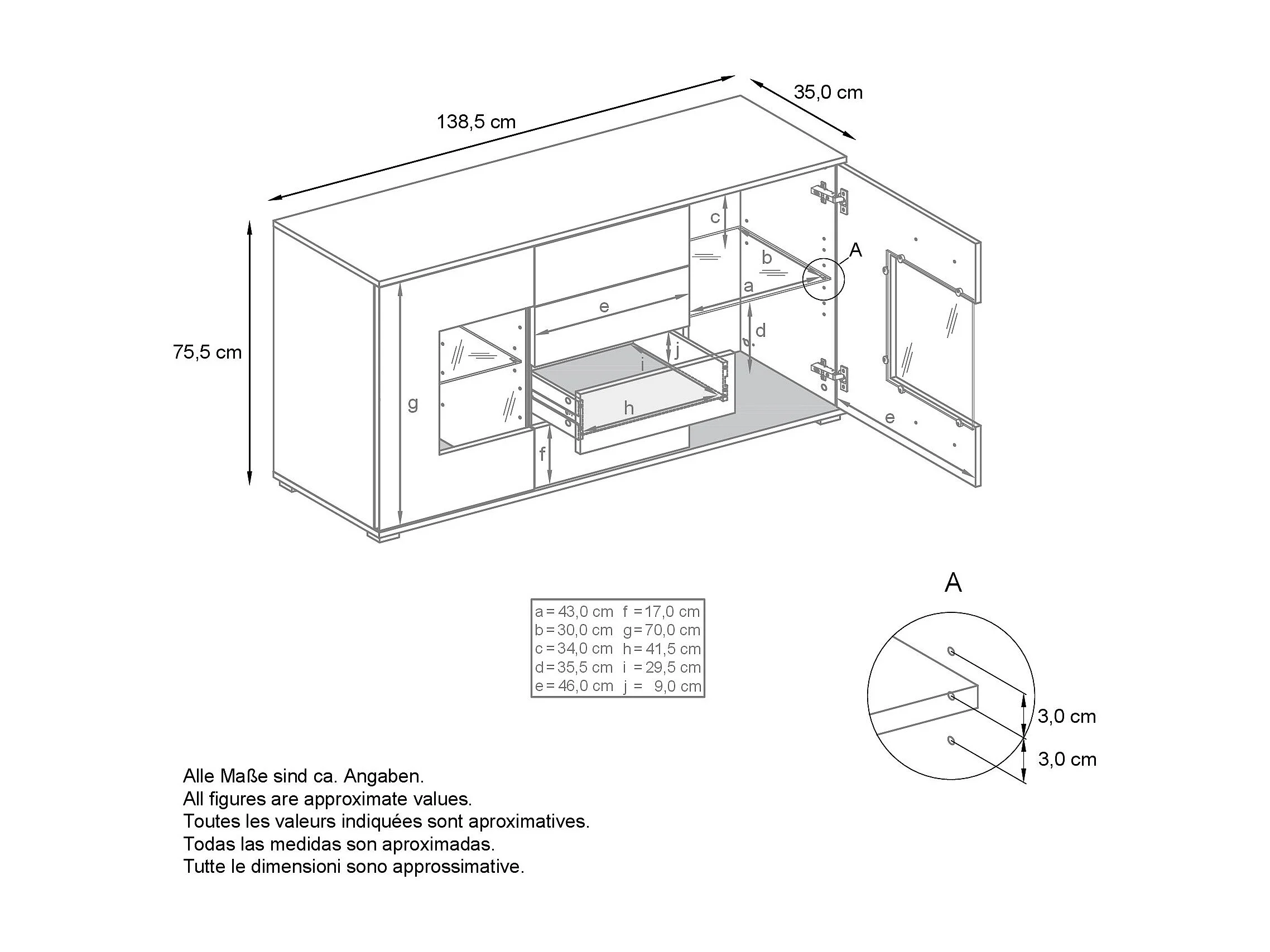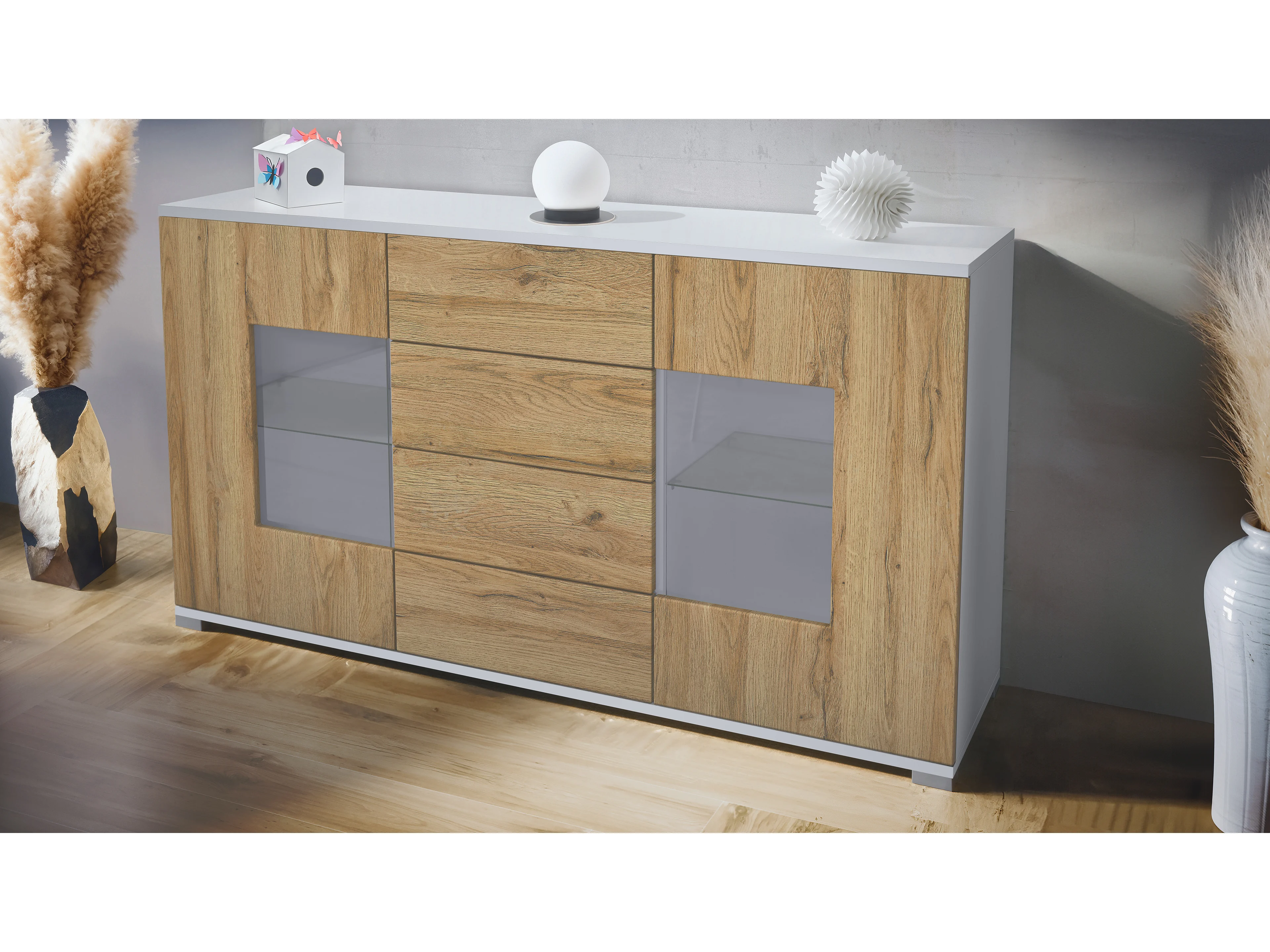 Buffet Grömitz V1 – Meuble avec 2 Grandes Portes et 4 Tiroirs, blanc mat/chêne nature (138,5 x 75,5 x 35)