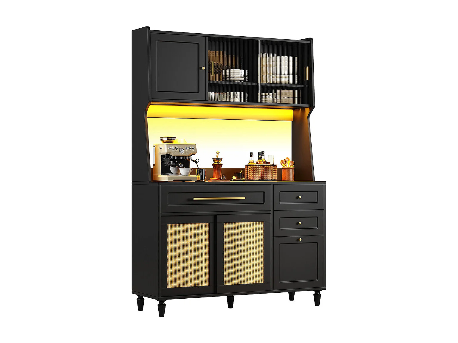 Buffet haut armoire haute vitrine étagères réglables armoire salle à manger 3 tiroirs éclairage LED rotin PE noir