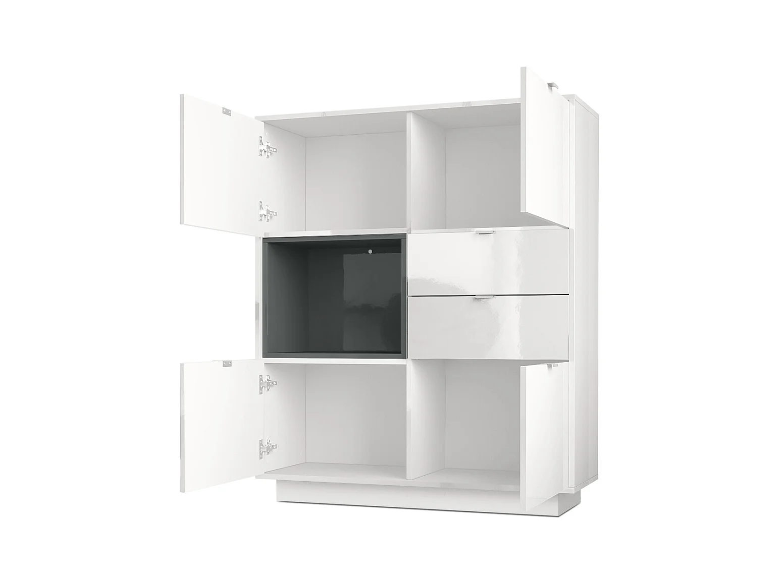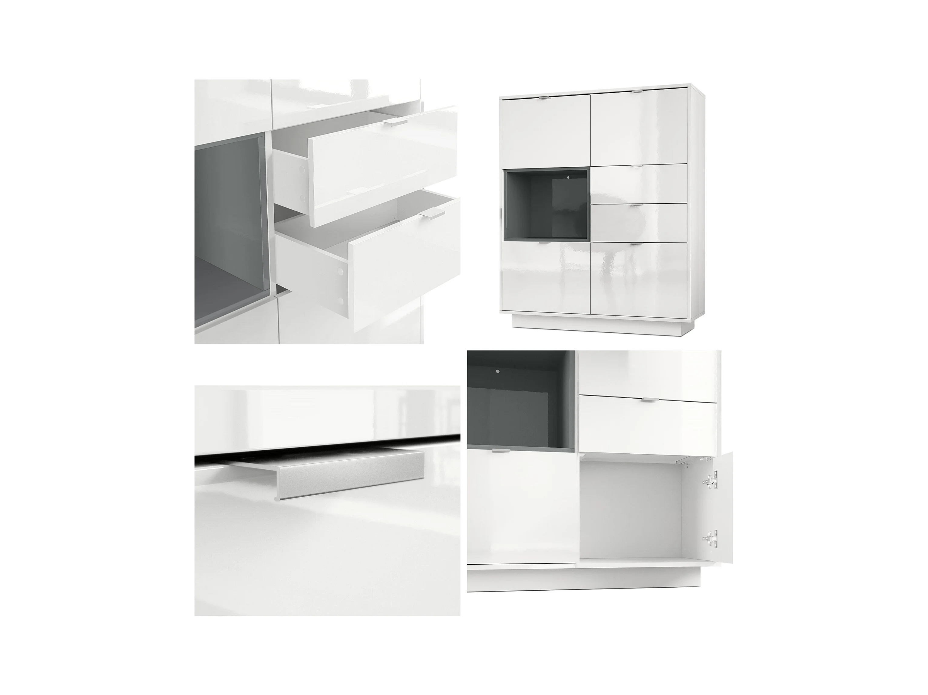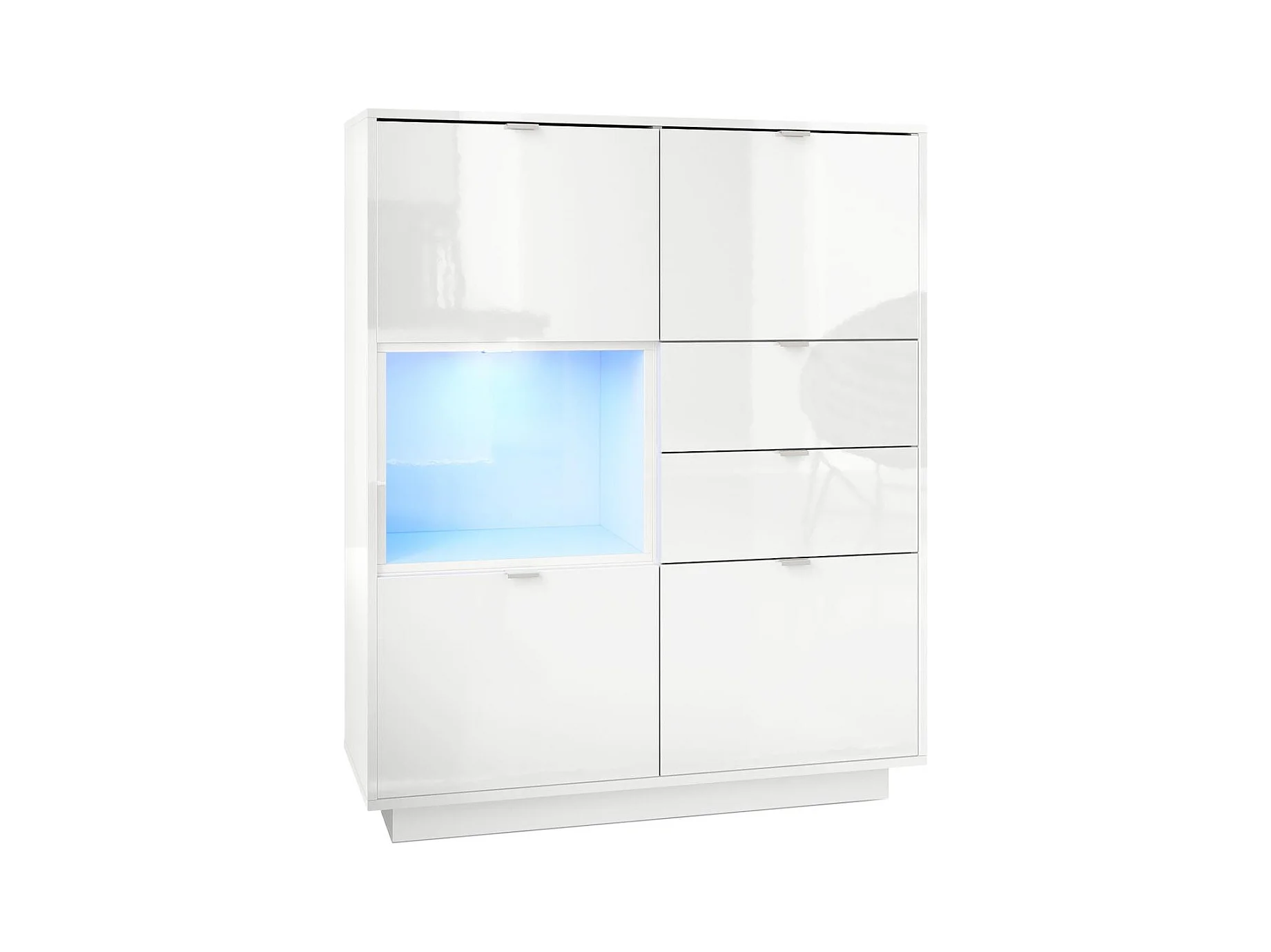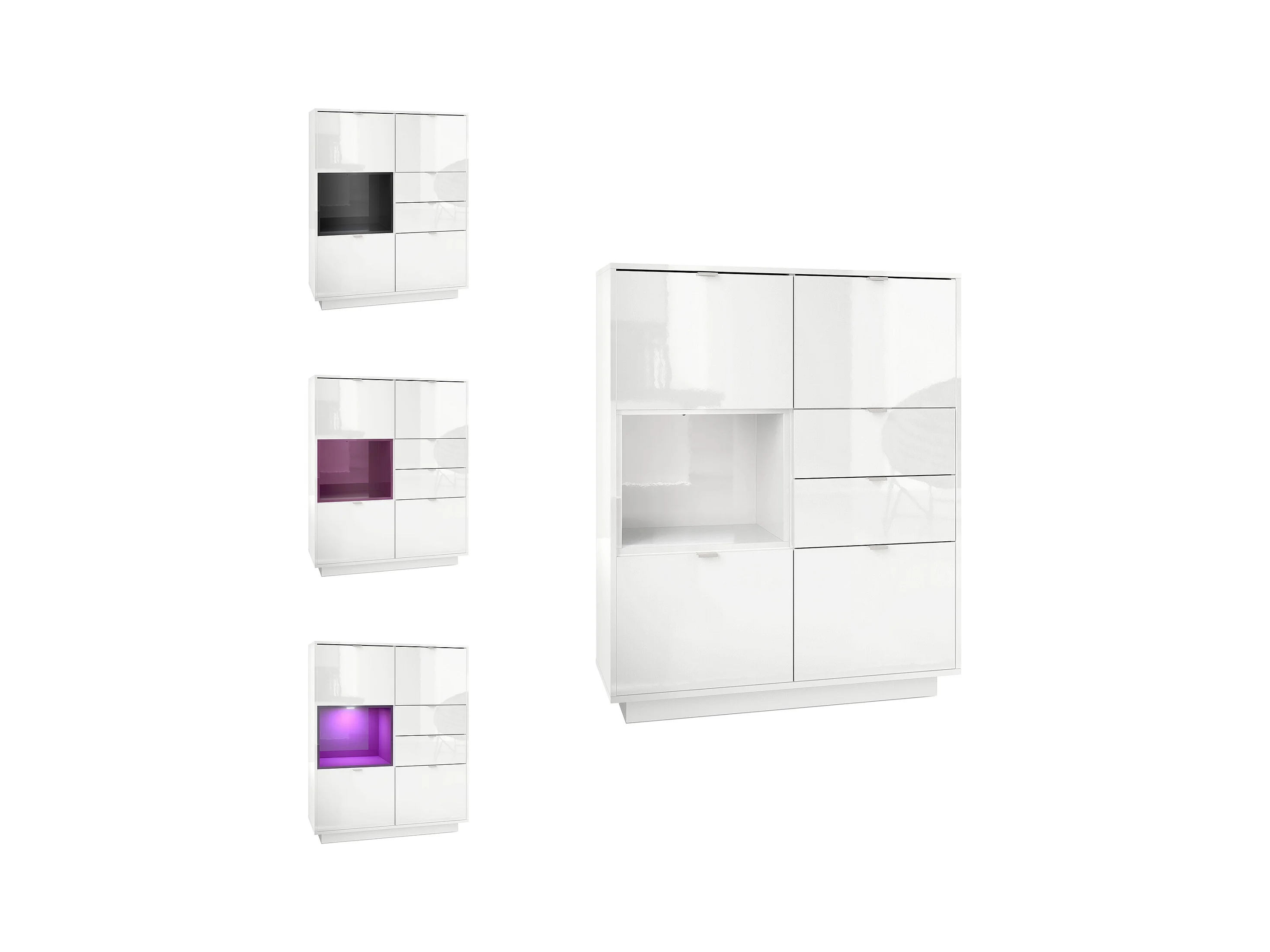 Buffet haut Armoire Metro, Corps en Blanc haute brillance / Façades en Blanc haute brillance avec une insertion en Blanc haute brillance, incl. L'éclairage LED