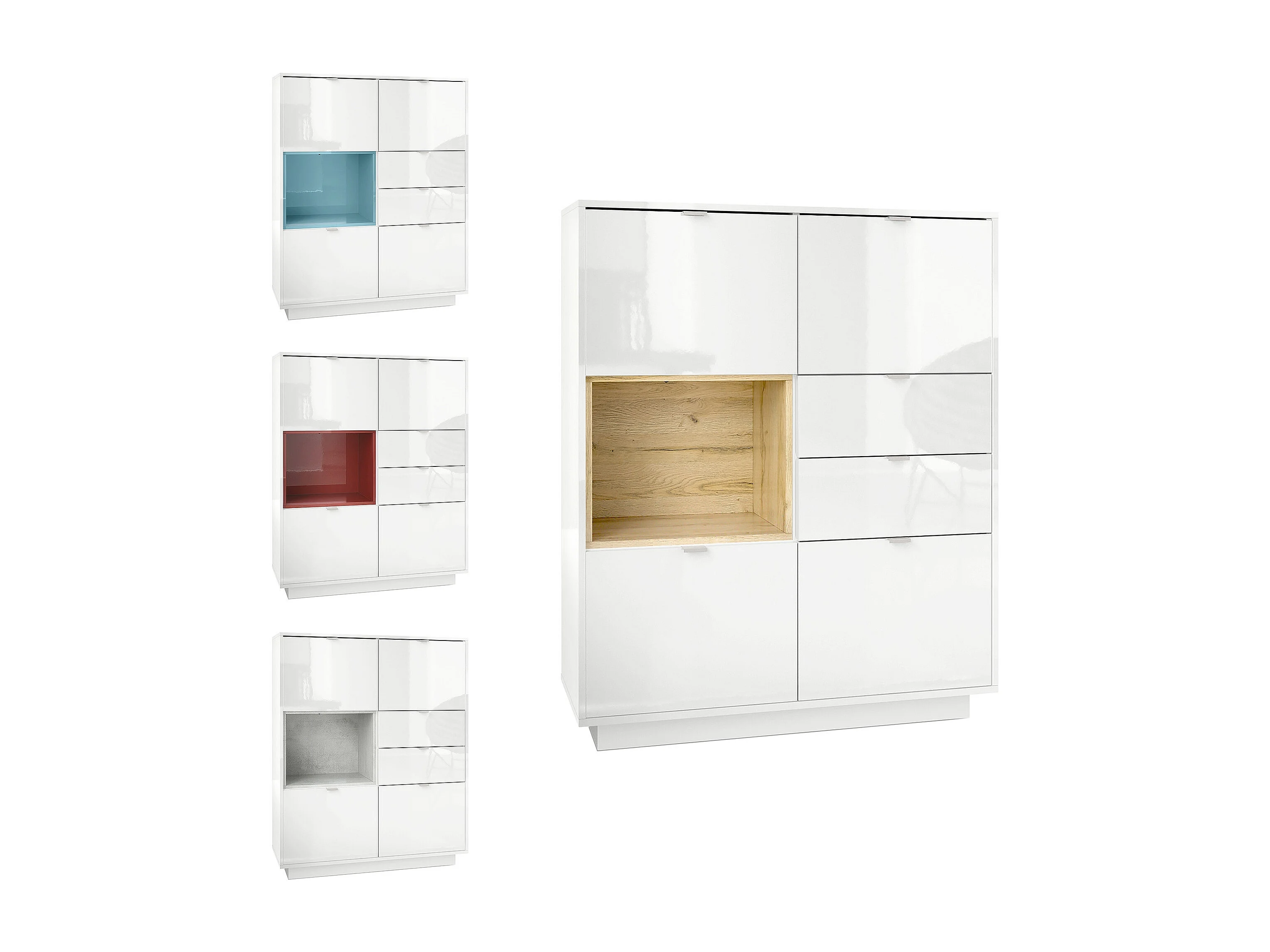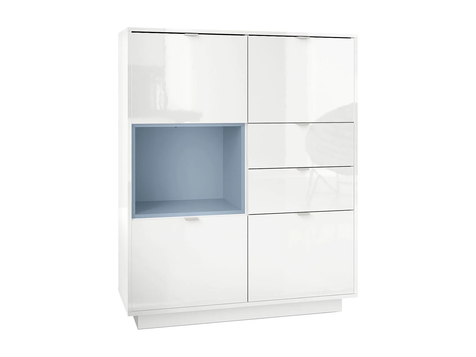 Buffet haut Armoire Metro, Corps en Blanc haute brillance / Façades en Blanc haute brillance avec une insertion en Denim mat