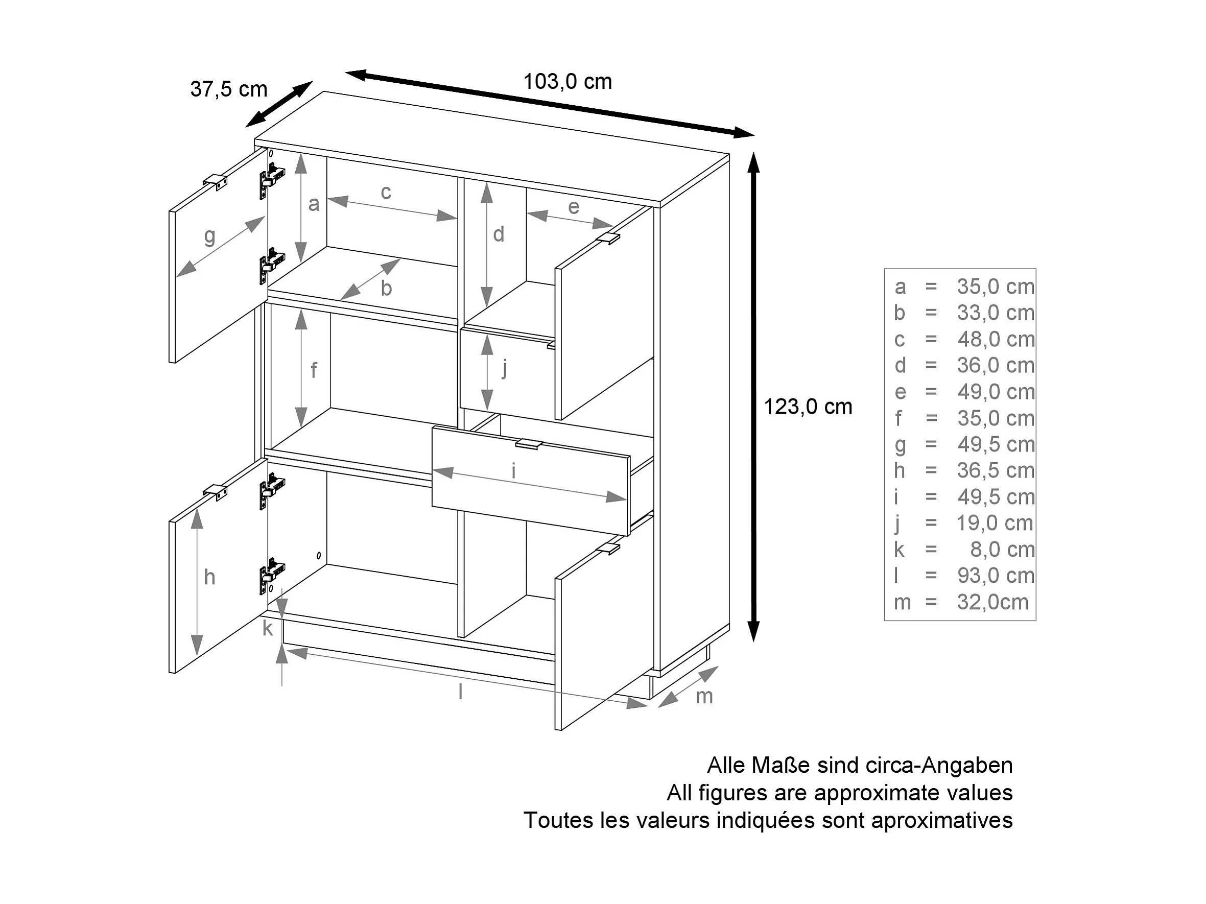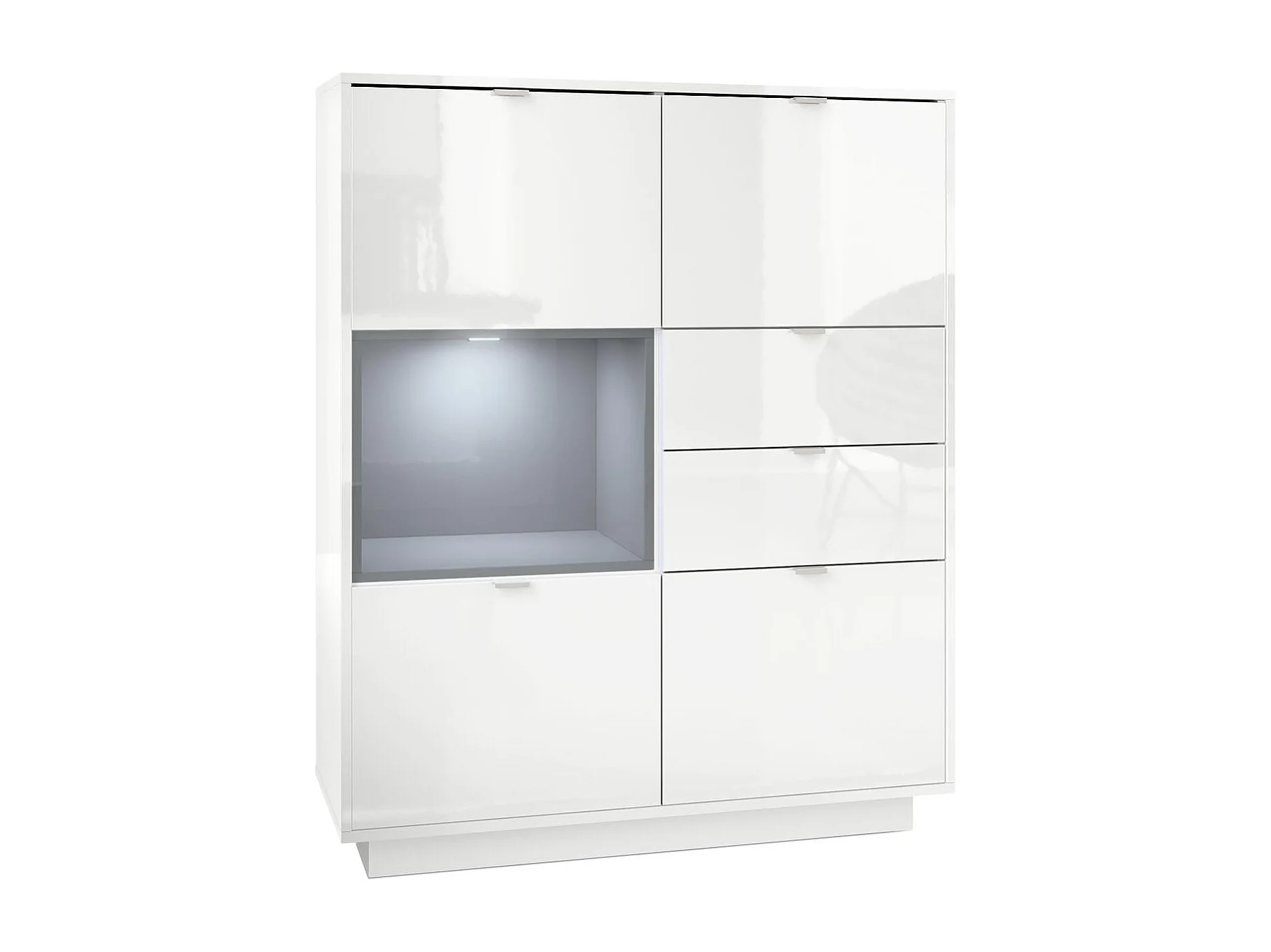 Buffet haut Armoire Metro, Corps en Blanc haute brillance / Façades en Blanc haute brillance avec une insertion en Gris haute brillance, incl. L'éclairage LED