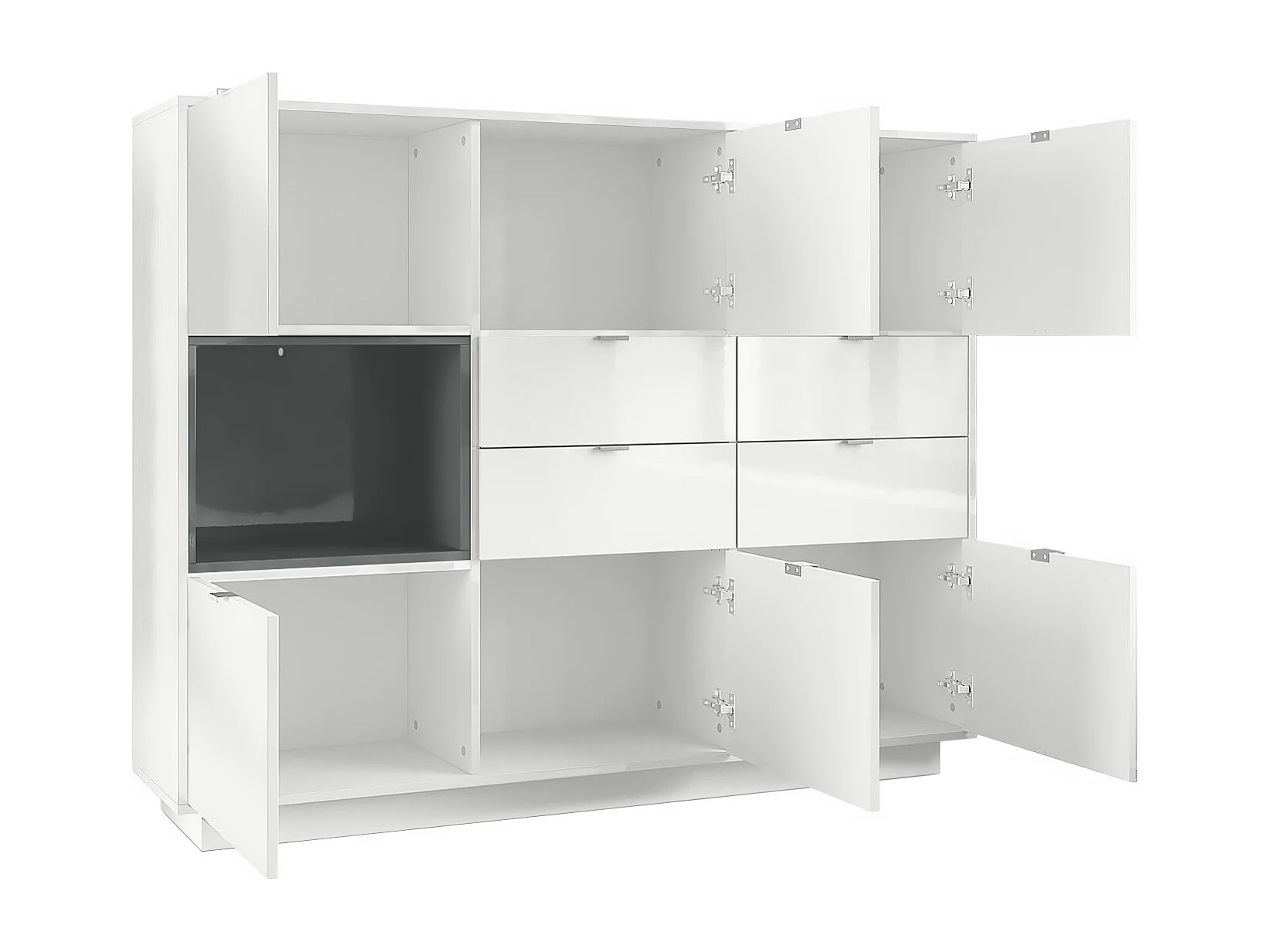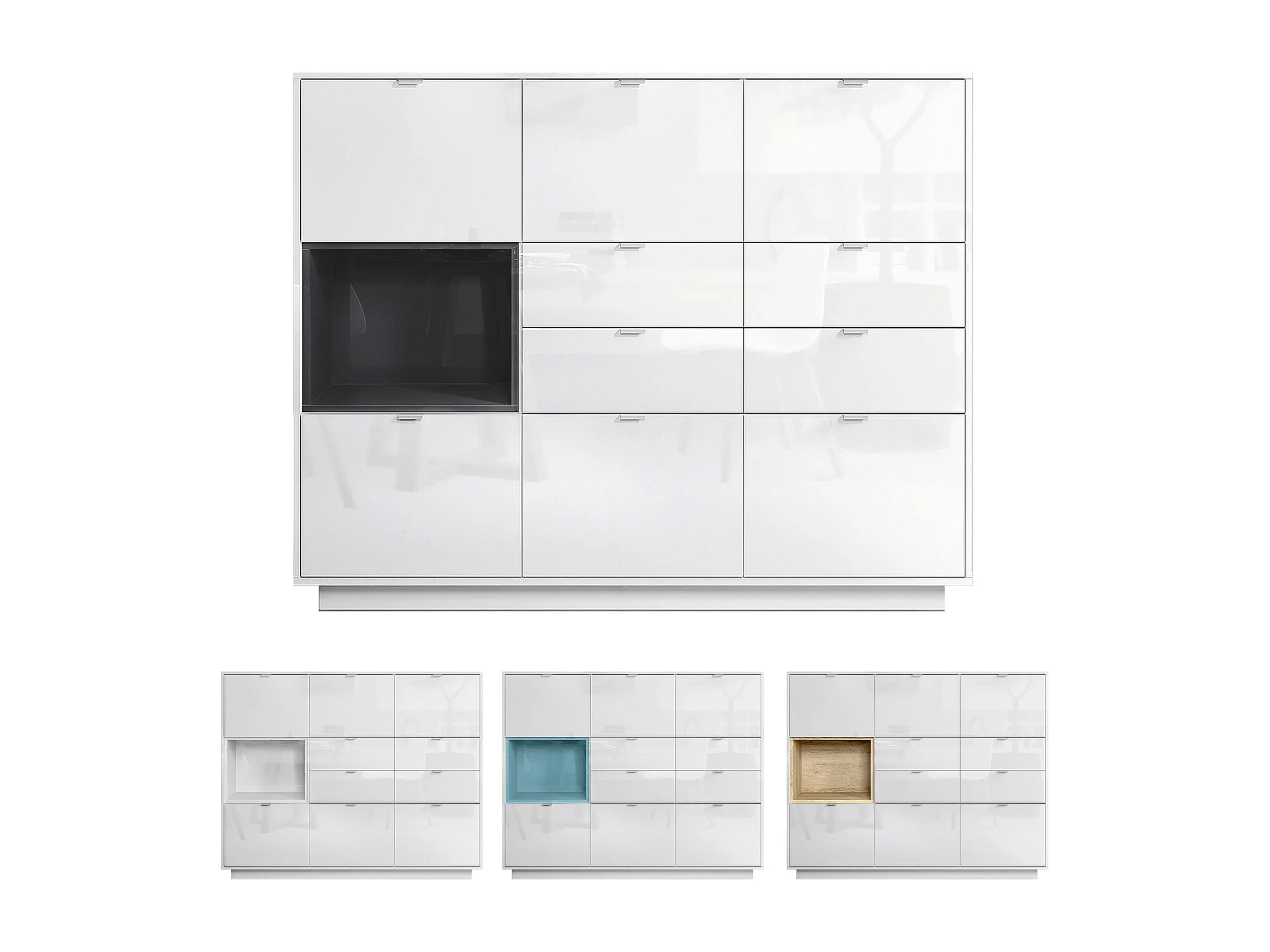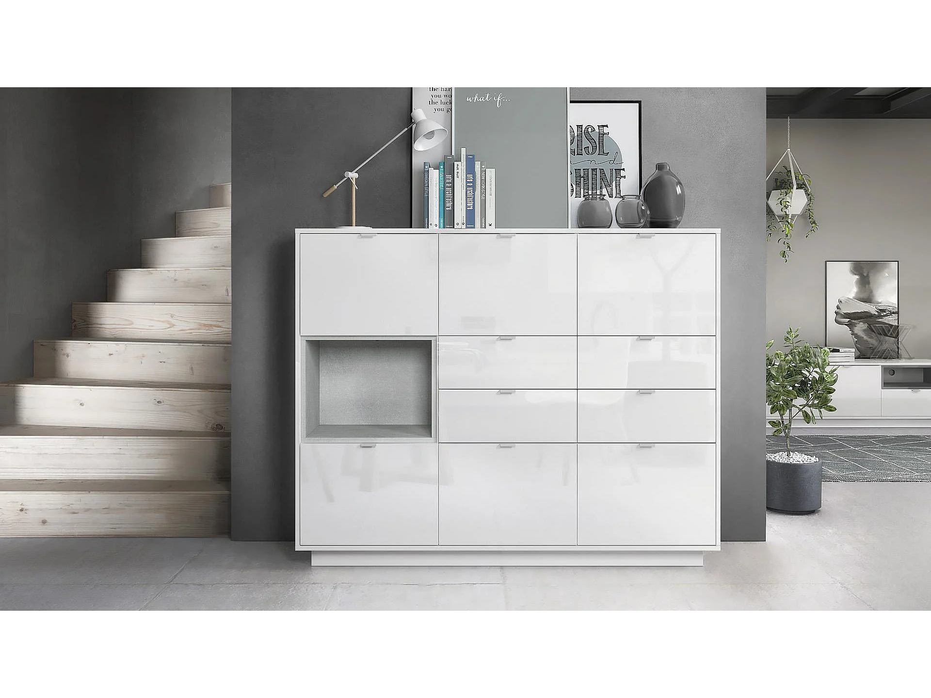 Buffet haut Armoire Metro V2, Corps en Blanc haute brillance / Façades en Blanc haute brillance avec une insertion en Aspect Béton Oxyde, incl. L'éclairage LED