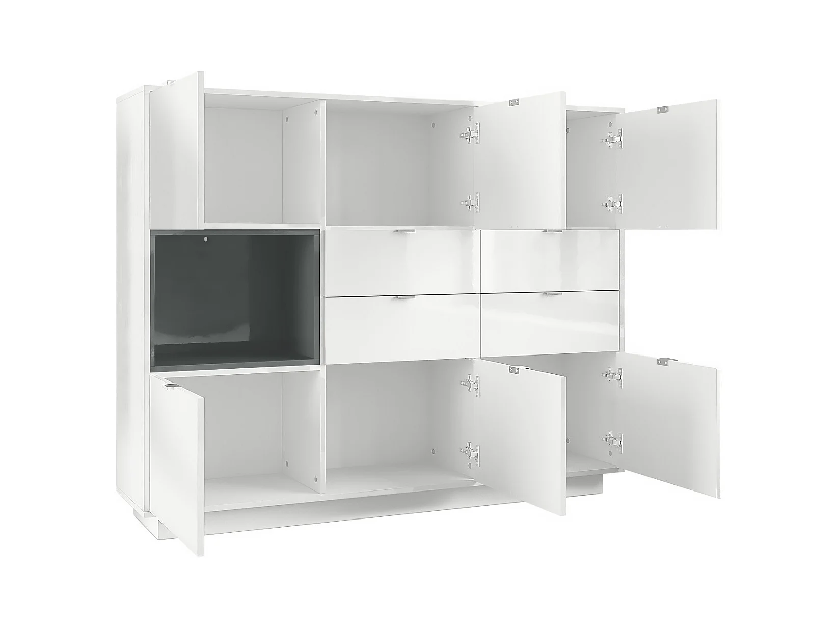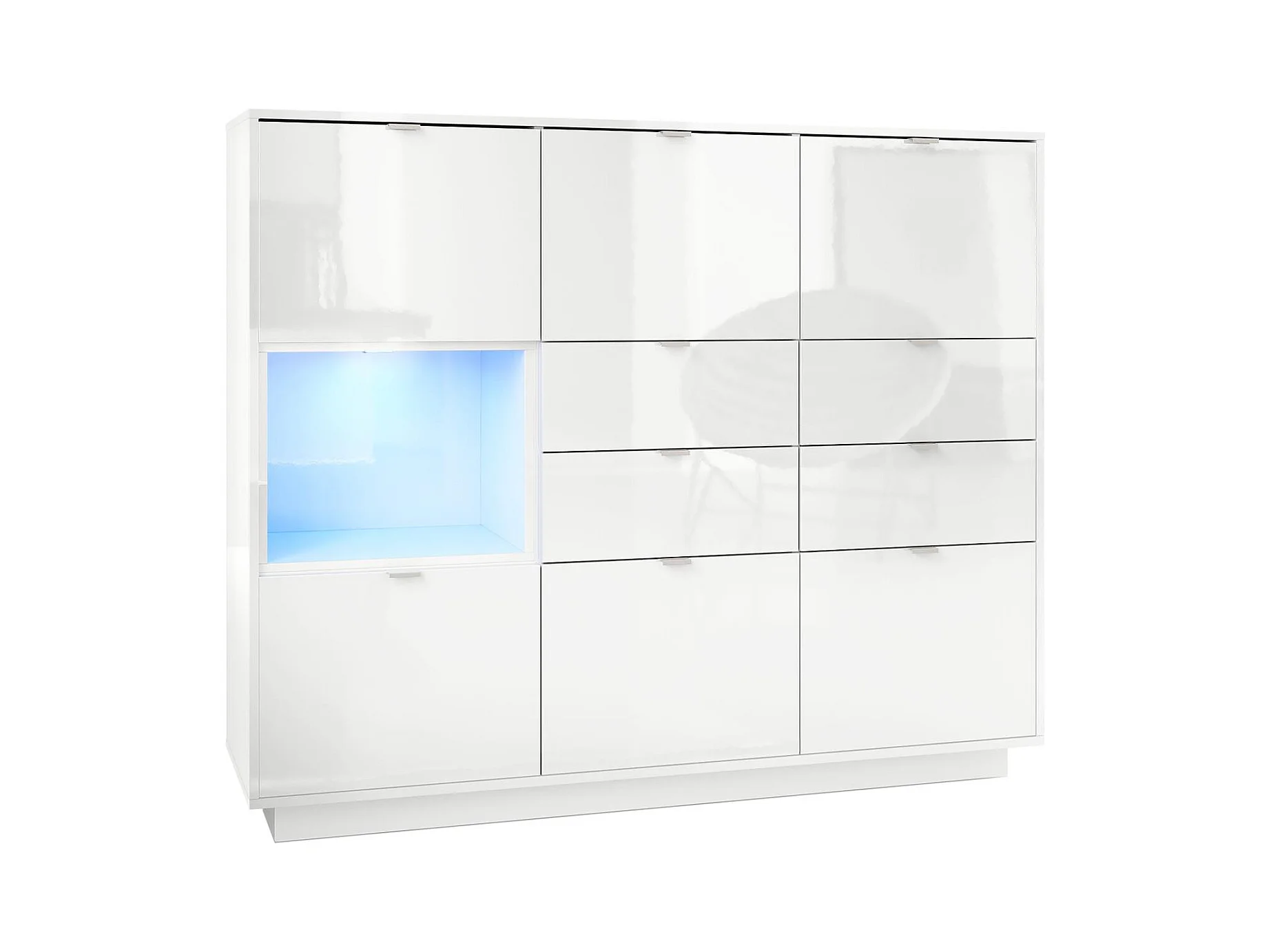 Buffet haut Armoire Metro V2, Corps en Blanc haute brillance / Façades en Blanc haute brillance avec une insertion en Blanc haute brillance, incl. L'éclairage LED