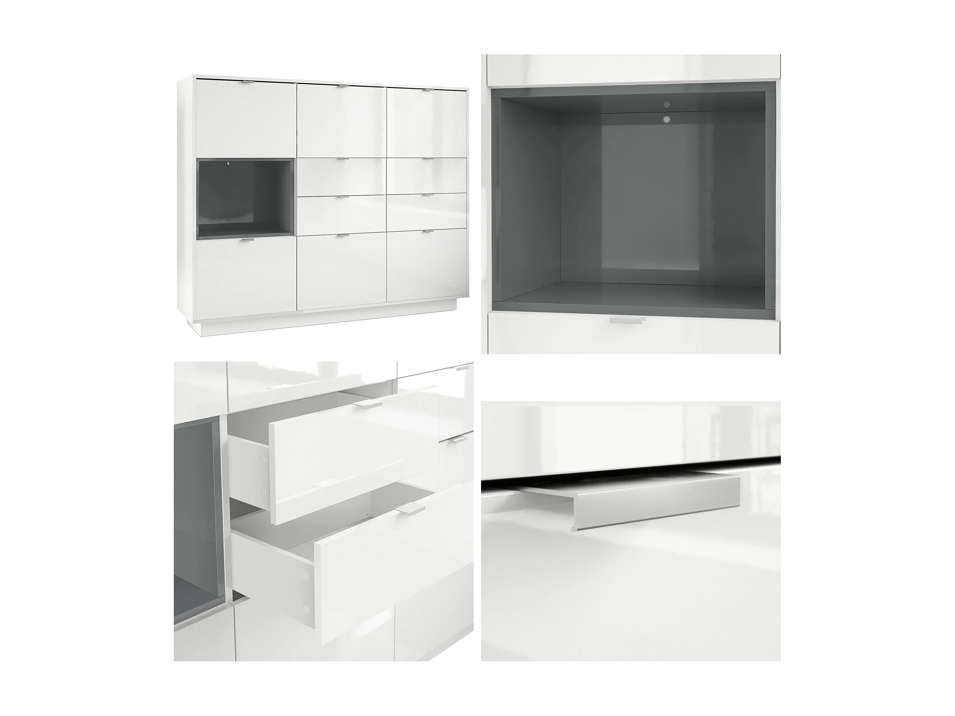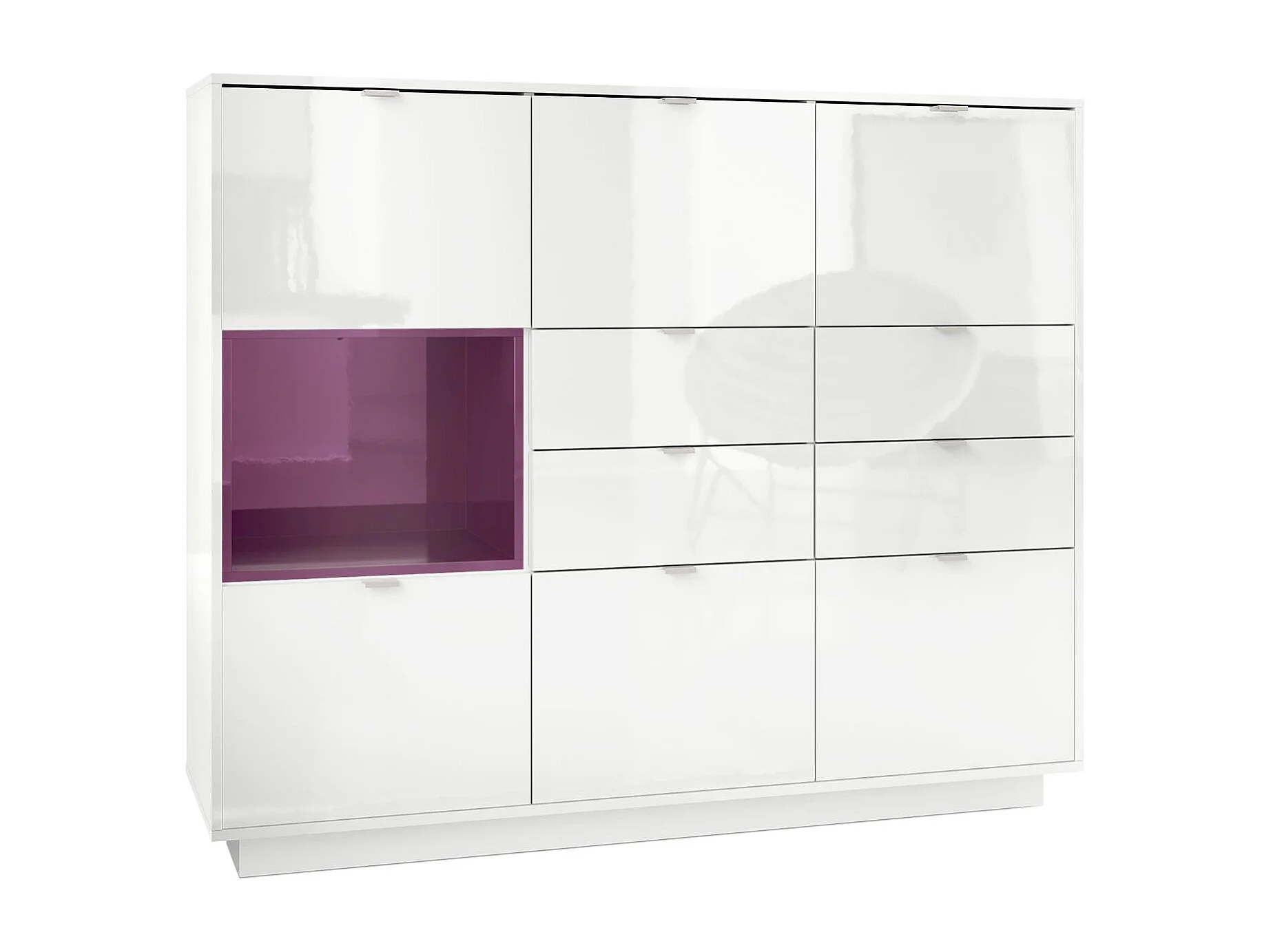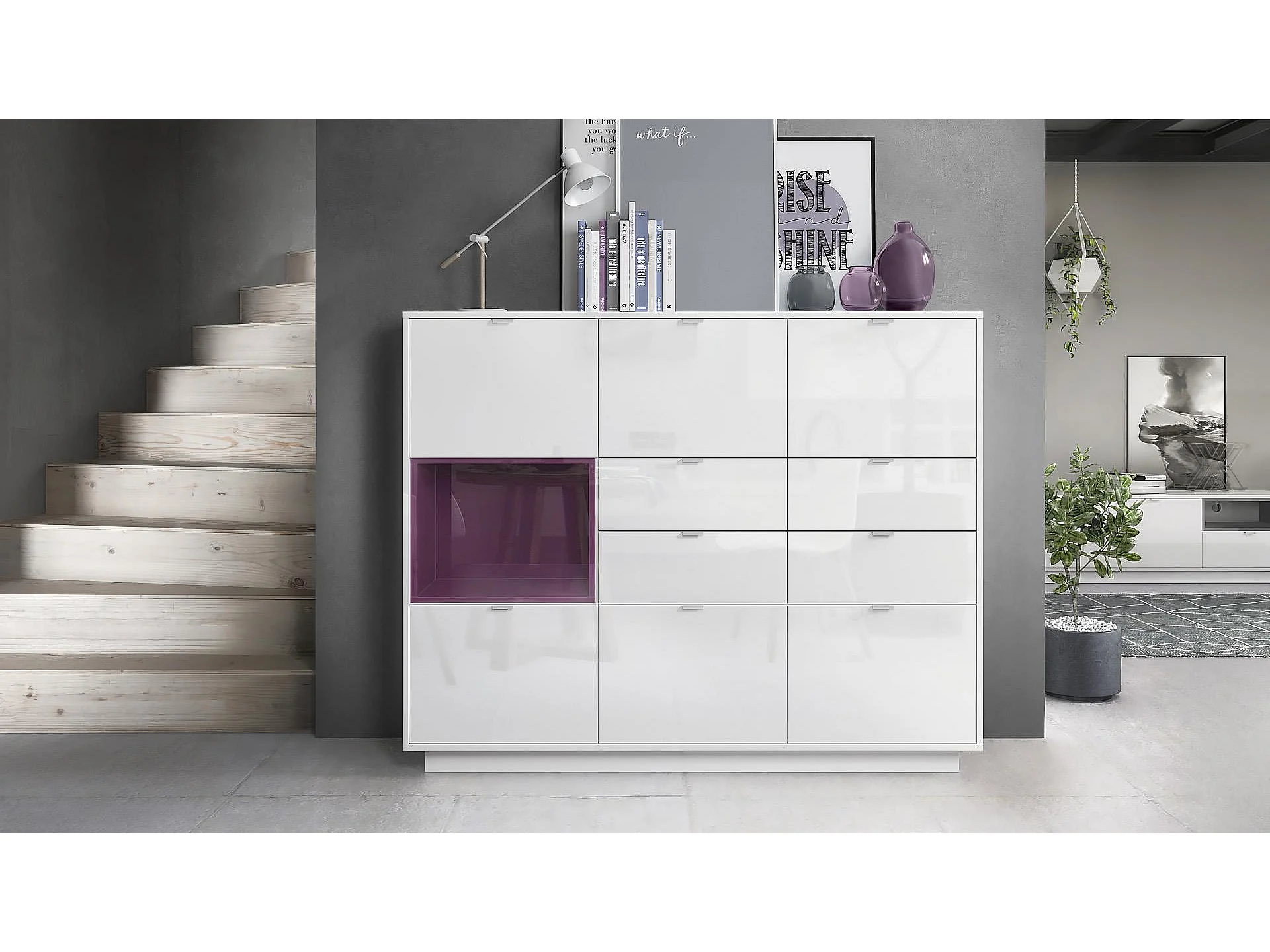 Buffet haut Armoire Metro V2, Corps en Blanc haute brillance / Façades en Blanc haute brillance avec une insertion en Mûre haute brillance