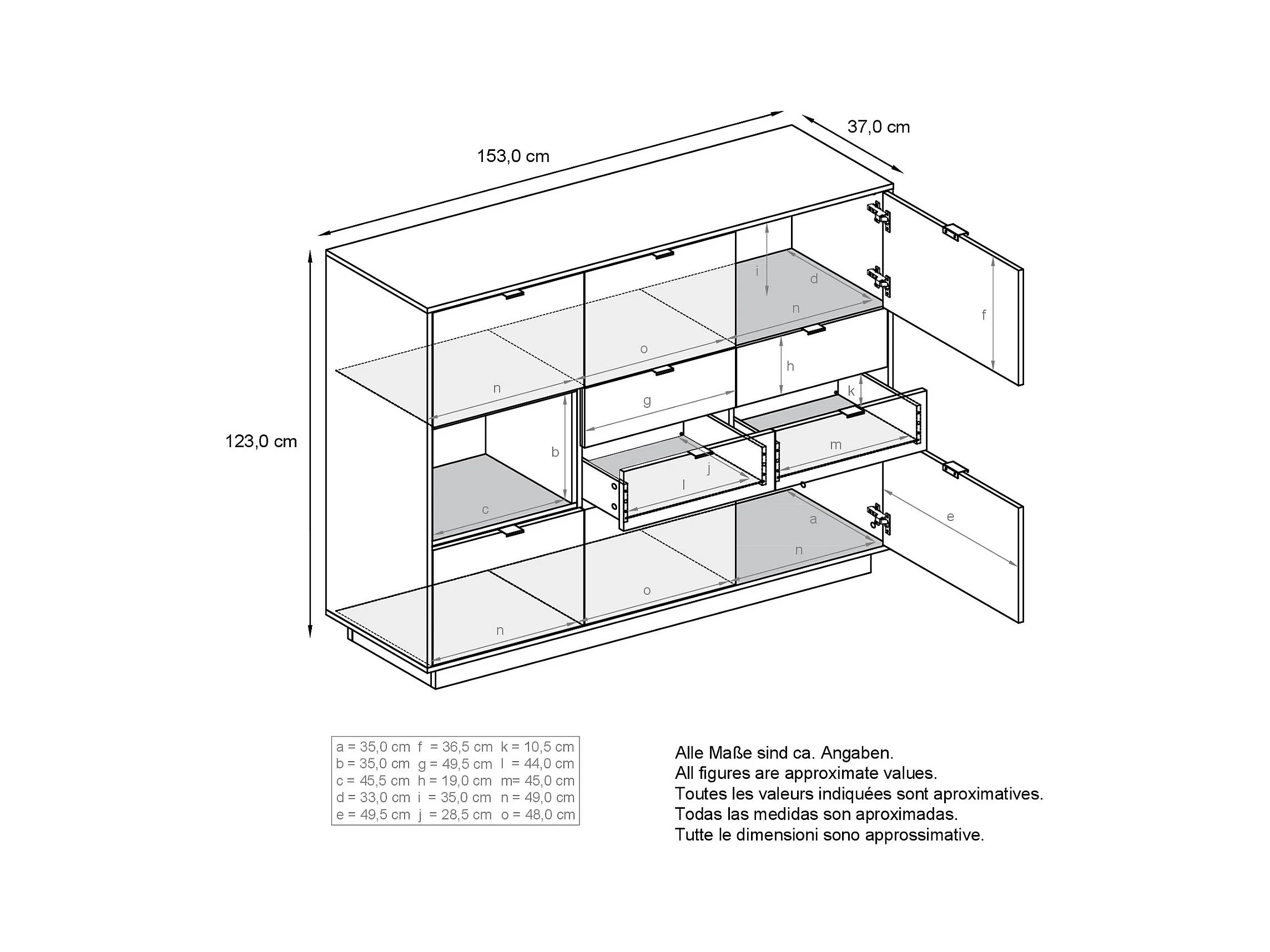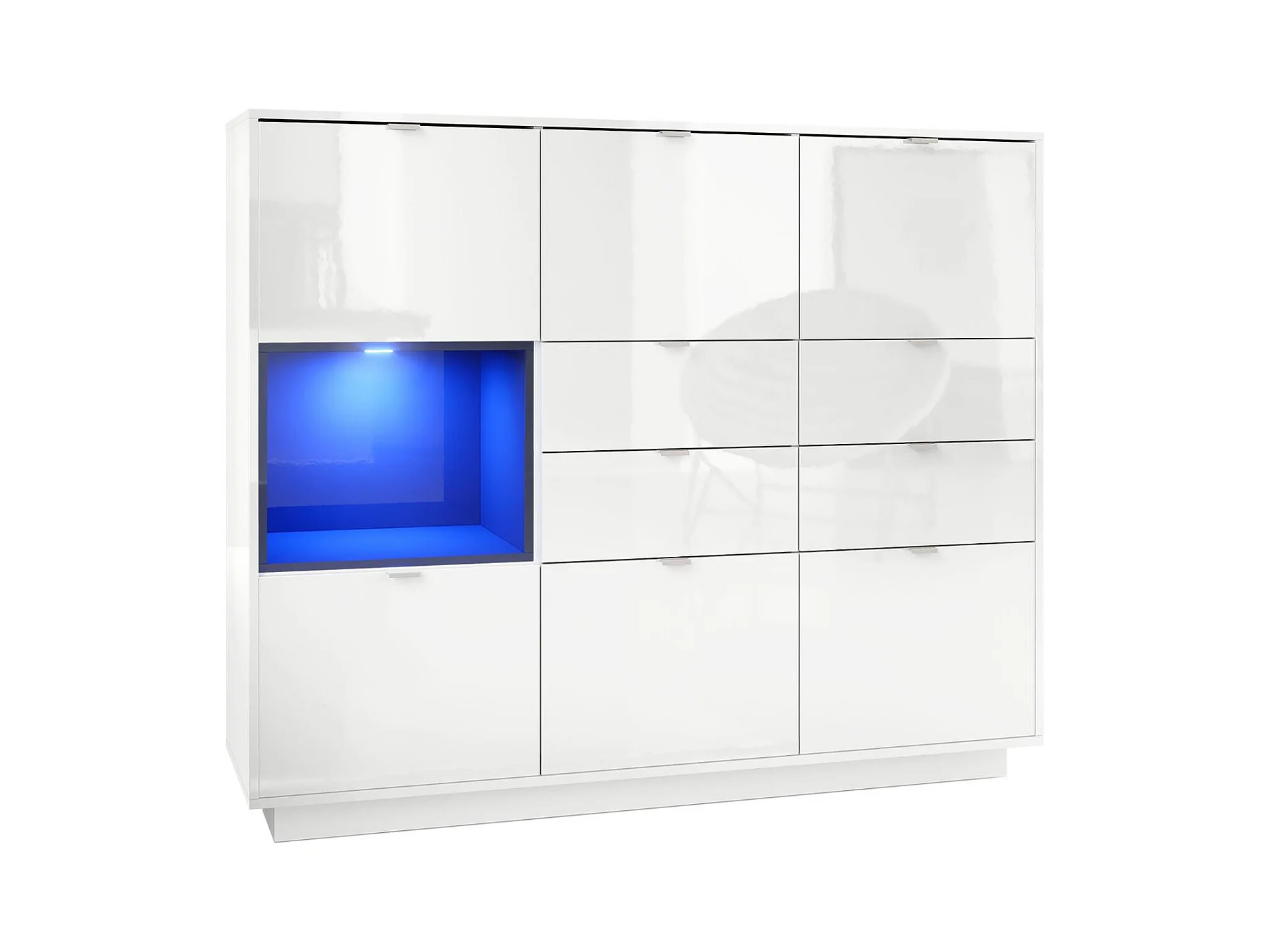 Buffet haut Armoire Metro V2, Corps en Blanc haute brillance / Façades en Blanc haute brillance avec une insertion en Noir haute brillance, incl. L'éclairage LED