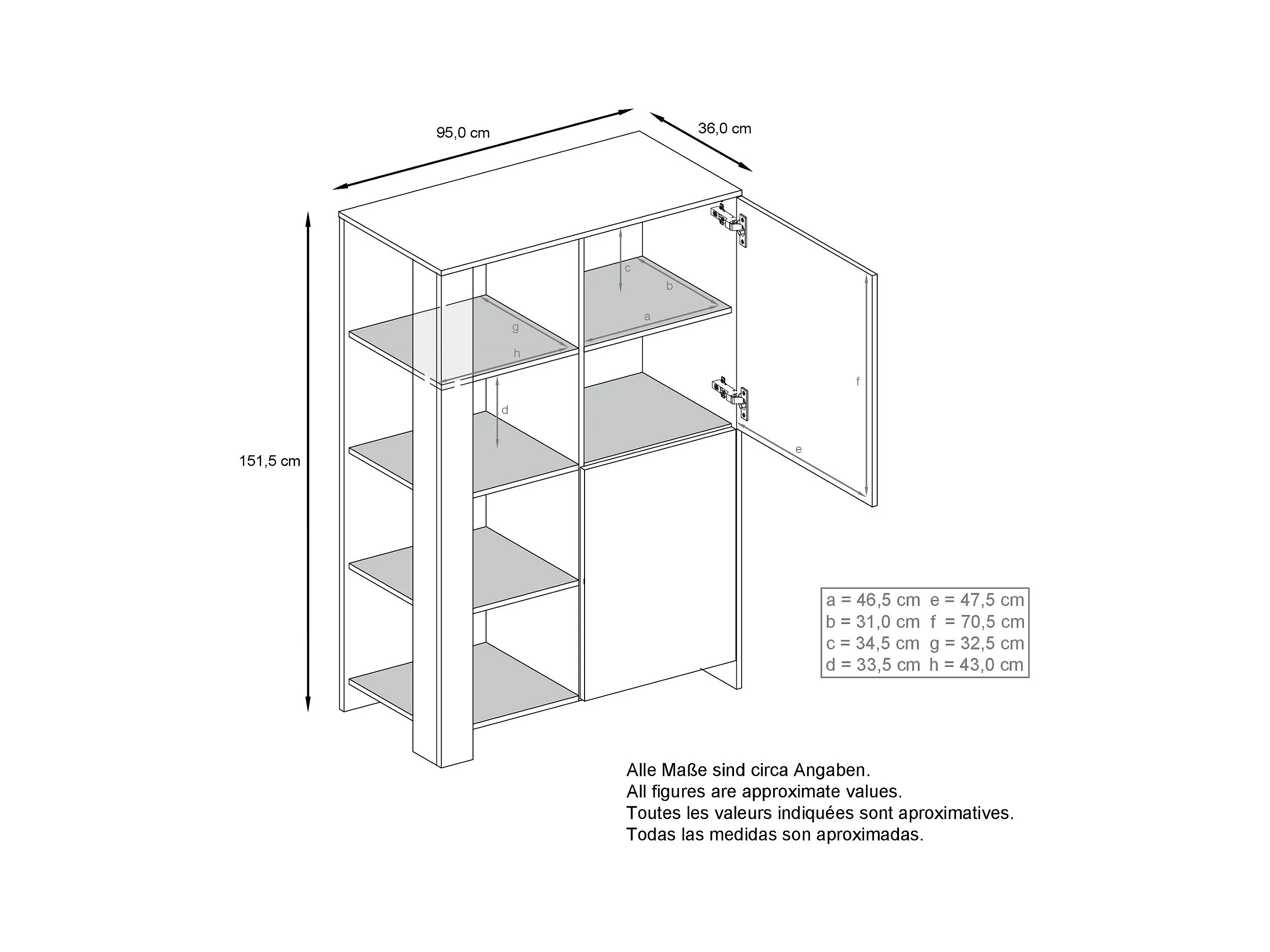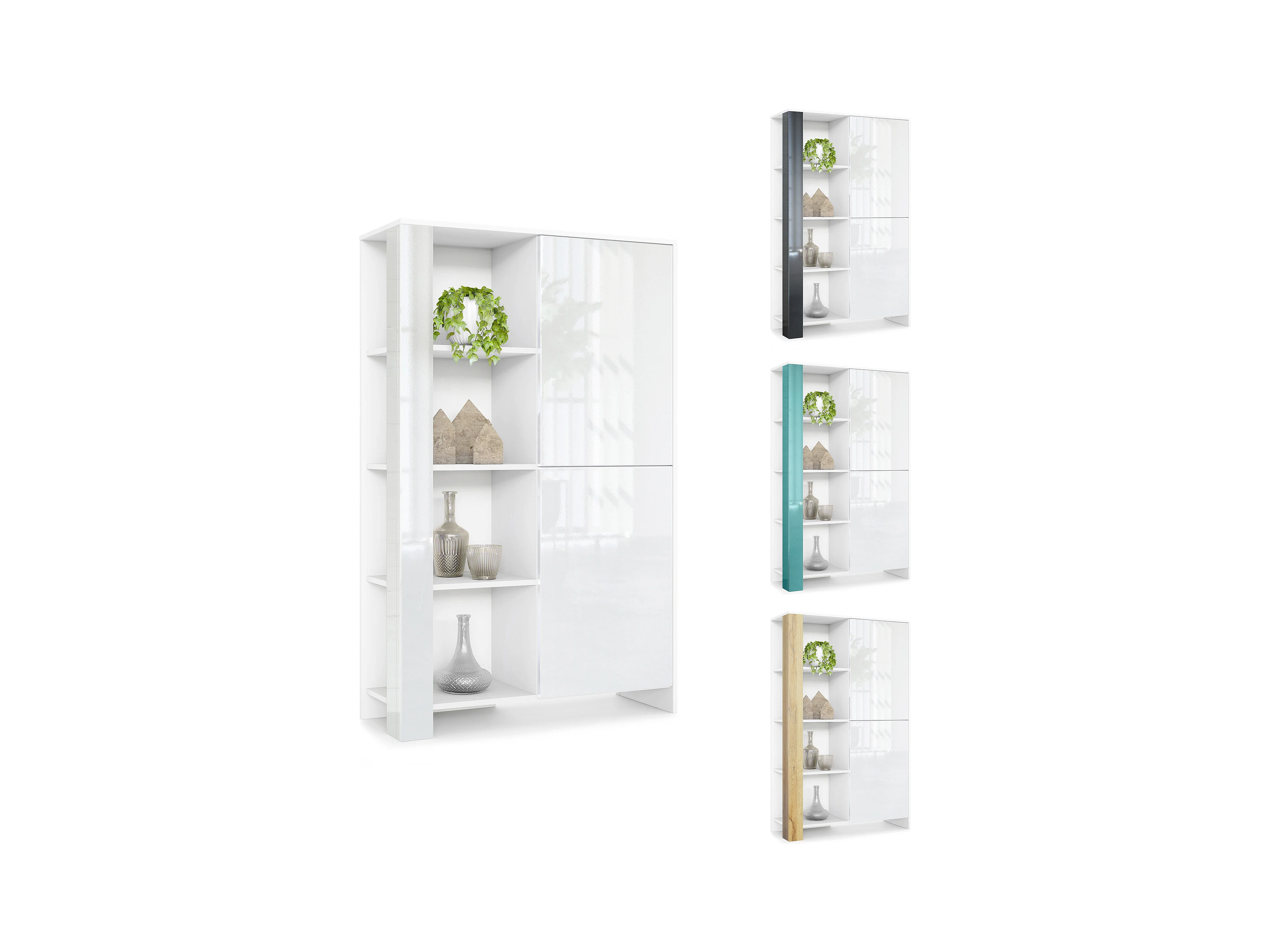 Buffet Haut Canto, meuble haut avec 2 portes et 8 compartiments, corps blanc mat, façades blanc brillant, panneaux décoratifs Blanc brillant (95 x 151,5 x 36 cm)