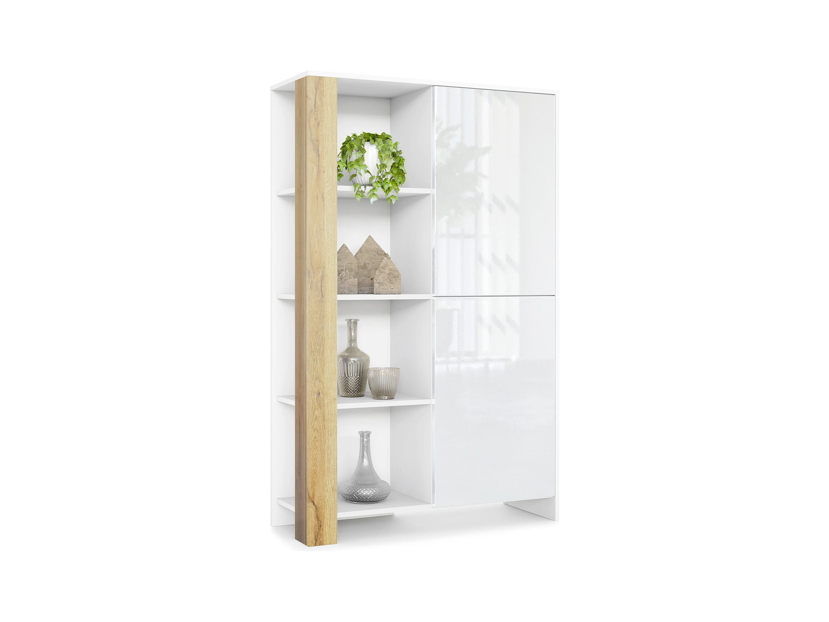 Buffet Haut Canto, meuble haut avec 2 portes et 8 compartiments, corps blanc mat, façades blanc brillant, panneaux décoratifs chêne nature (95 x 151,5 x 36 cm)