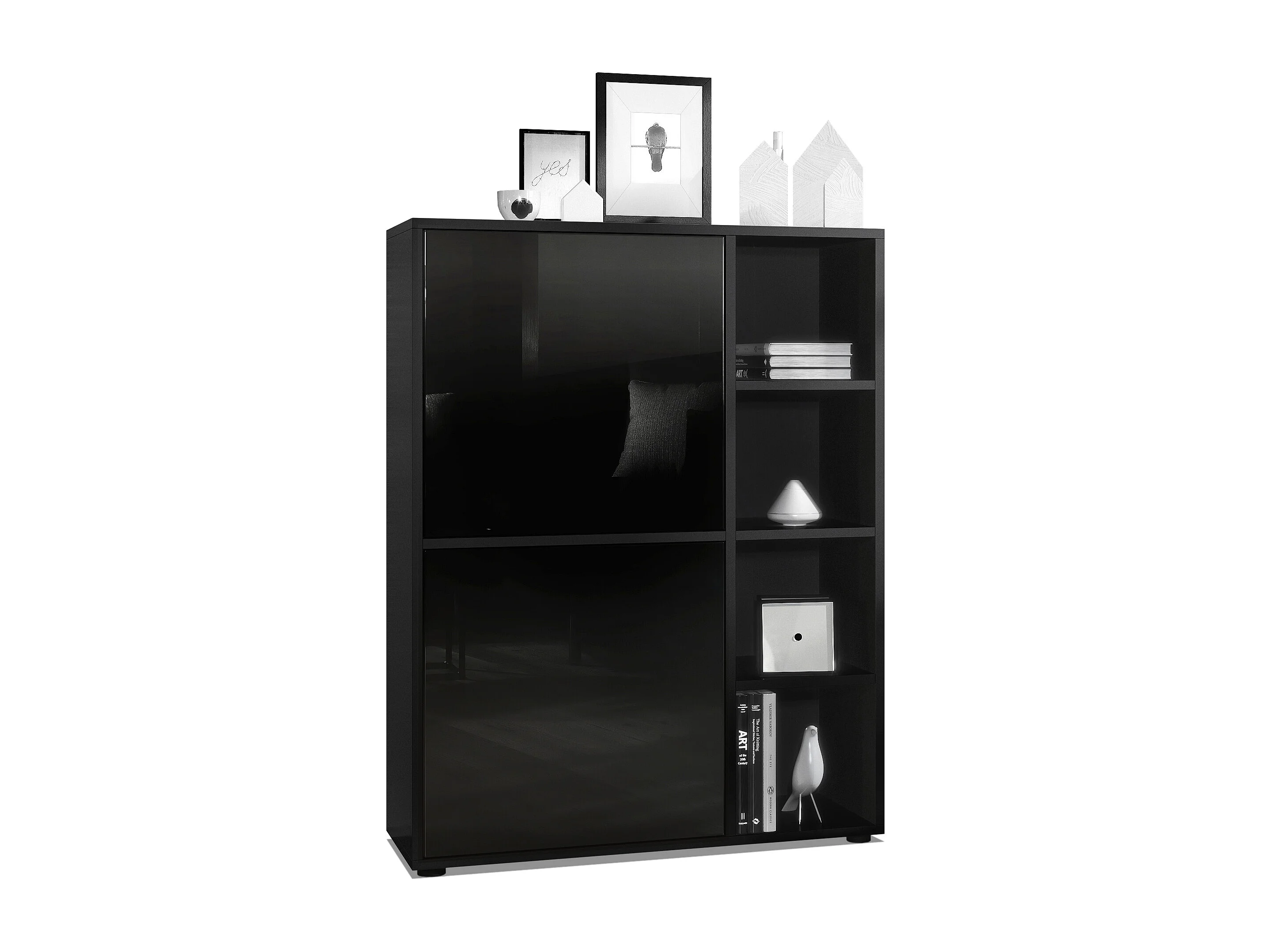 Buffet haut Cuba avec 8 compartiments, caisson en noir mat / Façades en Noir laqué haute brillance