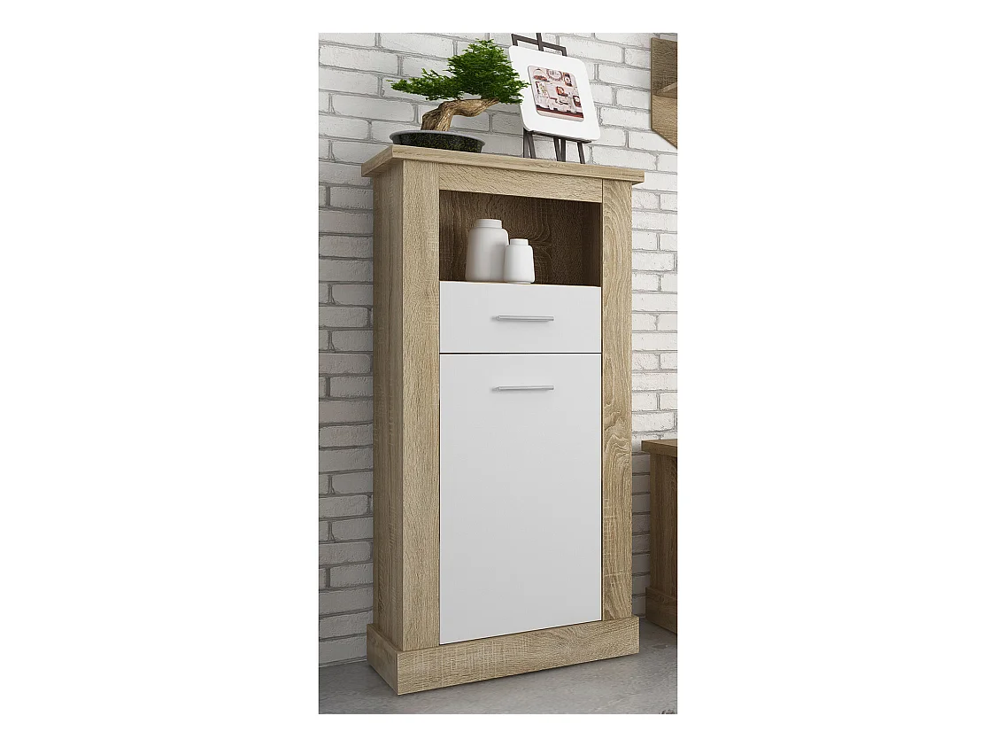 Buffet haut, meuble de rangement coloris Chêne cambrian, blanc - Longueur 66 x Profondeur 36,60 x Hauteur 135 cm