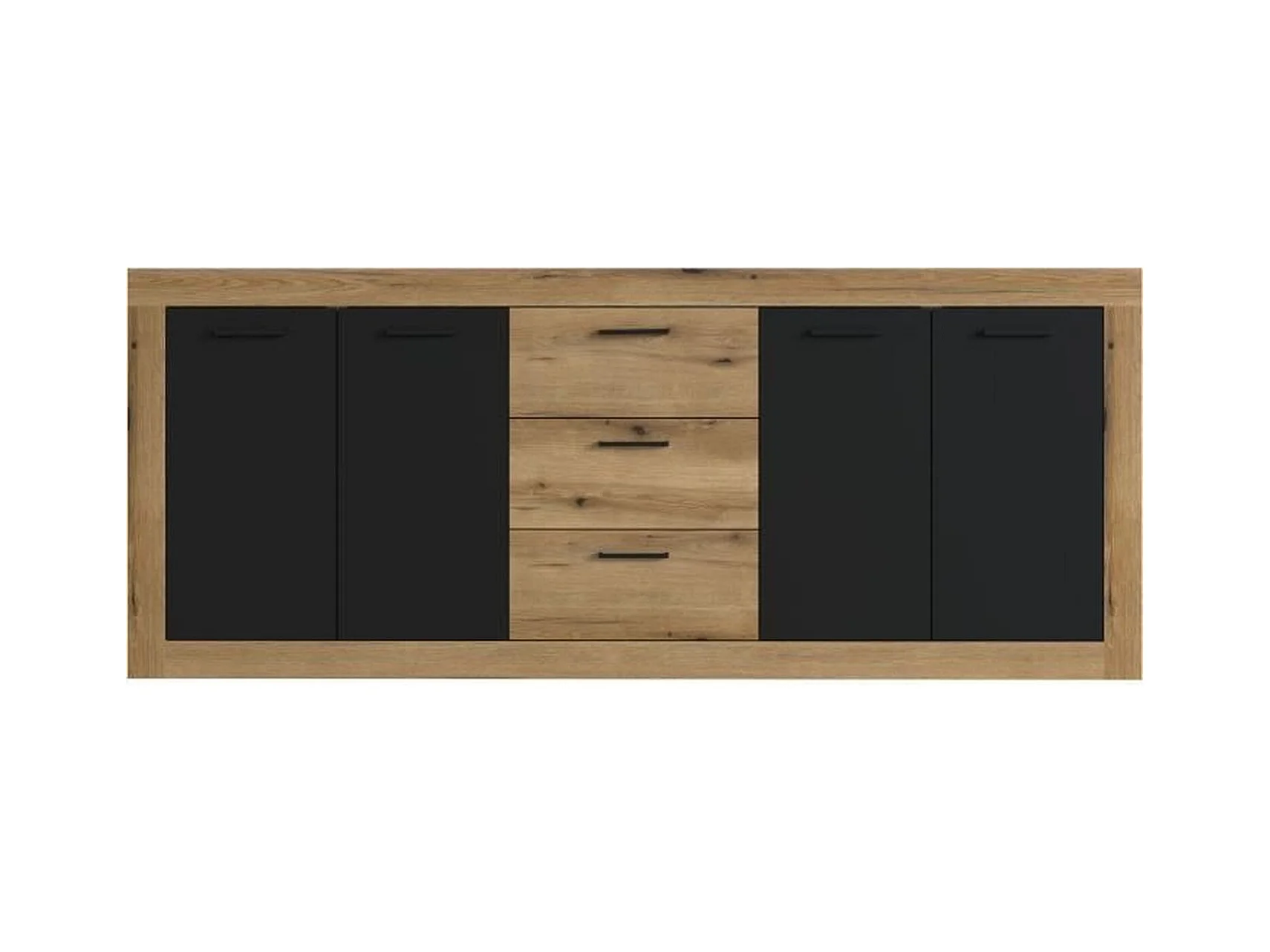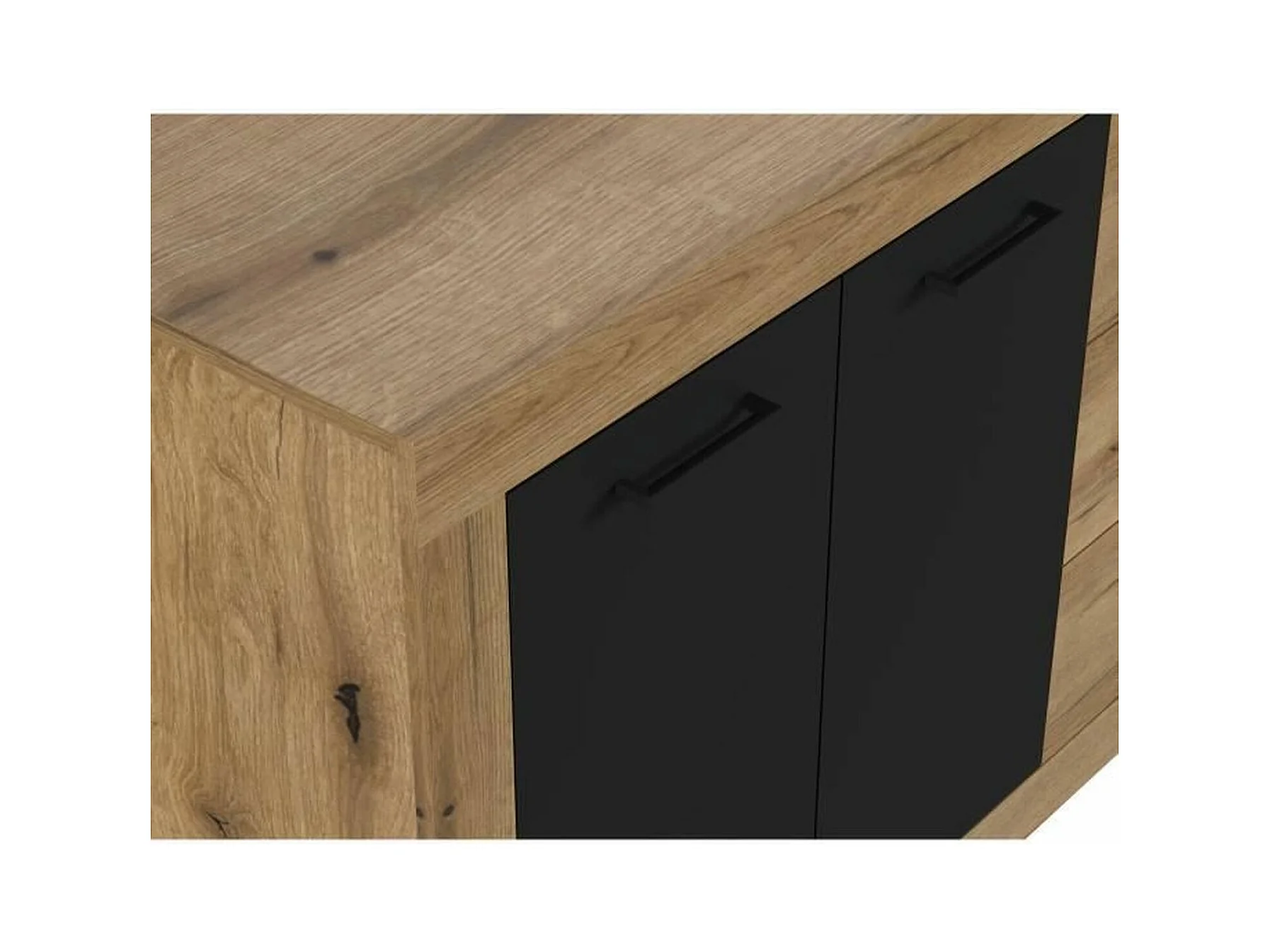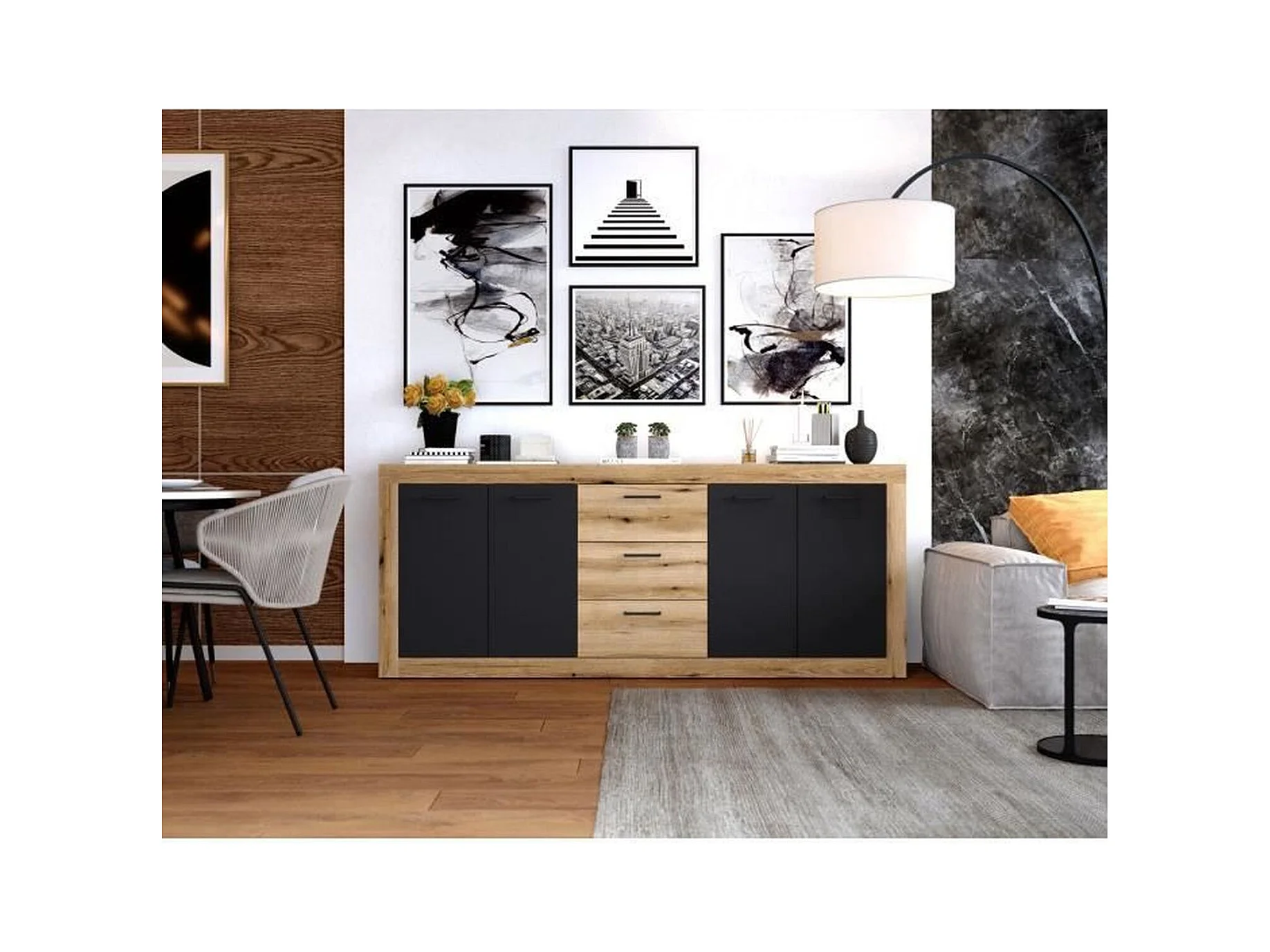 Buffet style industrile en mélaminé chêne et noir 4 portes + 3 tiroirs - 206 x 45 x 83,5 cm
