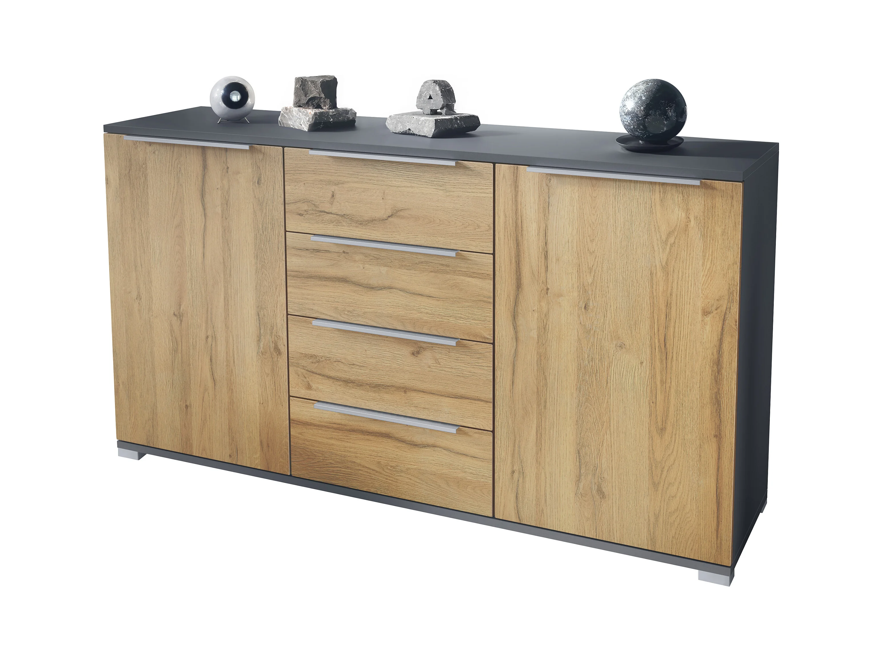 Buffet Linio V1, Enfilade avec 2 portes et 4 tiroirs, anthracite mat / chêne nature (138,5 x 75,5 x 35 cm)
