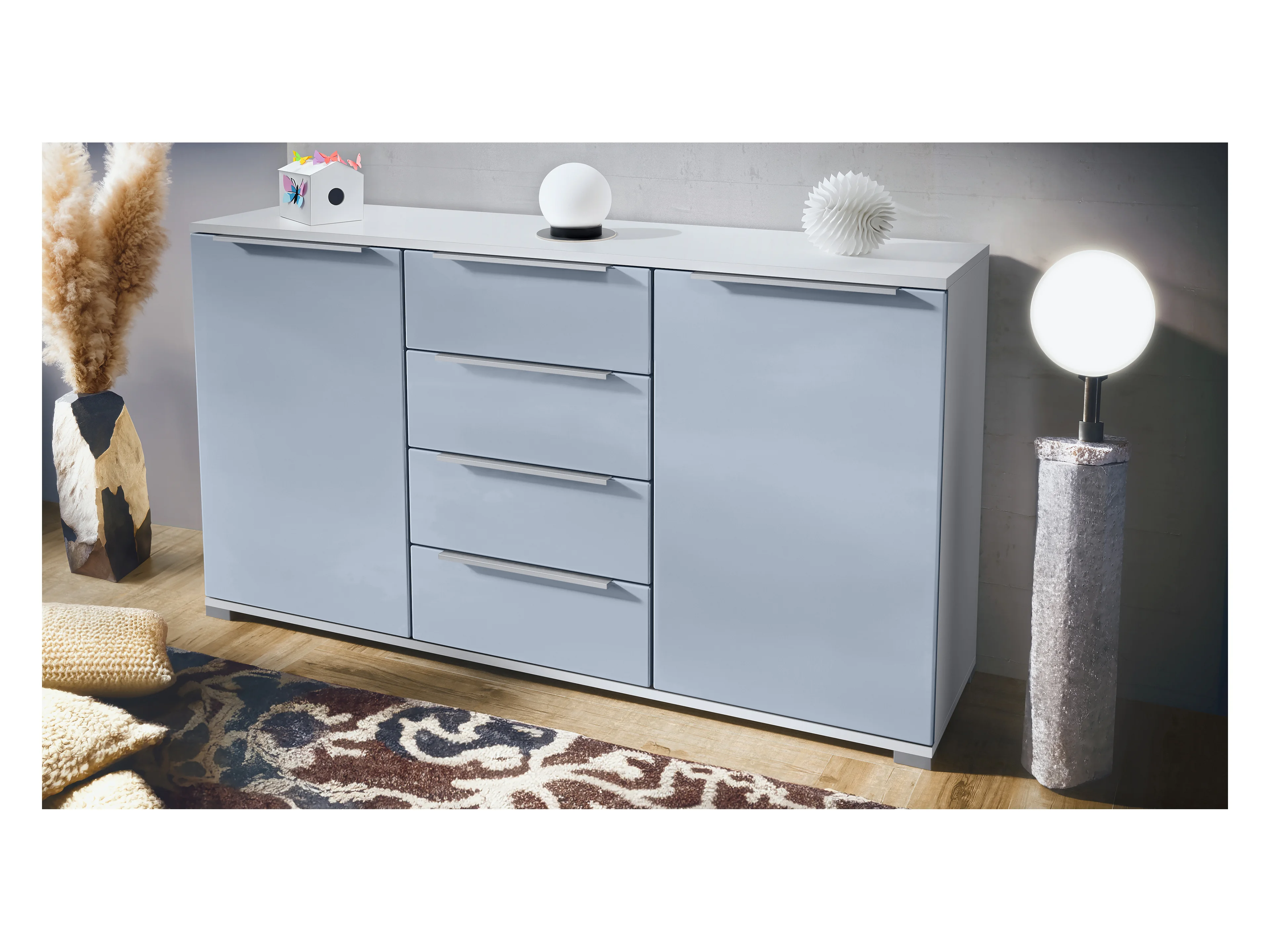 Buffet Linio V1, Enfilade avec 2 portes et 4 tiroirs, blanc mat / denim mat (138,5 x 75,5 x 35 cm)