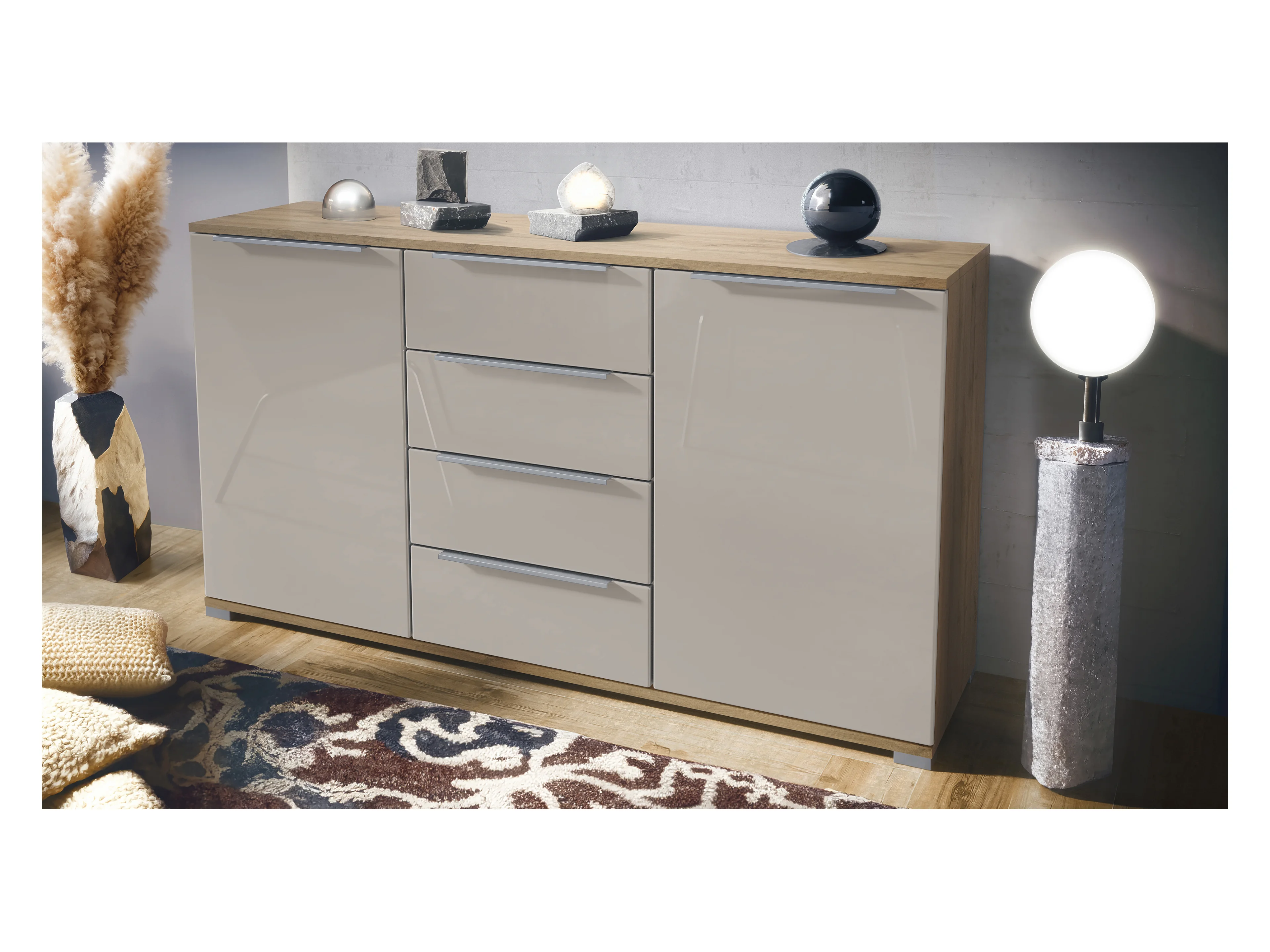 Buffet Linio V1, Enfilade avec 2 portes et 4 tiroirs, Chêne Evoke / gris sable haute brillance (138,5 x 75,5 x 35 cm)