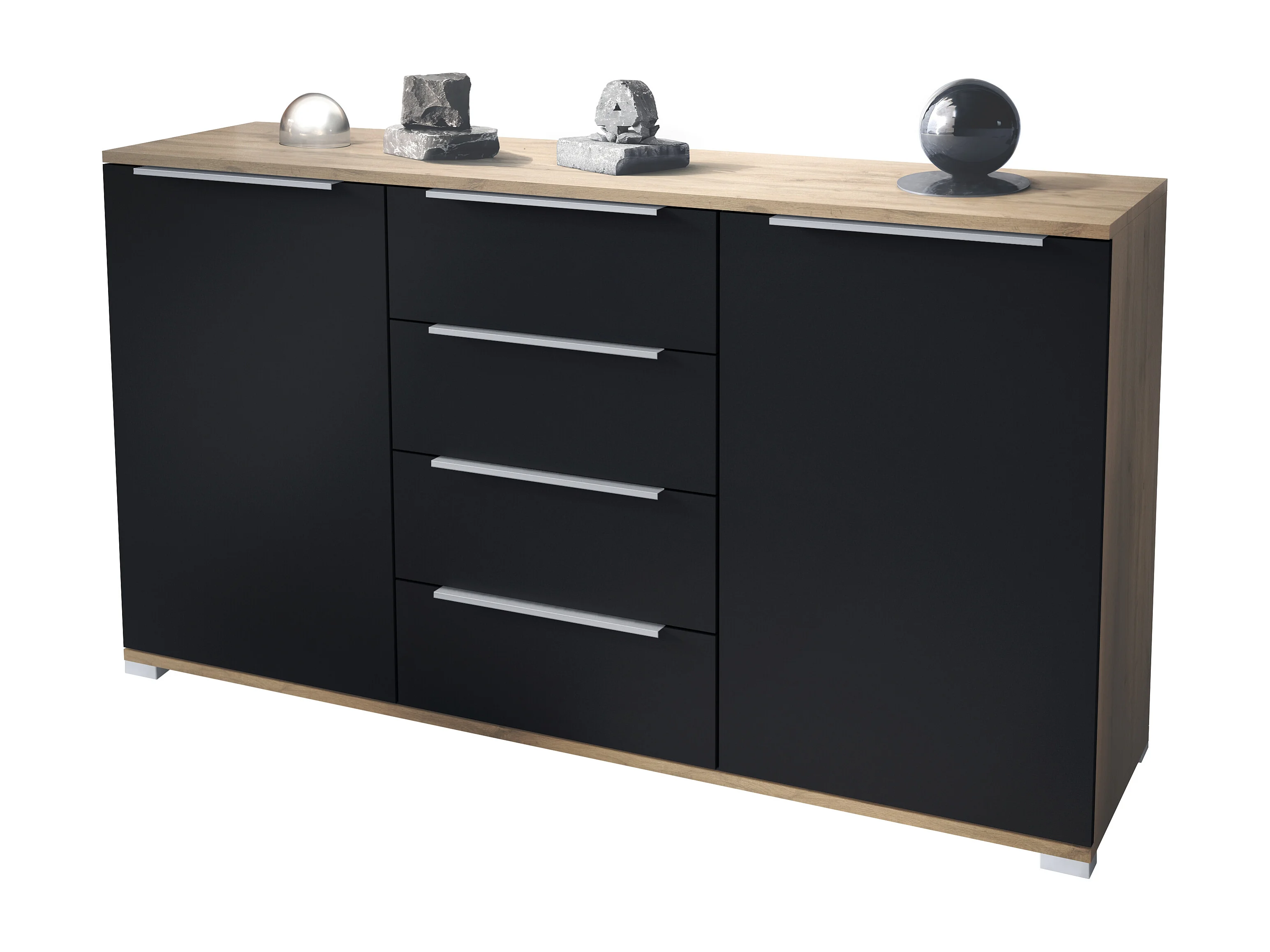 Buffet Linio V1, Enfilade avec 2 portes et 4 tiroirs, Chêne Evoke / noir mat (138,5 x 75,5 x 35 cm)