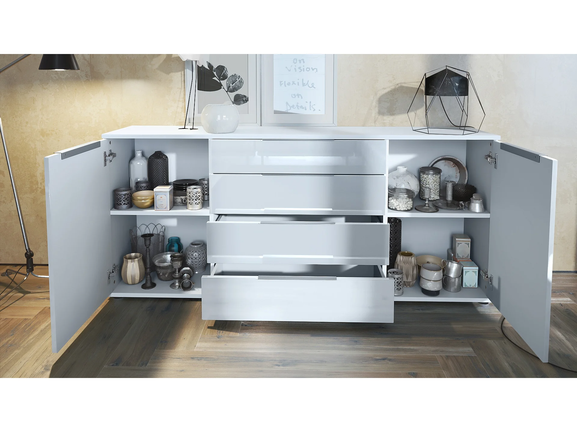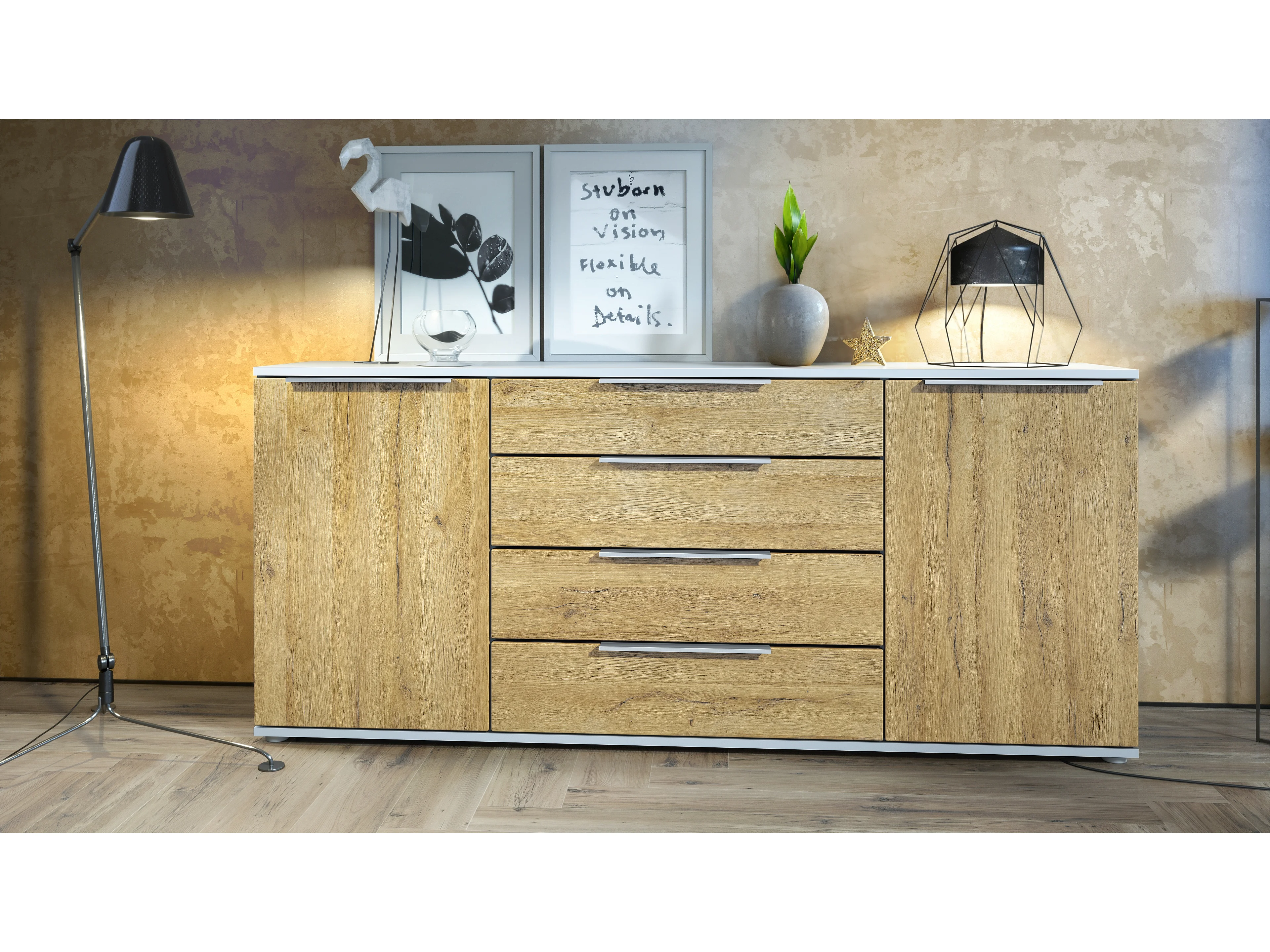 Buffet Linio V2 – Commode moderne avec 2 portes et 4 tiroirs, blanc mat/chêne nature, 166,5 x 75,5 x 35 cm (L x H x P) – Meuble de rangement bahut