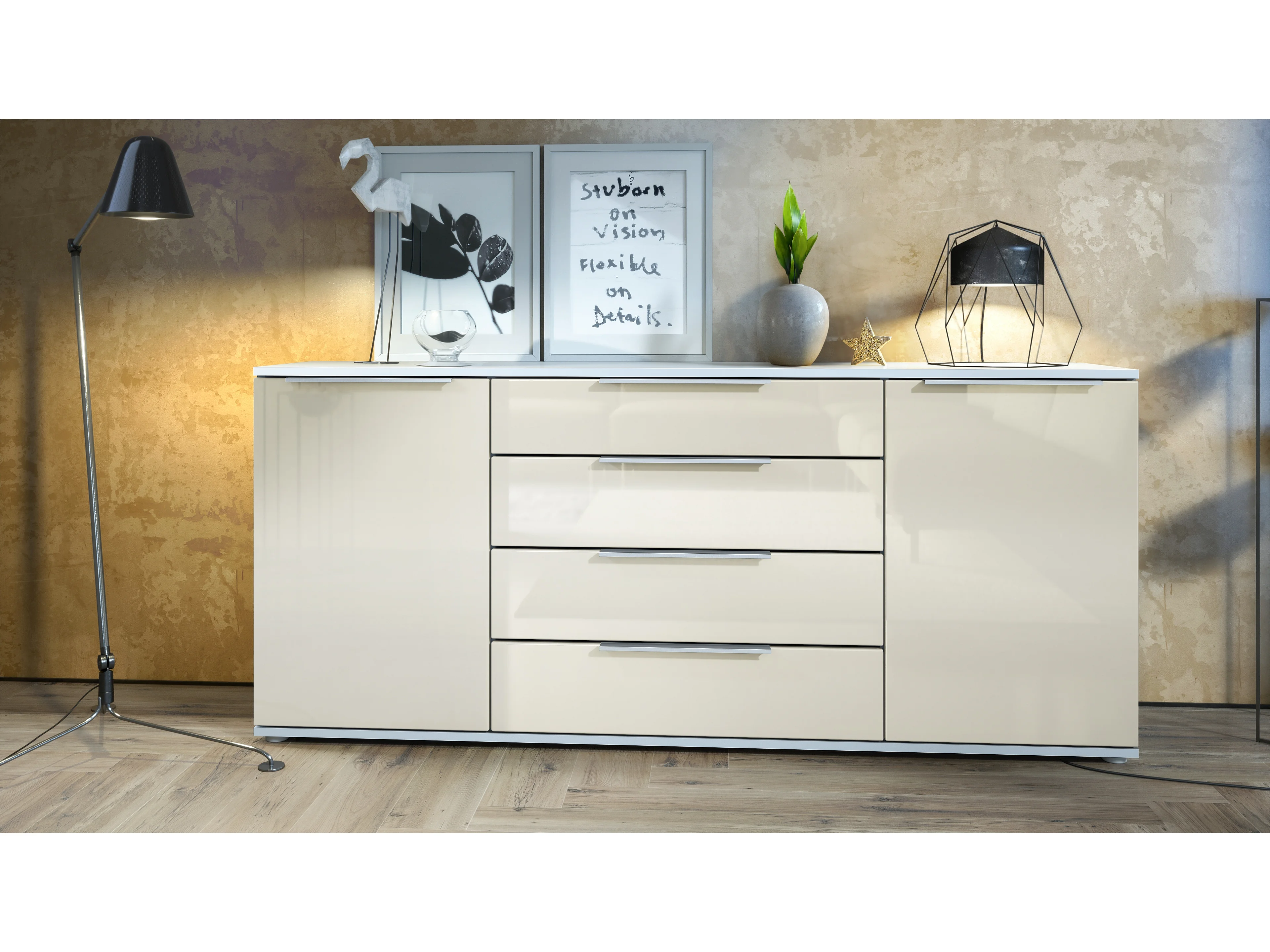 Buffet Linio V2 – Commode moderne avec 2 portes et 4 tiroirs, blanc mat/crème haute brillance, 166,5 x 75,5 x 35 cm (L x H x P) – Meuble de rangement bahut