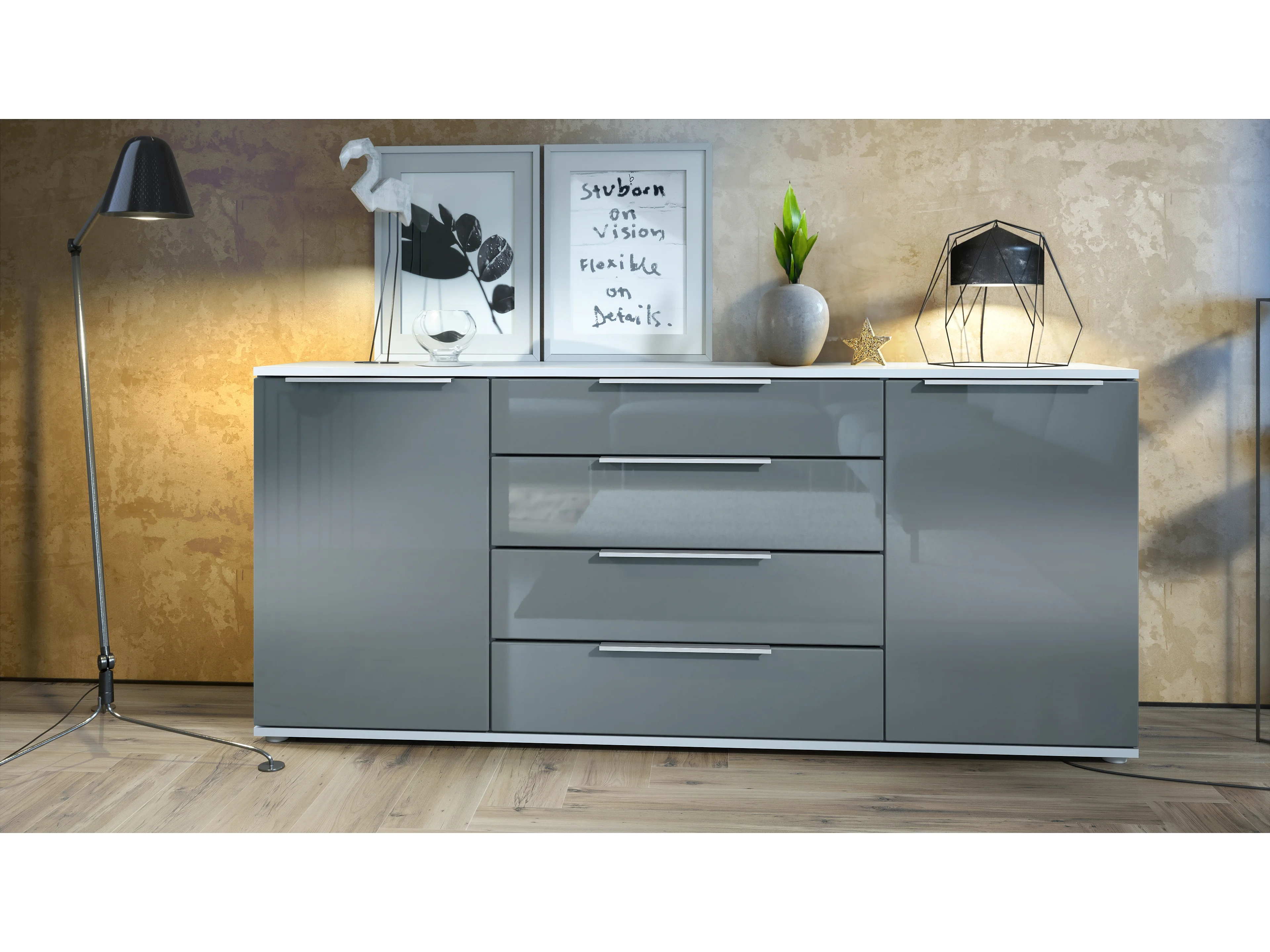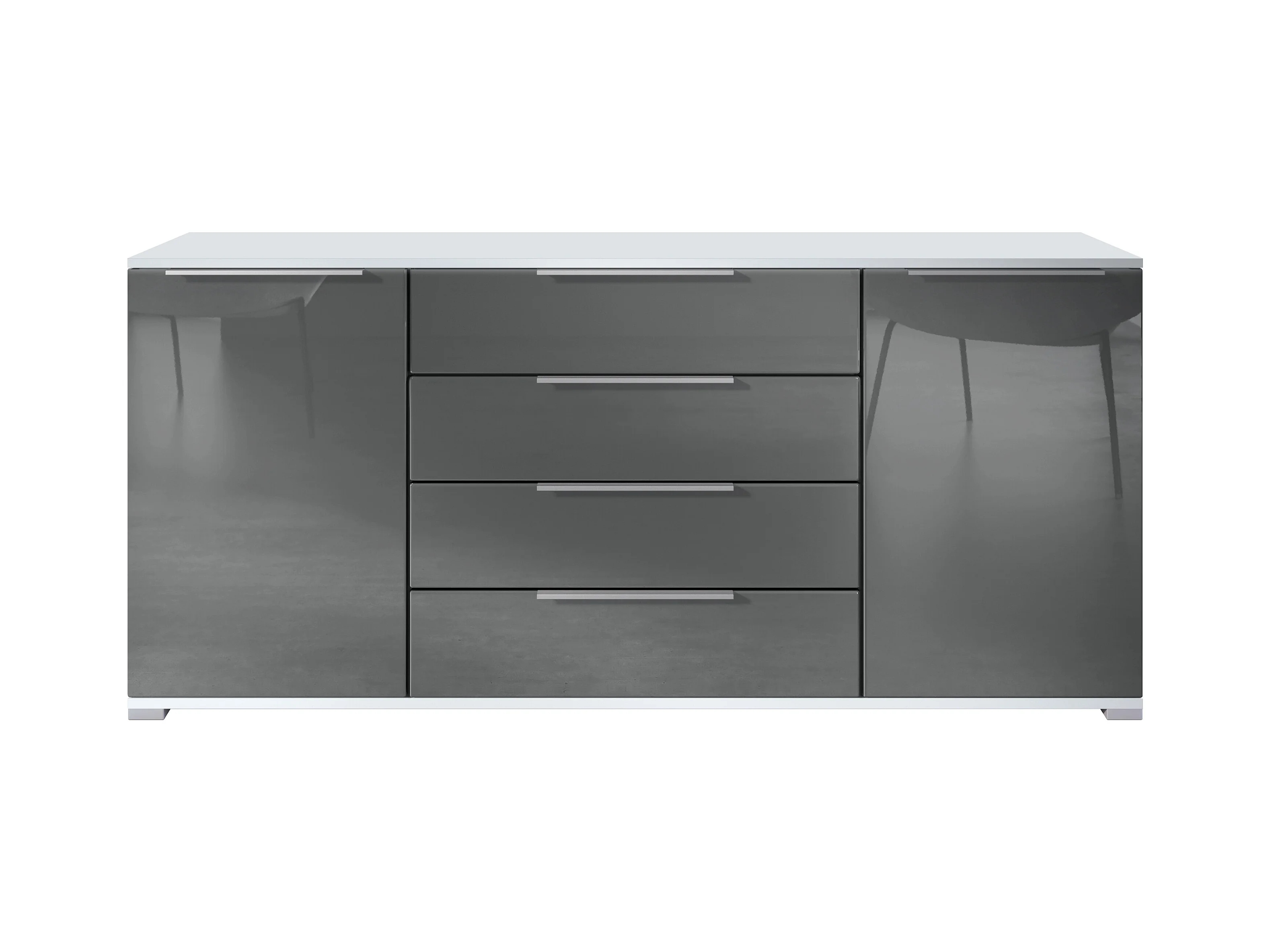 Buffet Linio V2 – Commode moderne avec 2 portes et 4 tiroirs, blanc mat/gris haute brillance, 166,5 x 75,5 x 35 cm (L x H x P) – Meuble de rangement bahut