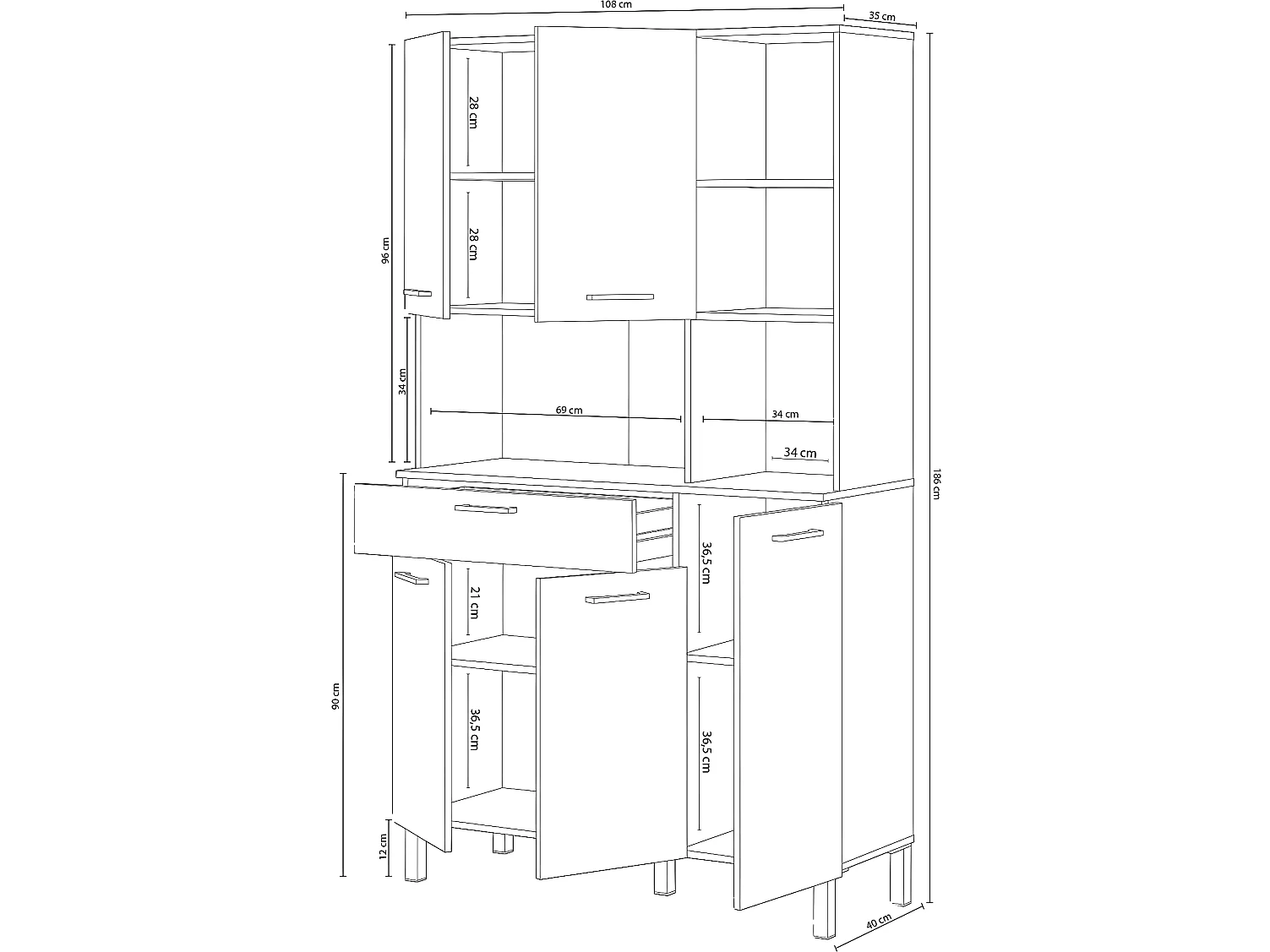 Buffet meuble cuisine 5 portes + 1 tiroir coloris blanc artic/chêne canadien - Hauteur 186 cm x Longueur 108 cm x Profondeur 40 cm