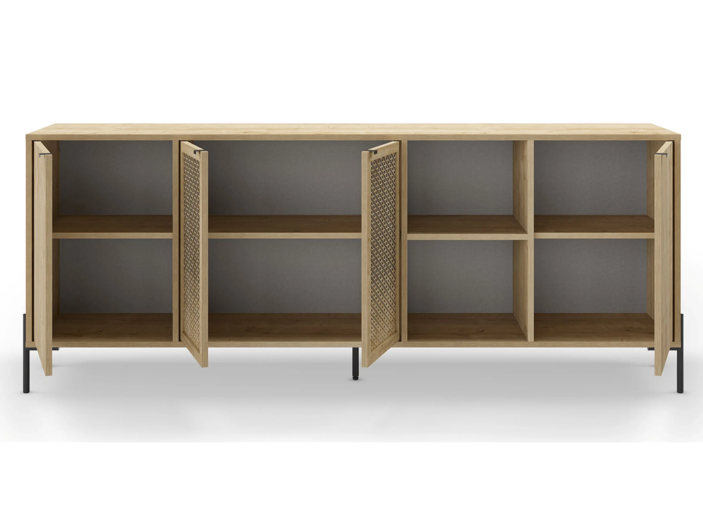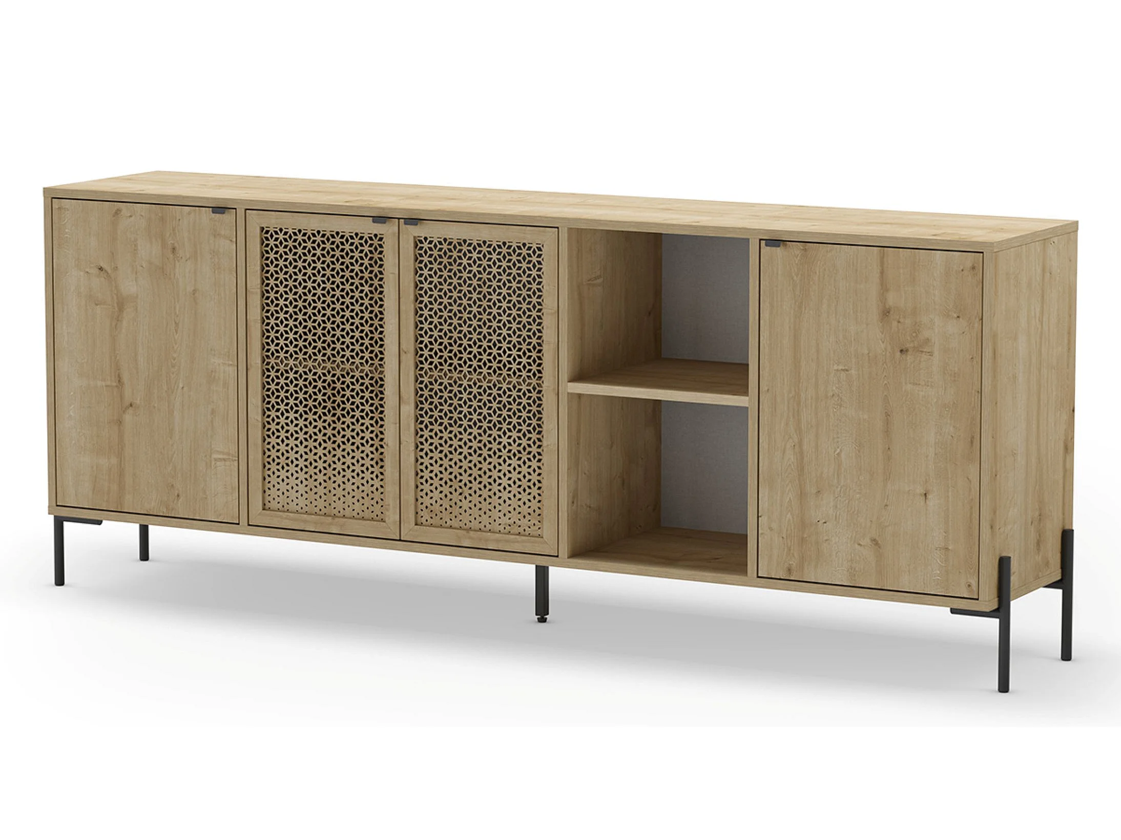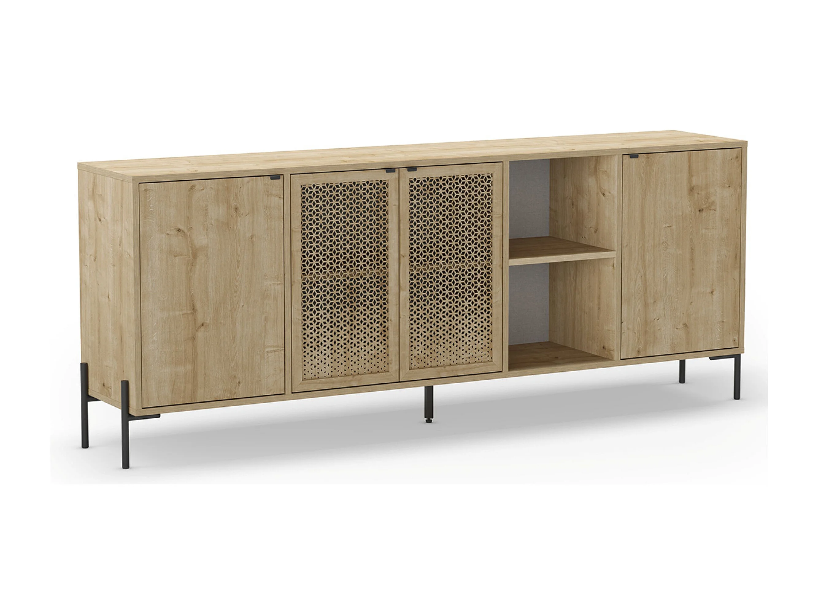 Buffet, meuble de rangement aspect bois coloris chêne, pieds en métal noir - Longueur 203,80 x Profondeur 40 x Hauteur 80,30 cm
