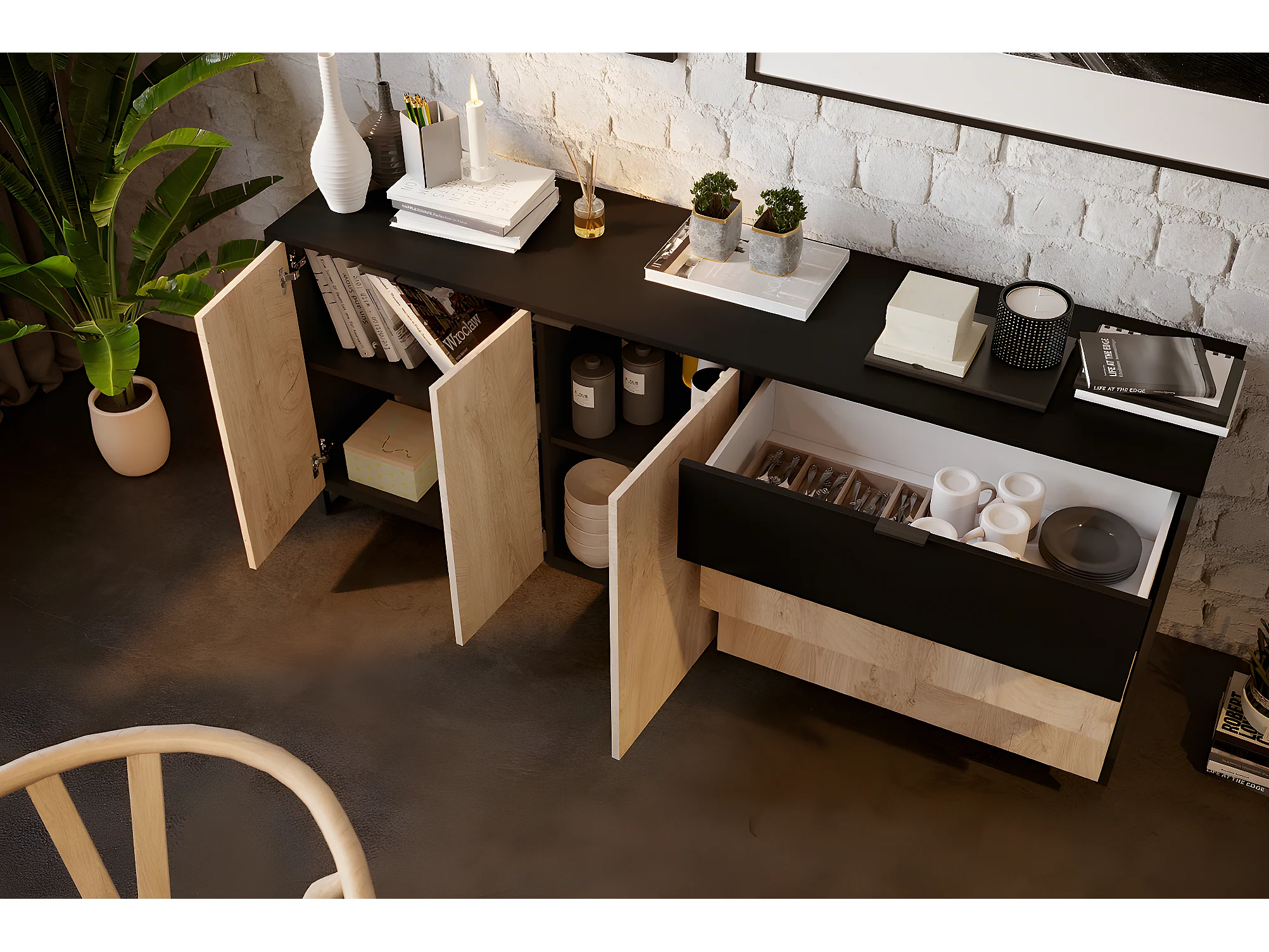 Buffet Meuble de rangement en mélamine coloris chêne et noir - Longueur 180 x profondeur 44 x Hauteur 75 cm