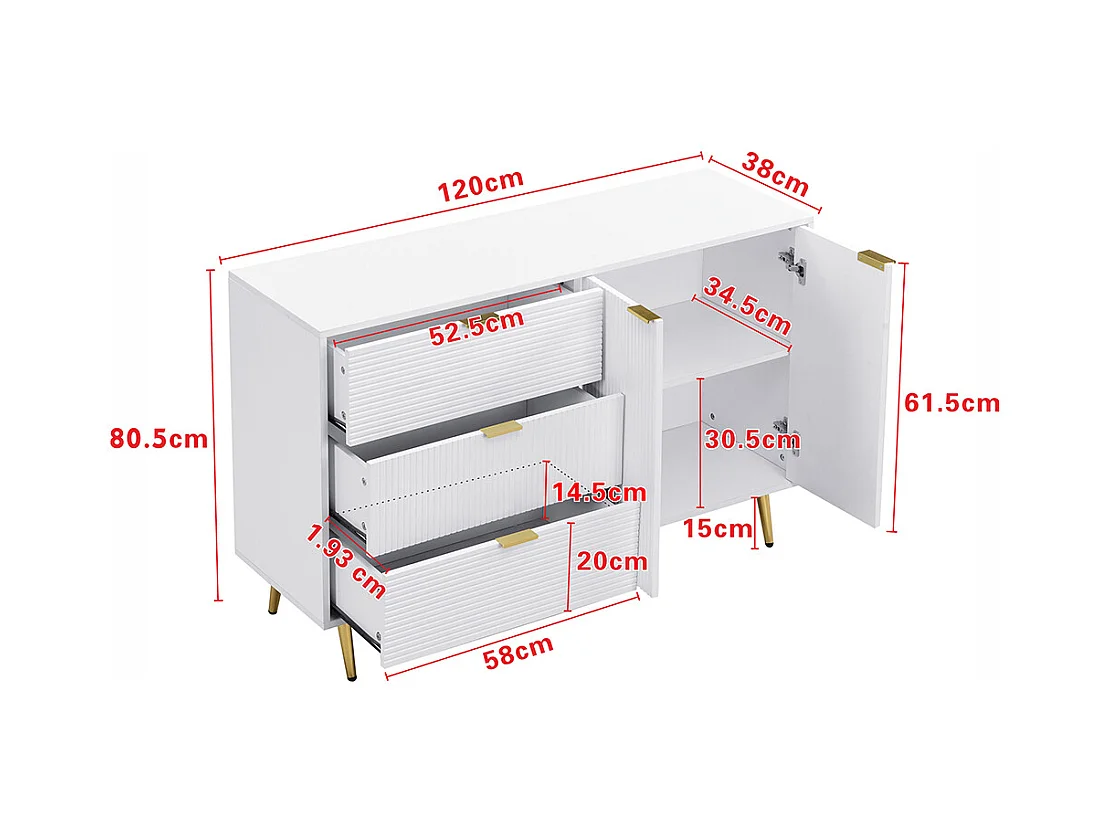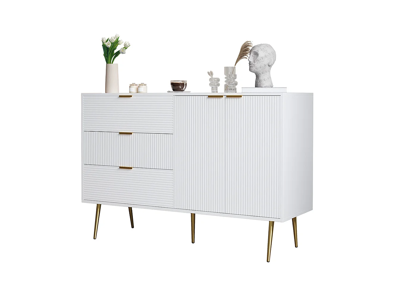 Buffet meuble de salon avec portes et tiroirs étagères intérieures commode avec poignées et pieds dorés Blanc