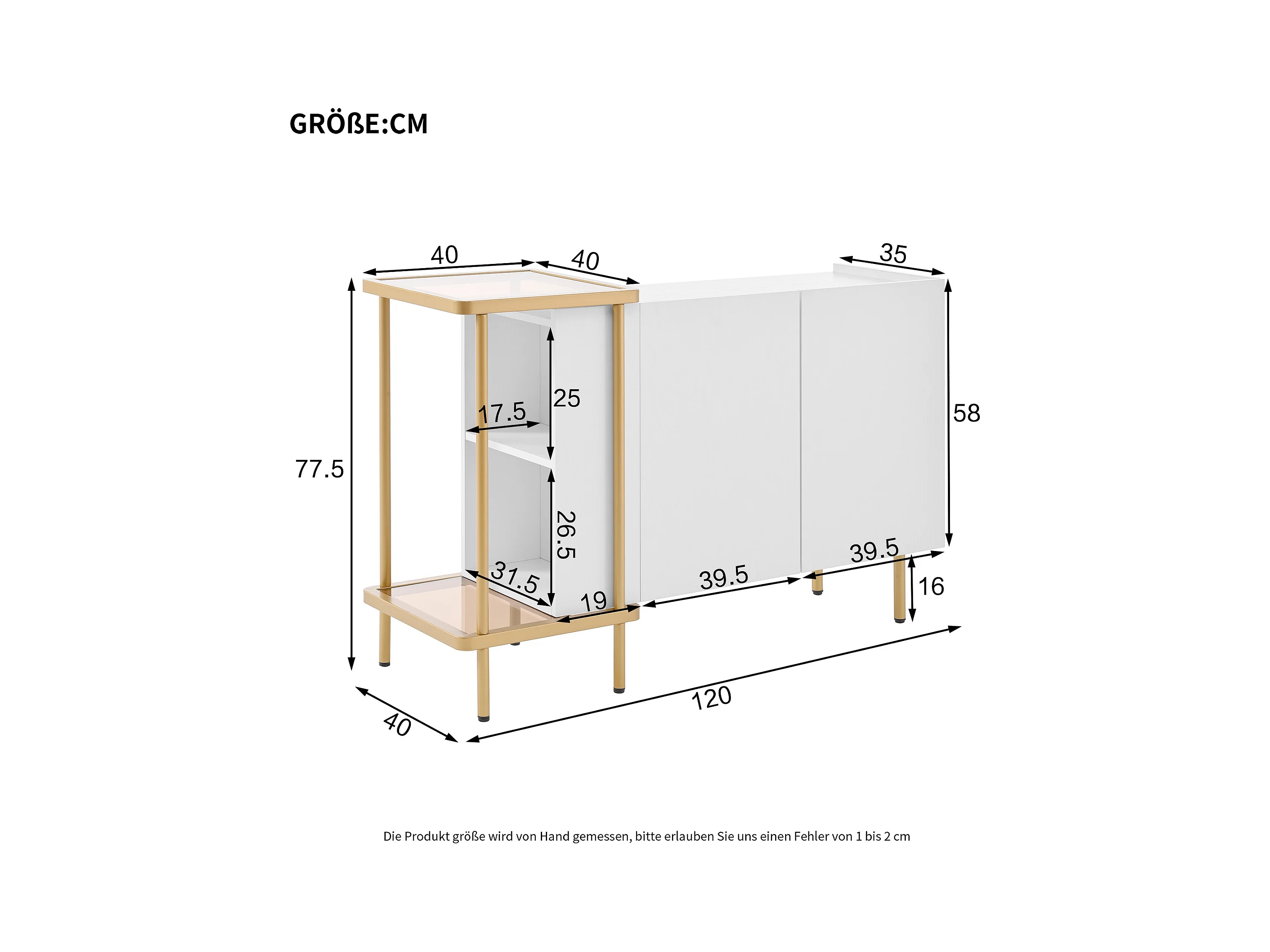 Buffet moderne 120x40x77.5cm - avec 2 portes - 2 compartiments ouverts - pieds en métal - panneau de particules - Blanc