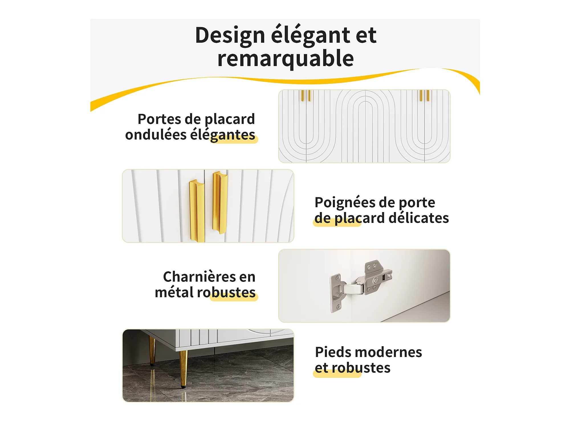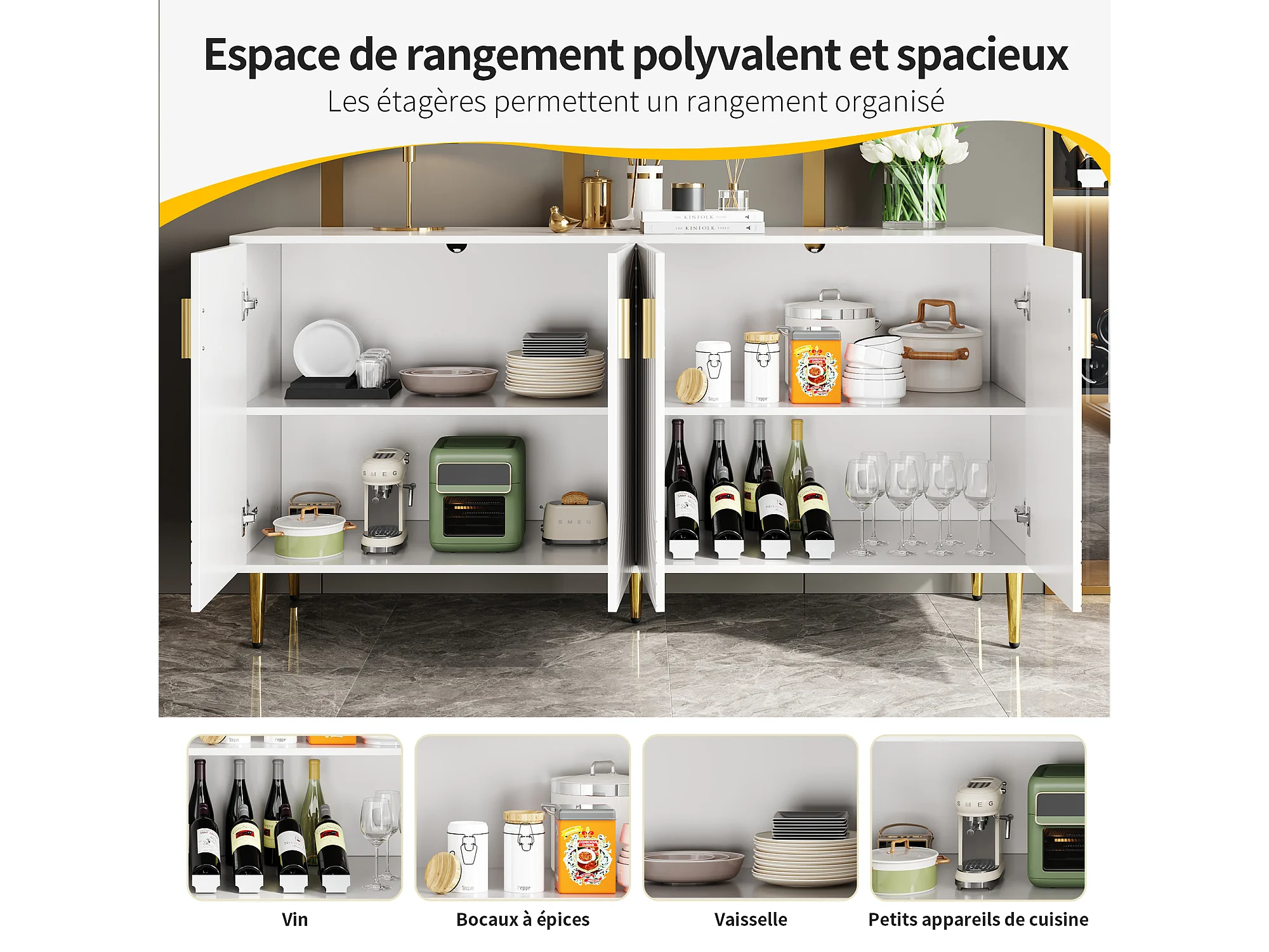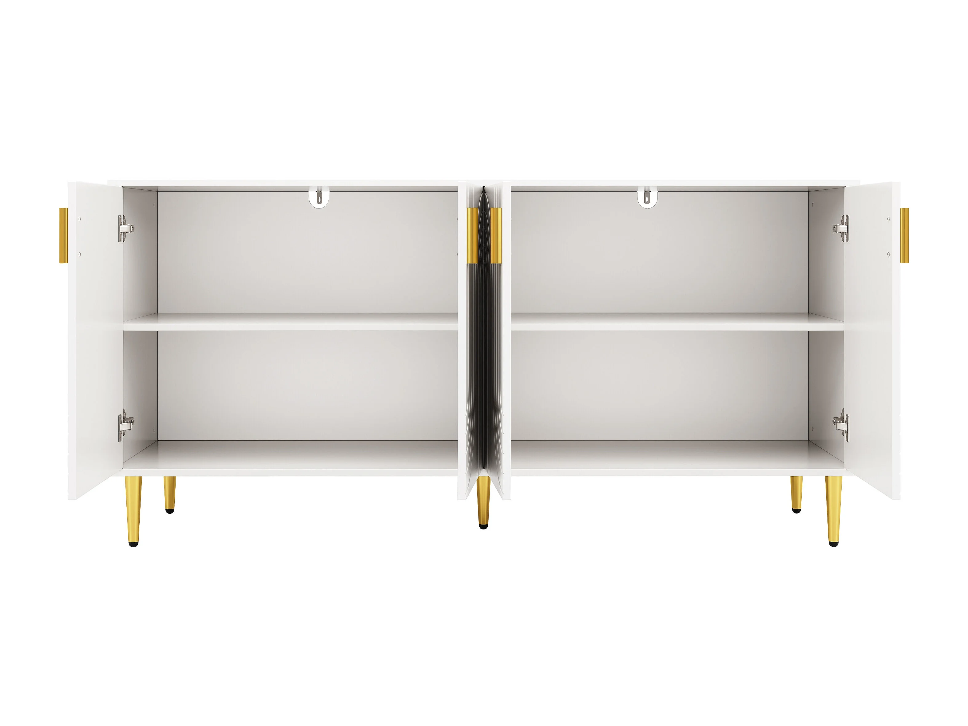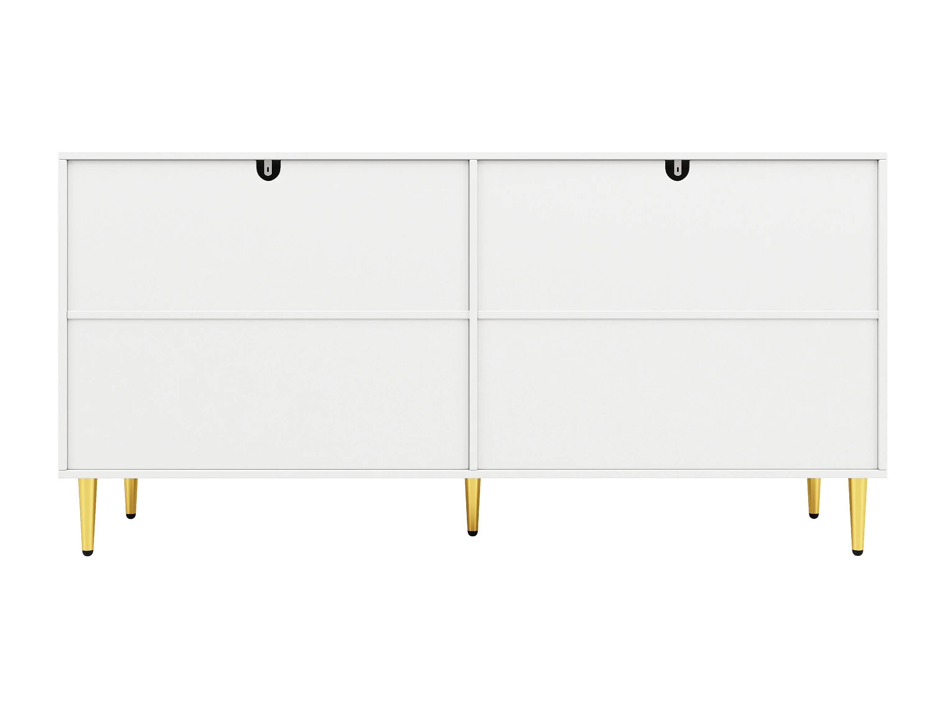 Buffet moderne avec 4 portes et 2 tiroirs, poignées et pieds dorés, 152 x 40 x 75 cm, Blanc