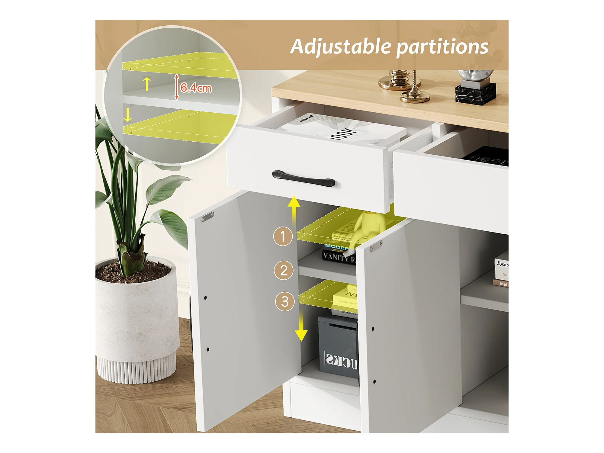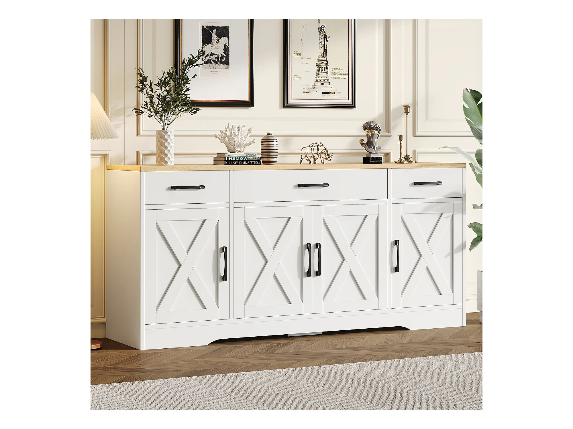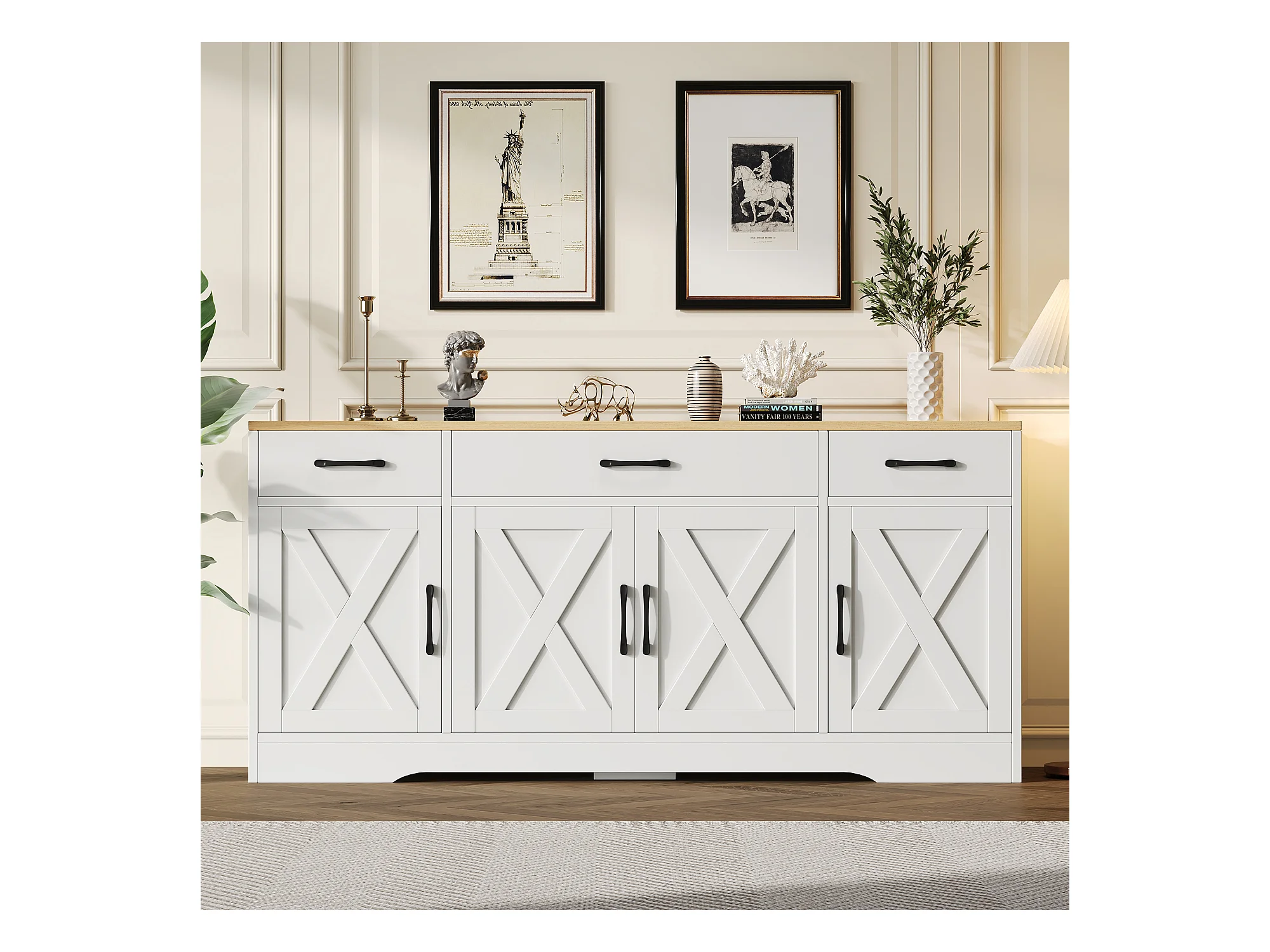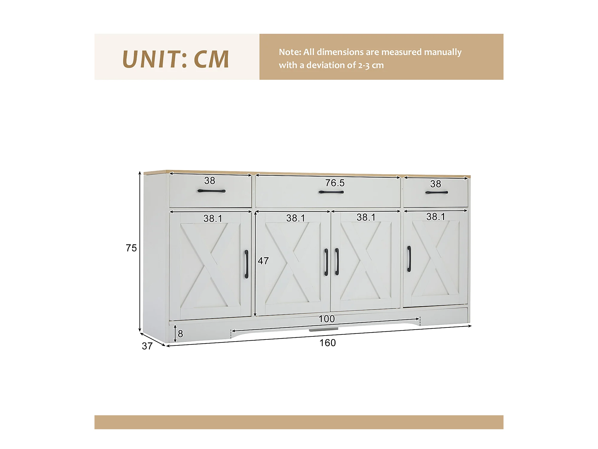 Buffet moderne avec 4 portes et 3 tiroirs - 160 x 37 x 75 cm - Bois MDF - Etagères réglables - Blanc et bois