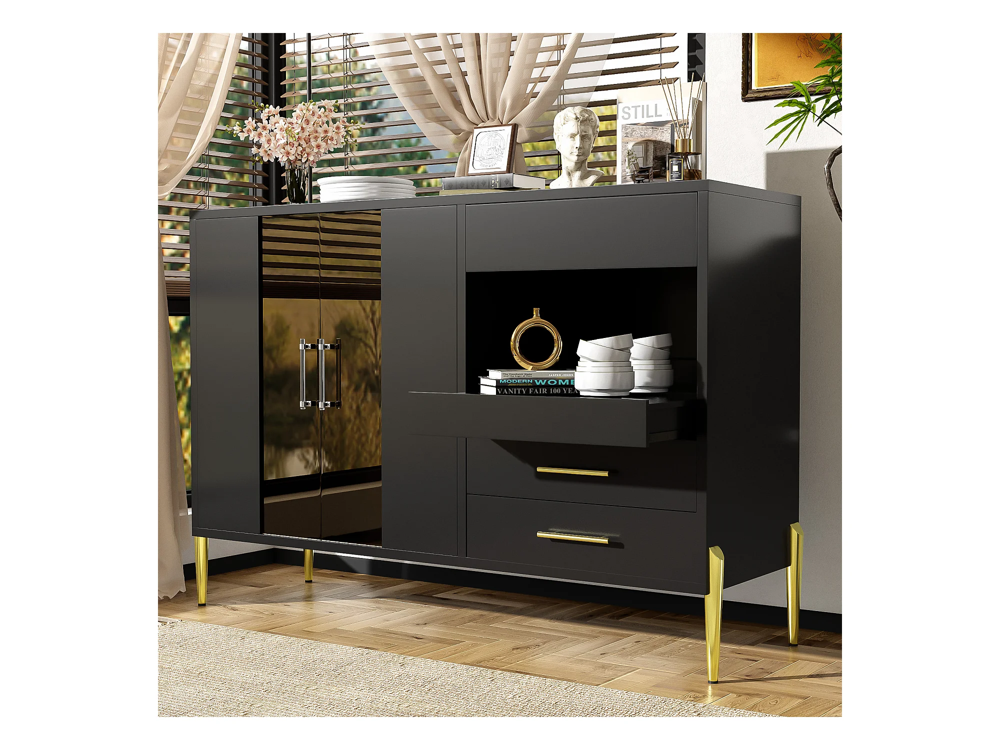 Buffet moderne avec portes en verre, 6 tiroirs, design noir et doré, MDF (120x39.5x84 cm)