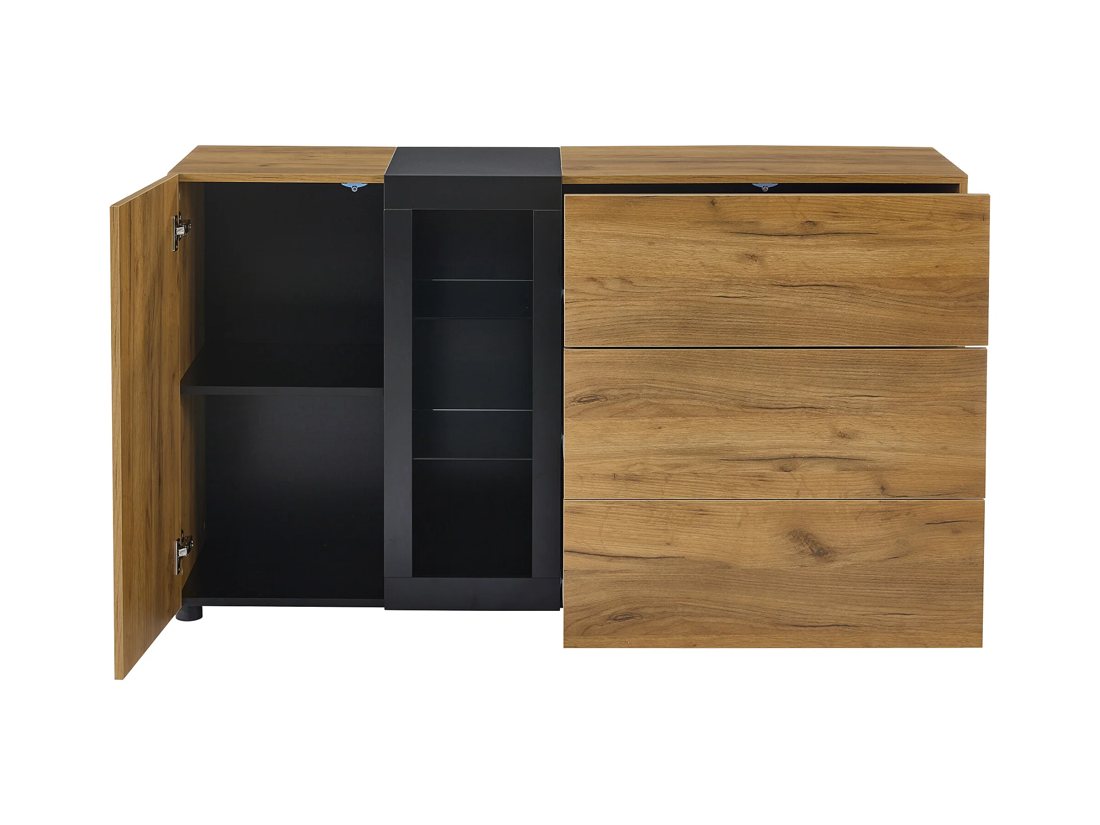 Buffet moderne, design minimaliste, MDF, noir et brun, avec 3 tiroirs et étagères en verre (140x40x80 cm)
